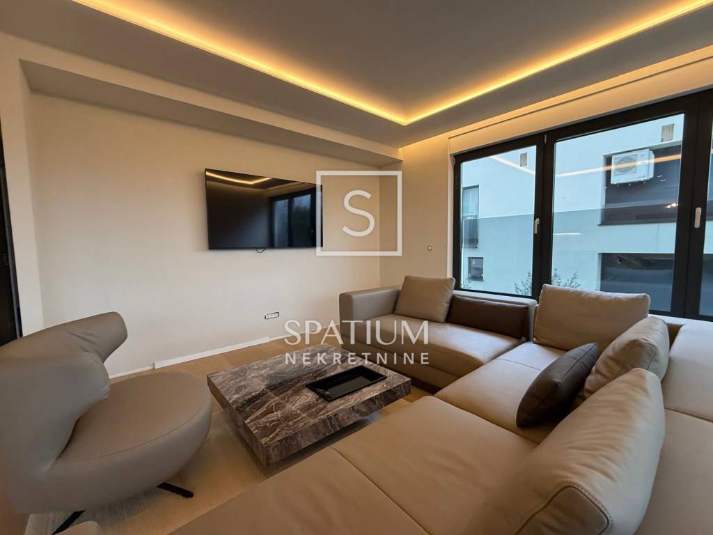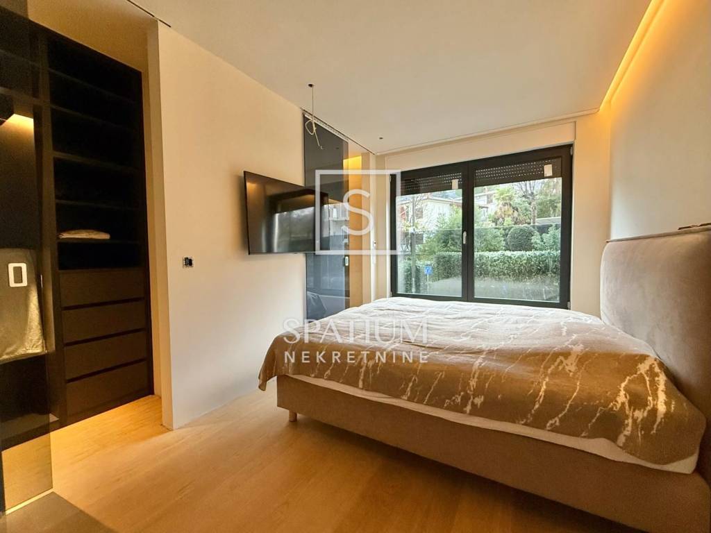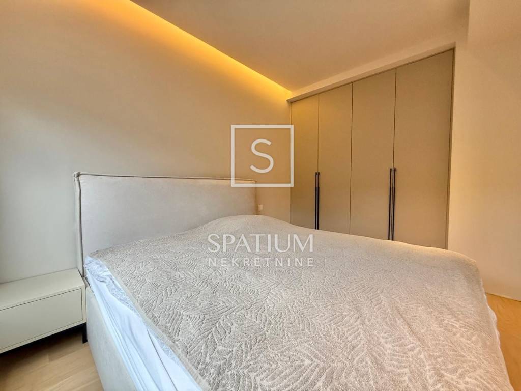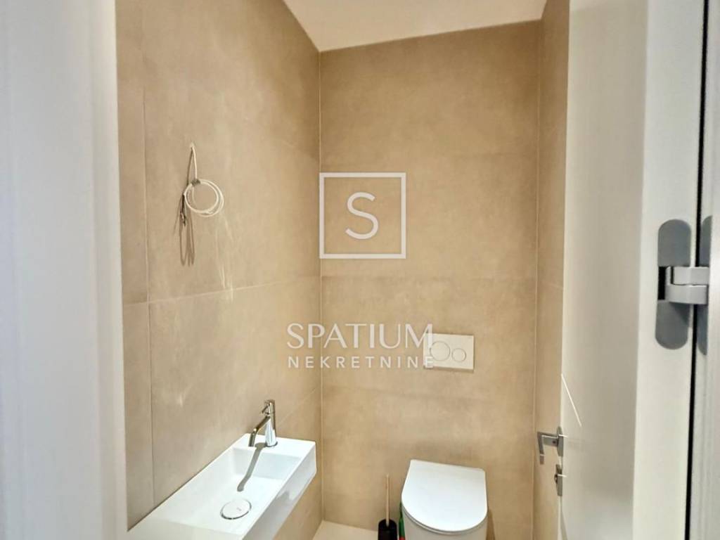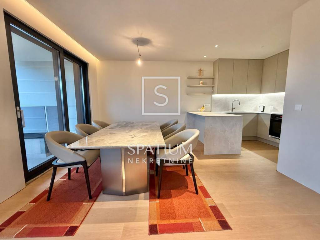 LOVRAN, u ponudi je moderan stan u novogradnji, površine 105 m2. Sastoji od otvorenog dnevnog boravka s kuhinjom i blagovaonom, dvije spavaće sobe, kupaonice, toaleta, "master spavaće sobe" s pripadajućom garderobom i kupaonicom, vešeraja i hodnika. Iz dnevnog djela izlazi se na prostrani osunčani balkon. Stan je opremljen vrhunskim namještajem i dosad nije bio useljen. Uz stan dolazi i natkriveno parkirno mjesto ispred zgrade, kao i spremište u podrumu.