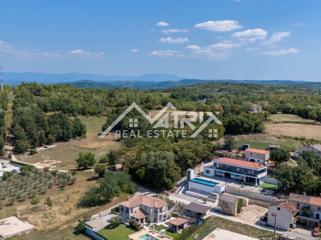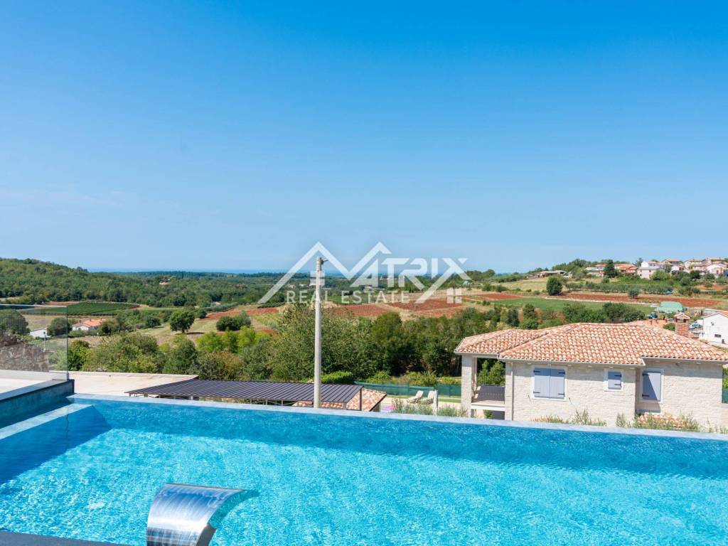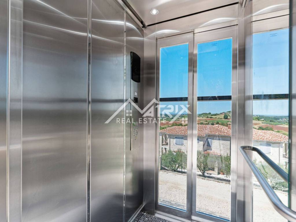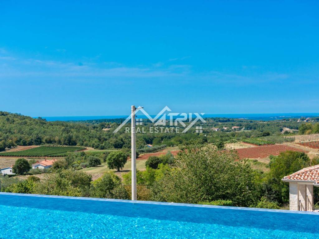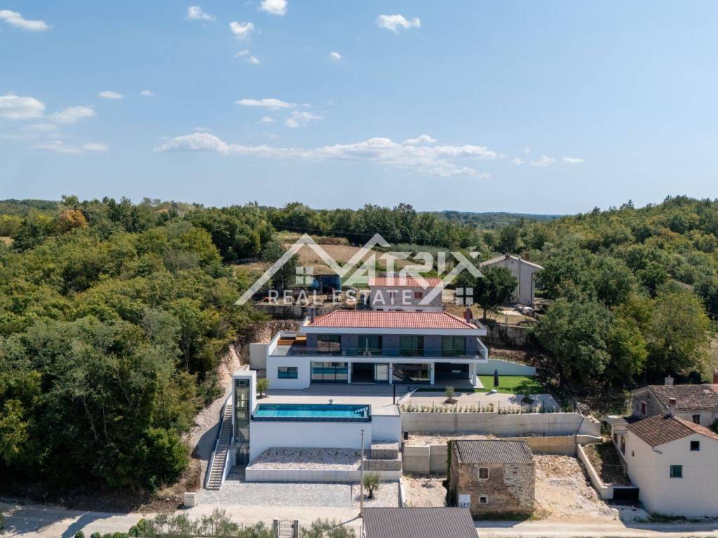 Ova jedinstvena vila doista je jedinstvena, s prekrasnim otvorenim pogledom na slikoviti istarski krajolik i pjenušavo more. Izgrađena na brežuljku u mirnom istarskom selu udaljenom samo 19 km od obale, ova nekretnina pruža savršenu kombinaciju osame i blizine plaže.