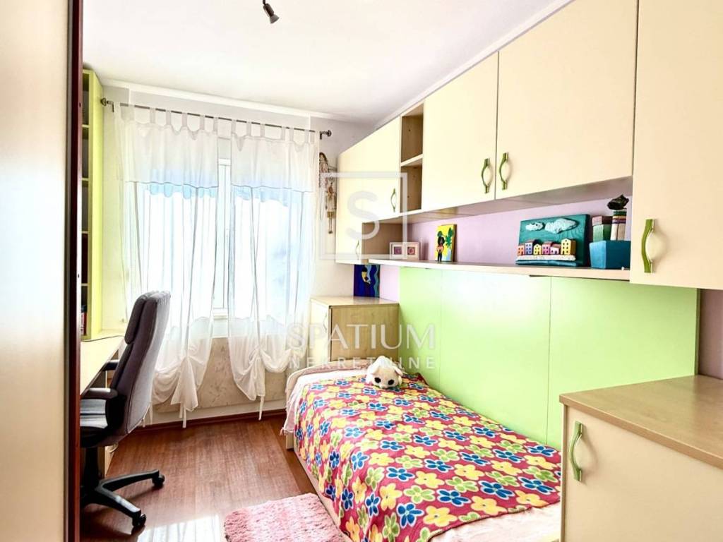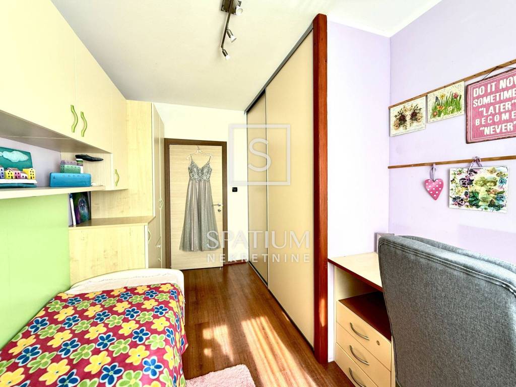 Stan se nalazi na nižem katu uredne zgrade s novom fasadom, PVC stolarijom i dva lifta, što osigurava visoku razinu komfora. Sastoji se od ulaznog hodnika, dječje ili radne spavaće sobe (ovisno o potrebama najmoprimca), glavne spavaće sobe, prostranog dnevnog boravka, kupaonice s nišom, te kuhinje i blagovaonice.