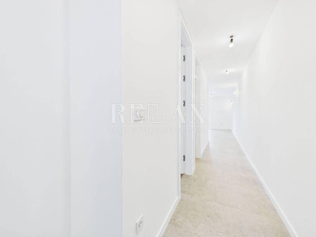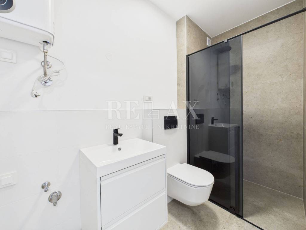 Pri gradnji su korišteni visokokvalitetni materijali: termo blok i termo fasada, keramika i sanitarije prve klase, PVC stolarija s električnim roletama te walk-in tuš sa staklenom kabinom i podnom kanalicom. Stan je opremljen podnim grijanjem na struju i klima uređajima u svakoj prostoriji, uz mogućnost Wi-Fi upravljanja.
