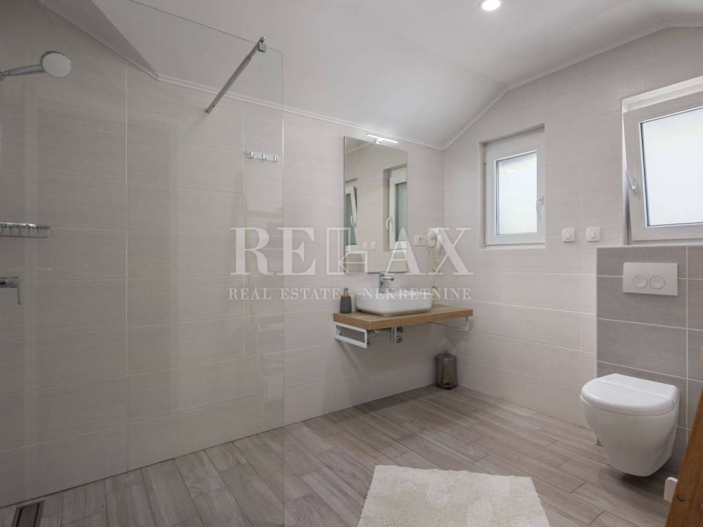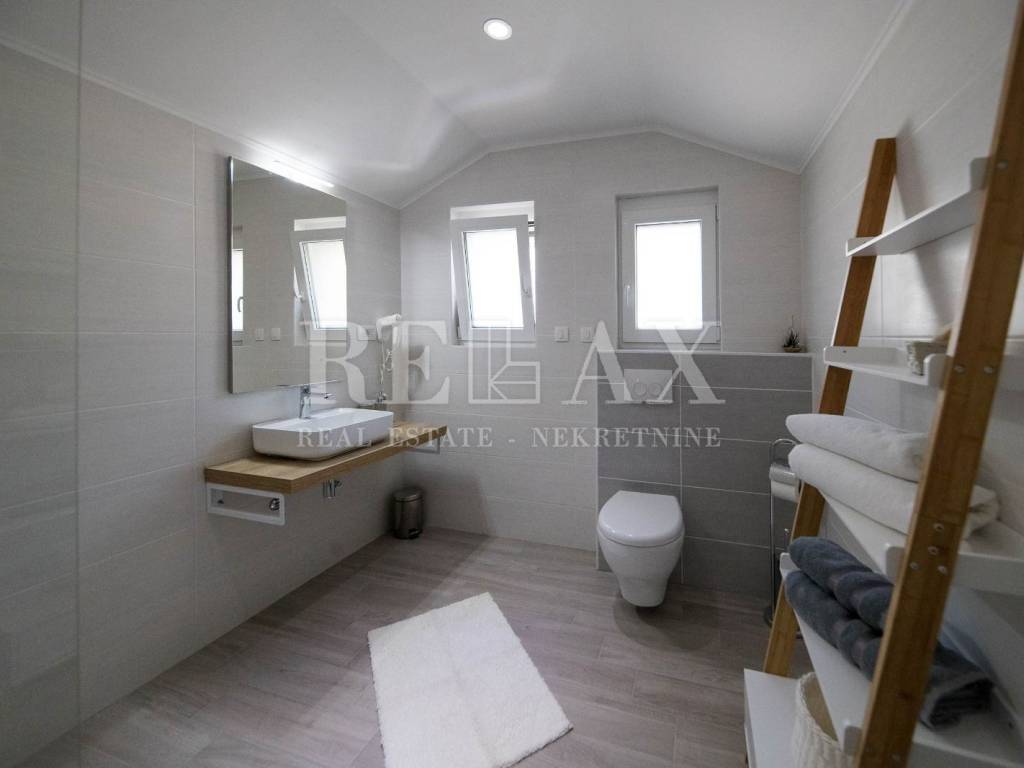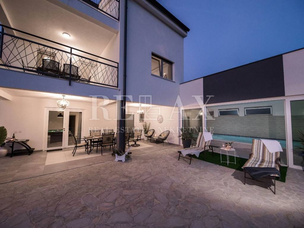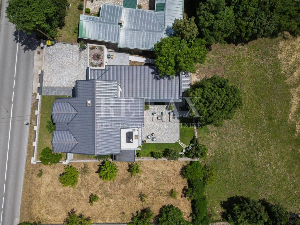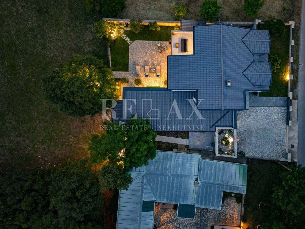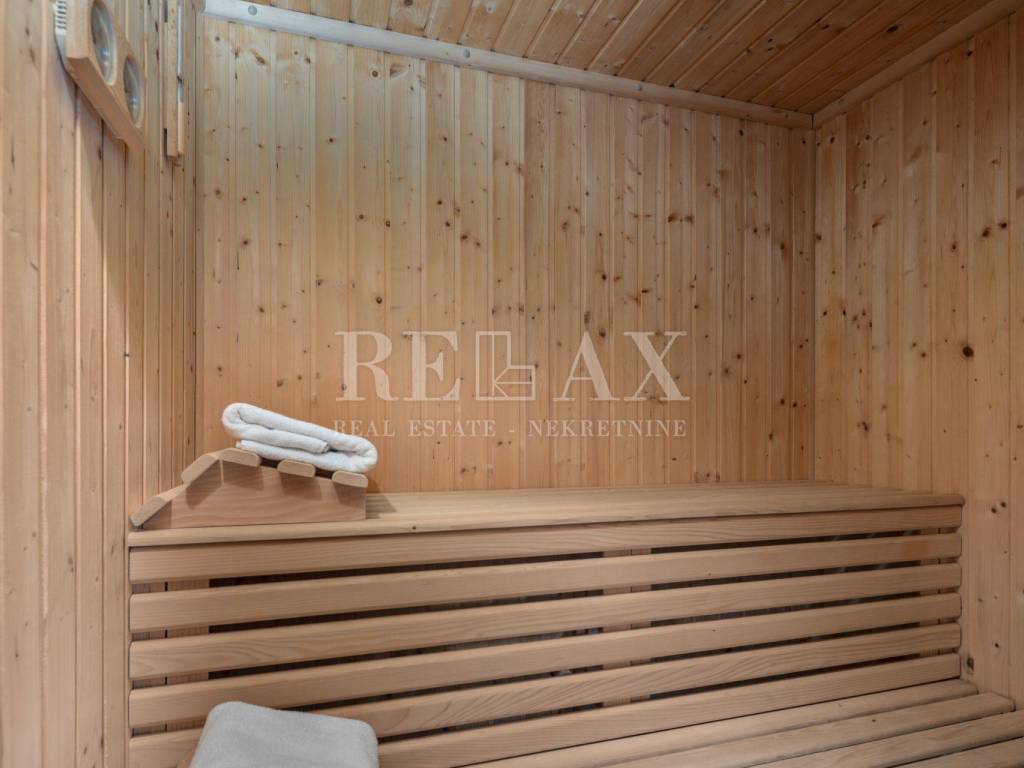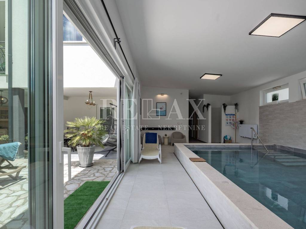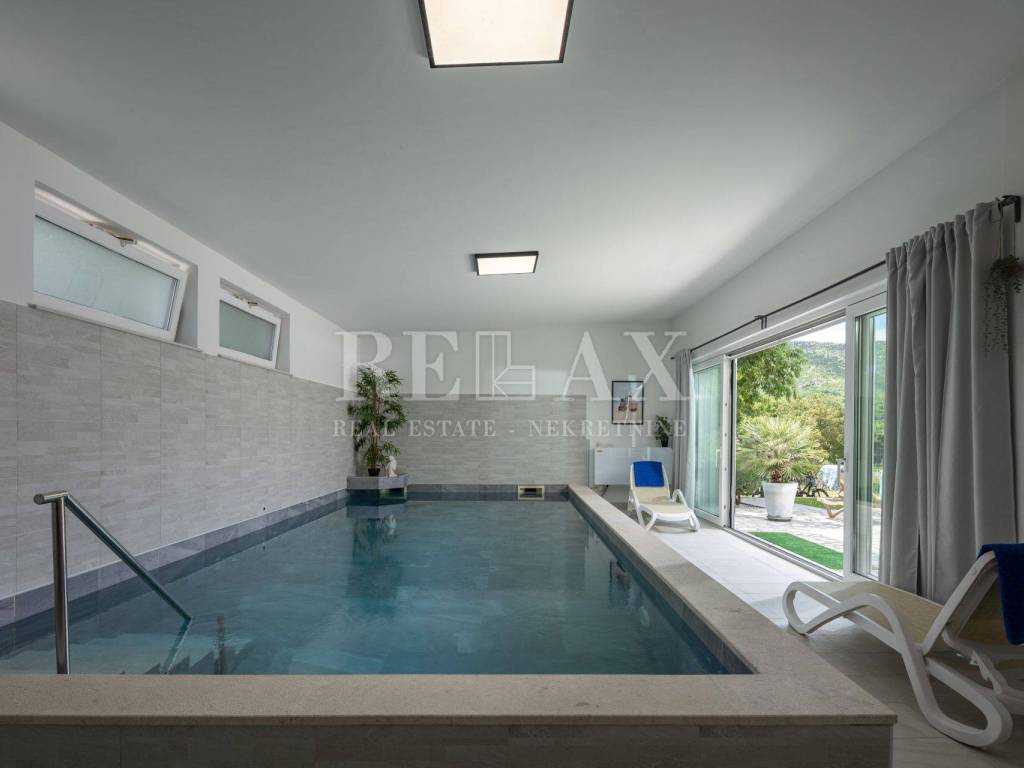 Vila se prostire na više etaža i sastoji se od četiri prostrane spavaće sobe, svaka sa svojom kupaonicom, dodatna dva WC-a, moderno opremljene kuhinje s blagovaonicom te velikog dnevnog boravka. Nekretnina uključuje i dva balkona, prostranu terasu, igraonicu, saunu te unutarnji grijani bazen površine 32 m² s dubinom od 135 cm. Bazen se nalazi u suterenu i opremljen je podnim grijanjem, grijanjem zidova te sustavom odvlaživanja zraka, što omogućuje korištenje tijekom cijele godine. U neposrednoj blizini bazena smještena je sauna i tuš, dok se iz igraonice s teretanom izlazi direktno u okućnicu s terasom, sunčalištem i roštiljem.