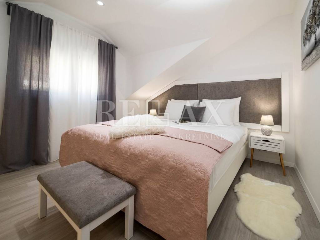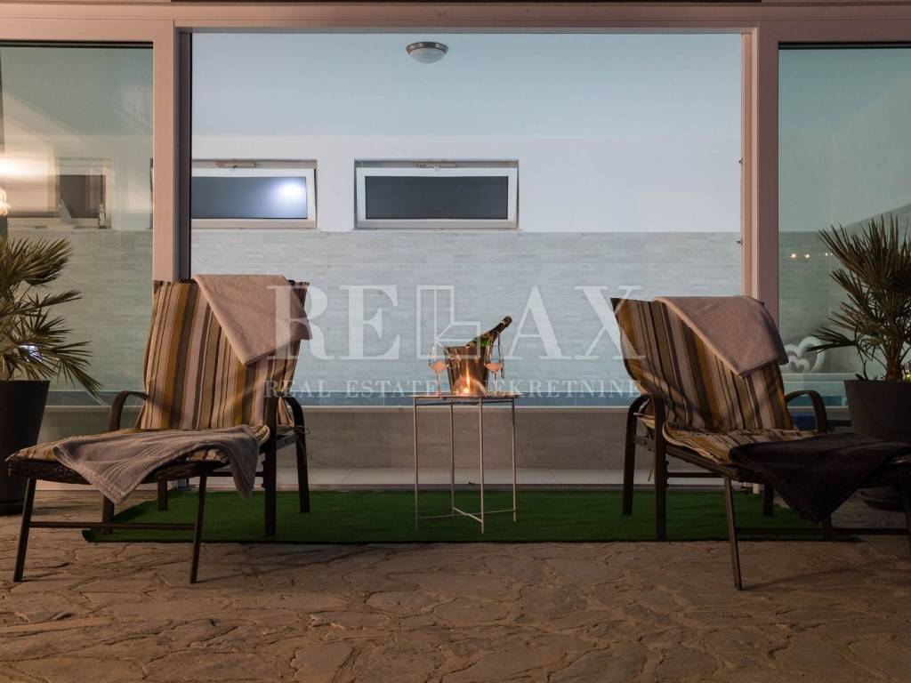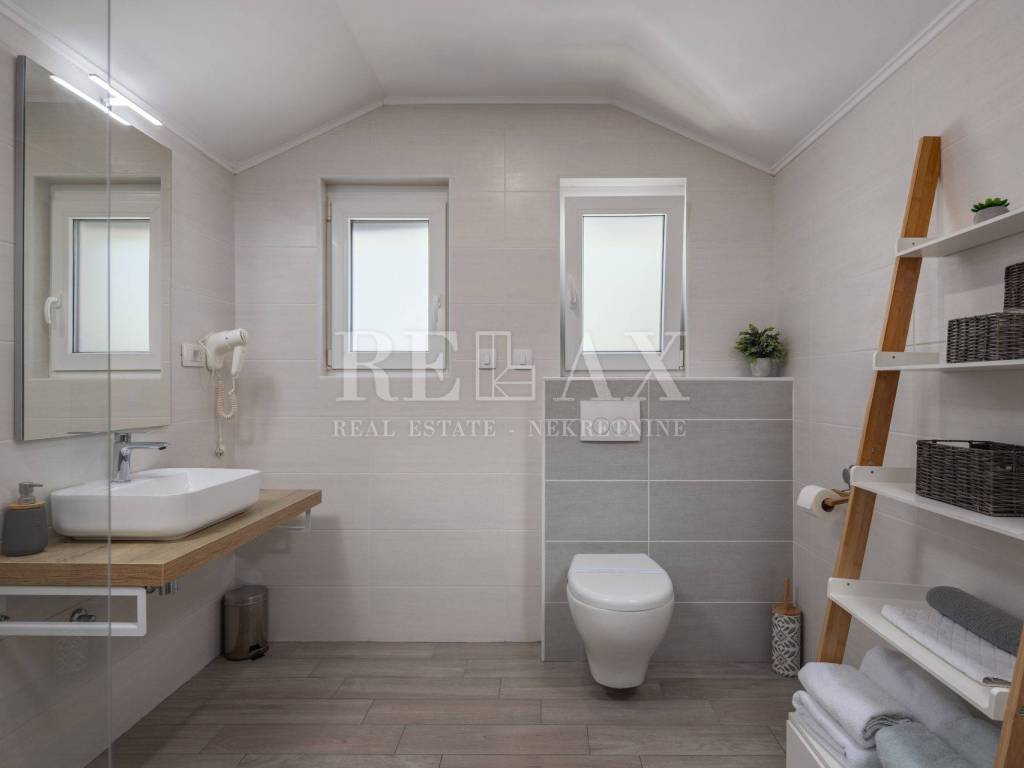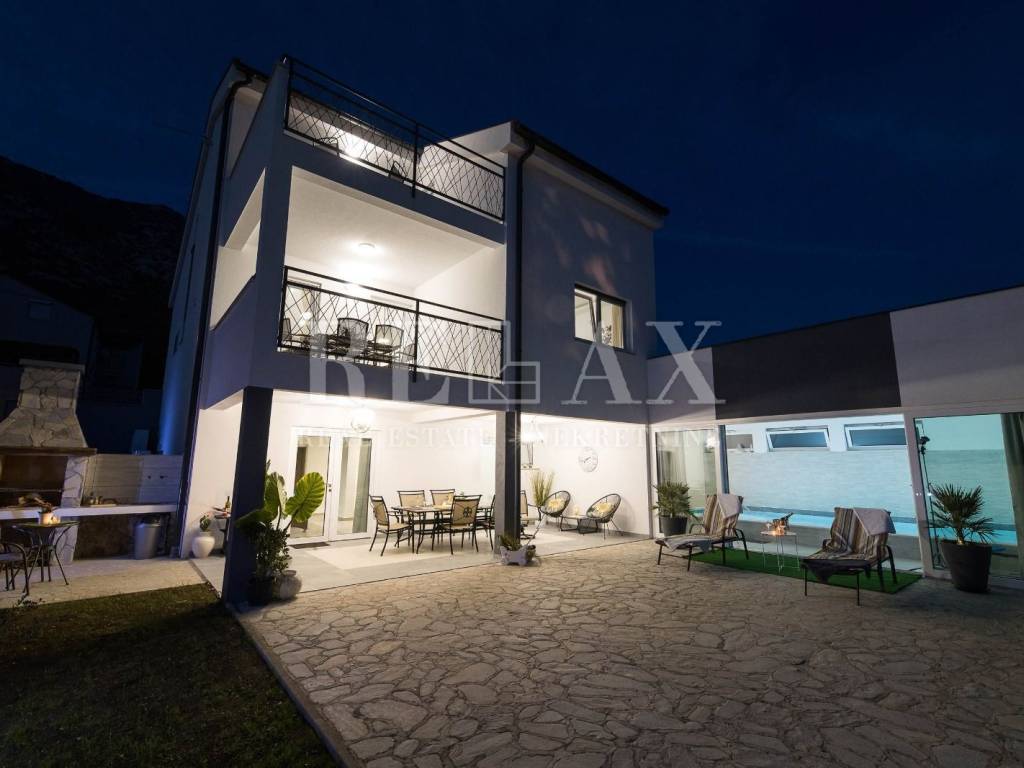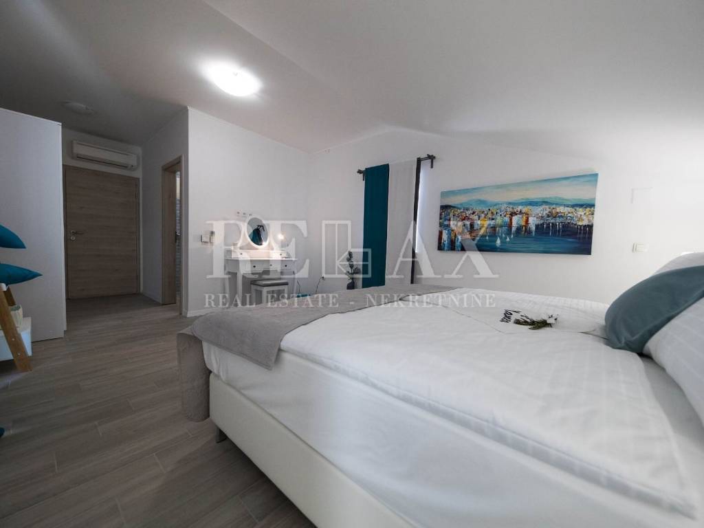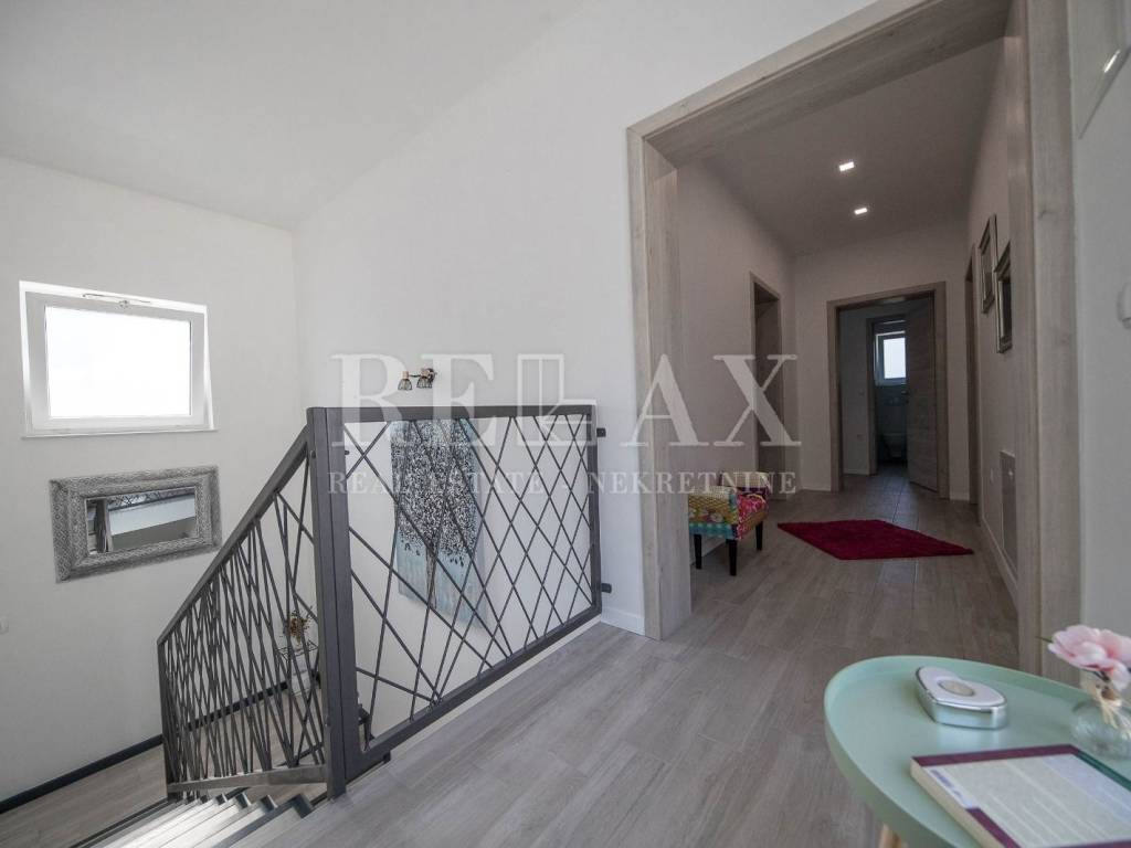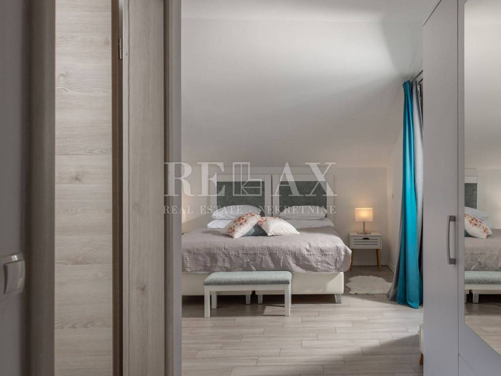 Vila se prostire na više etaža i sastoji se od četiri prostrane spavaće sobe, svaka sa svojom kupaonicom, dodatna dva WC-a, moderno opremljene kuhinje s blagovaonicom te velikog dnevnog boravka. Nekretnina uključuje i dva balkona, prostranu terasu, igraonicu, saunu te unutarnji grijani bazen površine 32 m² s dubinom od 135 cm. Bazen se nalazi u suterenu i opremljen je podnim grijanjem, grijanjem zidova te sustavom odvlaživanja zraka, što omogućuje korištenje tijekom cijele godine. U neposrednoj blizini bazena smještena je sauna i tuš, dok se iz igraonice s teretanom izlazi direktno u okućnicu s terasom, sunčalištem i roštiljem.