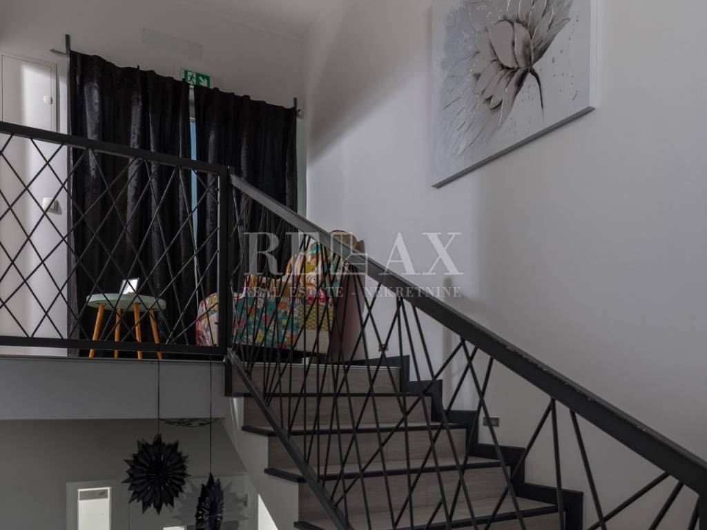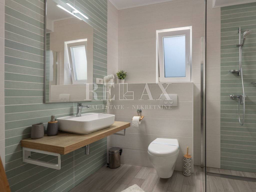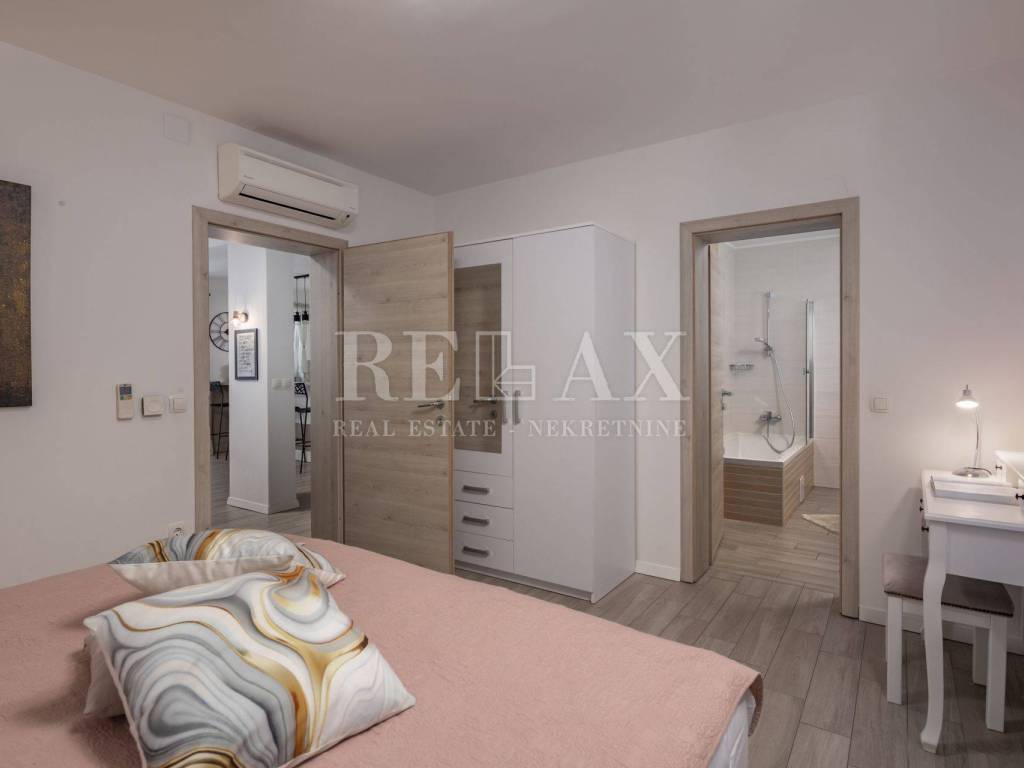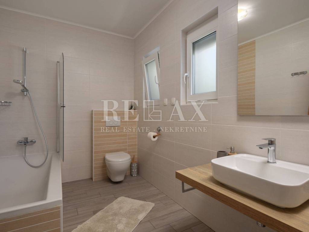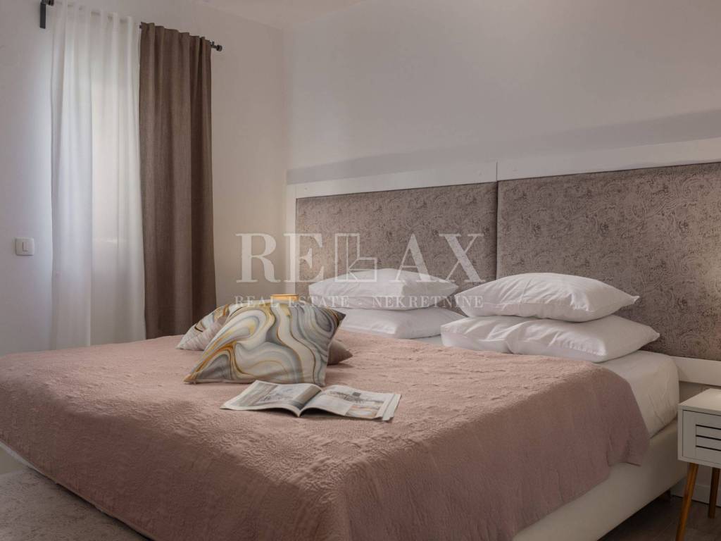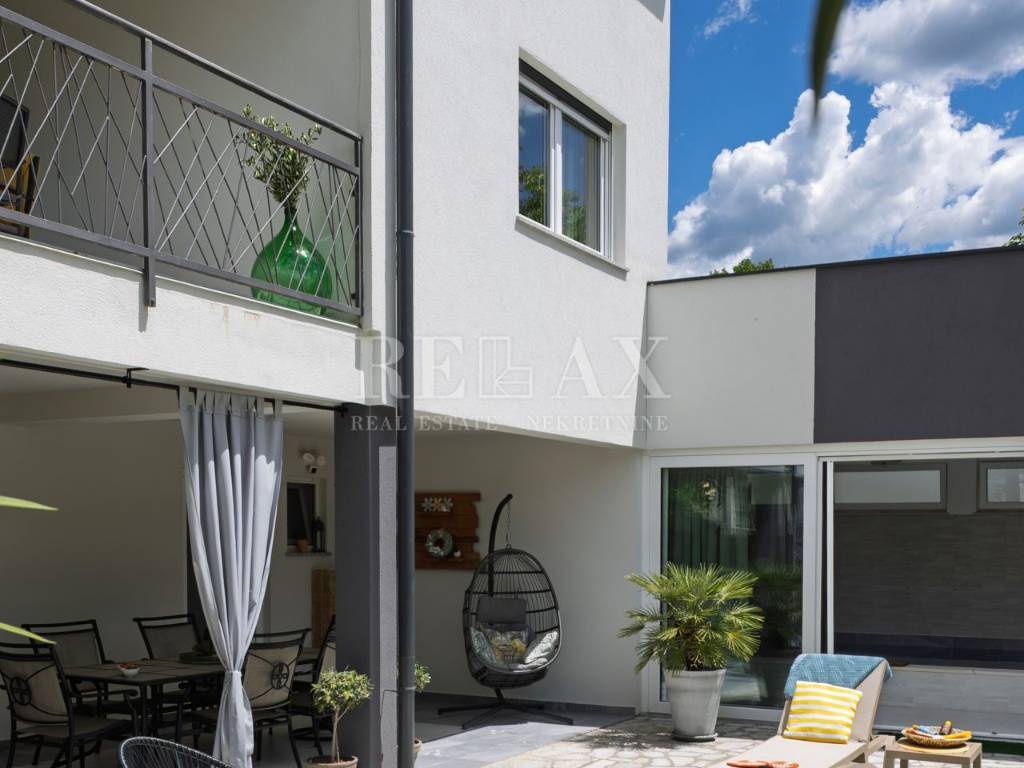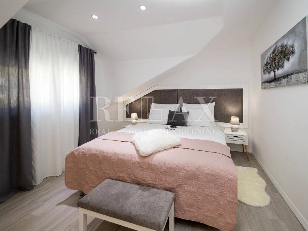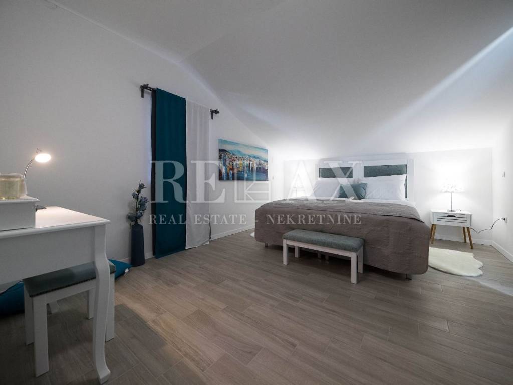 Vila se prostire na više etaža i sastoji se od četiri prostrane spavaće sobe, svaka sa svojom kupaonicom, dodatna dva WC-a, moderno opremljene kuhinje s blagovaonicom te velikog dnevnog boravka. Nekretnina uključuje i dva balkona, prostranu terasu, igraonicu, saunu te unutarnji grijani bazen površine 32 m² s dubinom od 135 cm. Bazen se nalazi u suterenu i opremljen je podnim grijanjem, grijanjem zidova te sustavom odvlaživanja zraka, što omogućuje korištenje tijekom cijele godine. U neposrednoj blizini bazena smještena je sauna i tuš, dok se iz igraonice s teretanom izlazi direktno u okućnicu s terasom, sunčalištem i roštiljem.