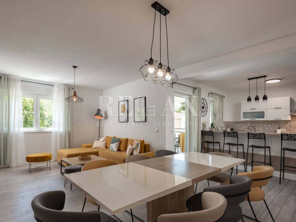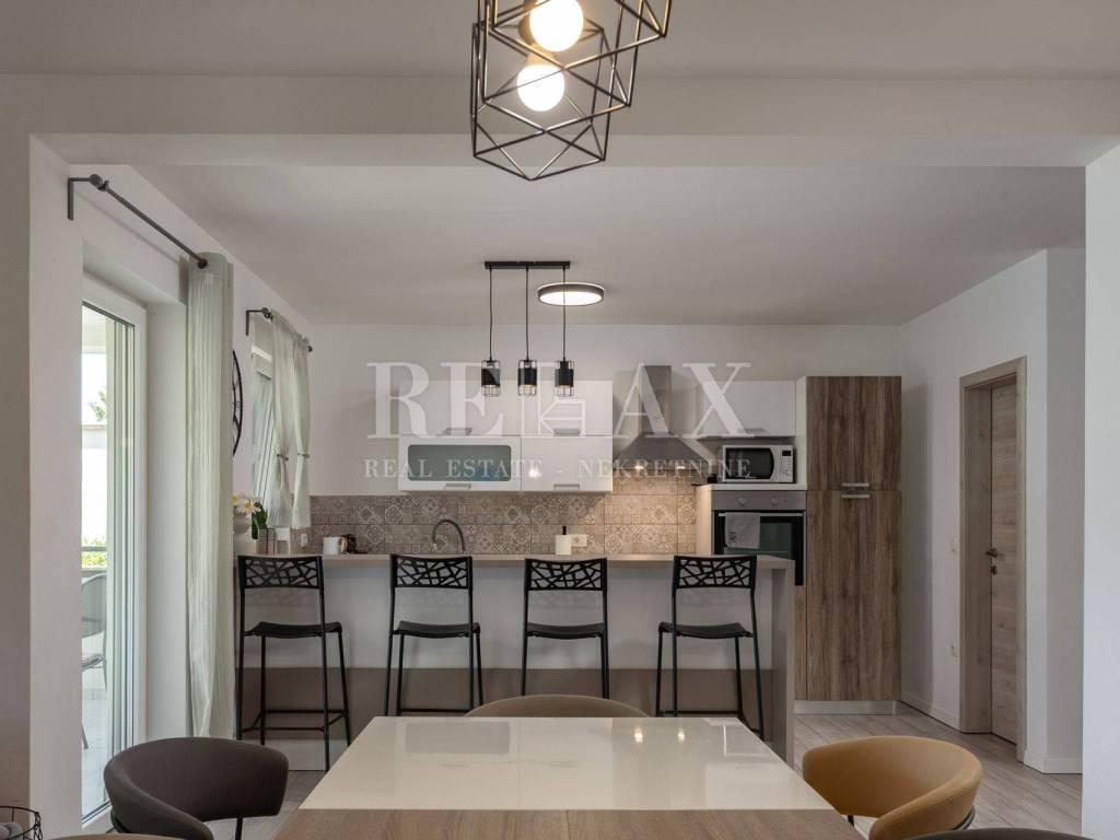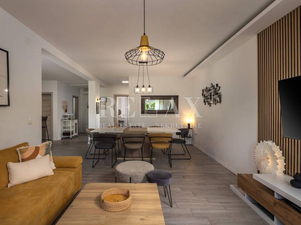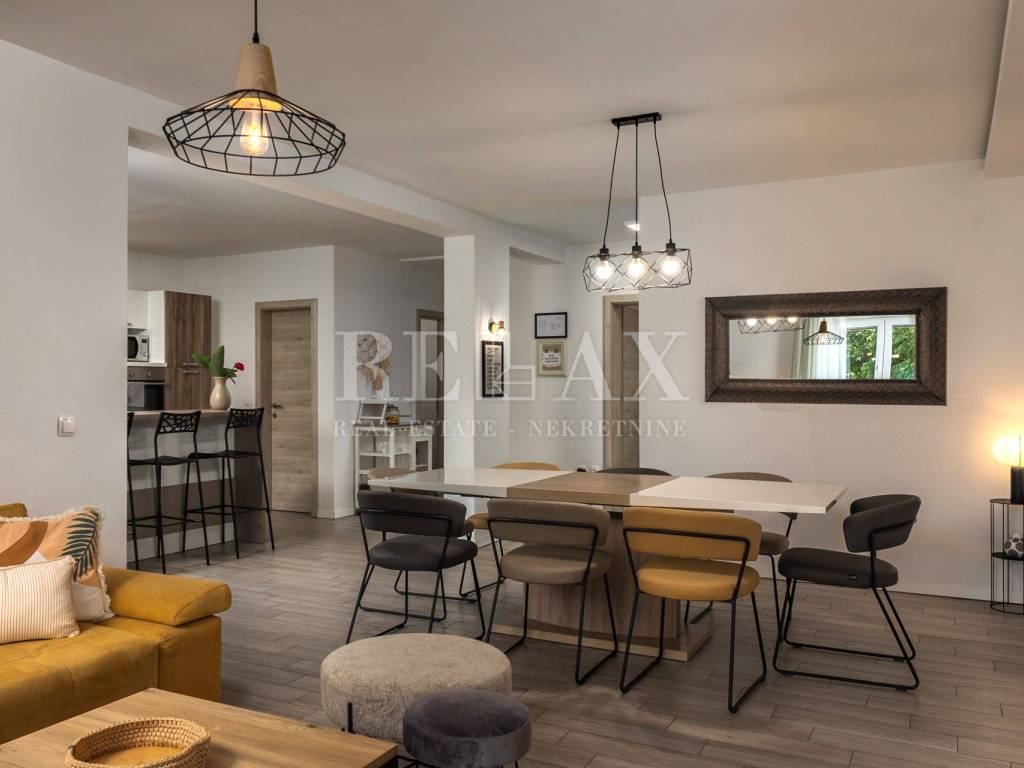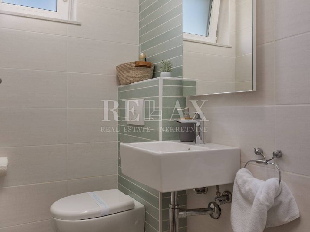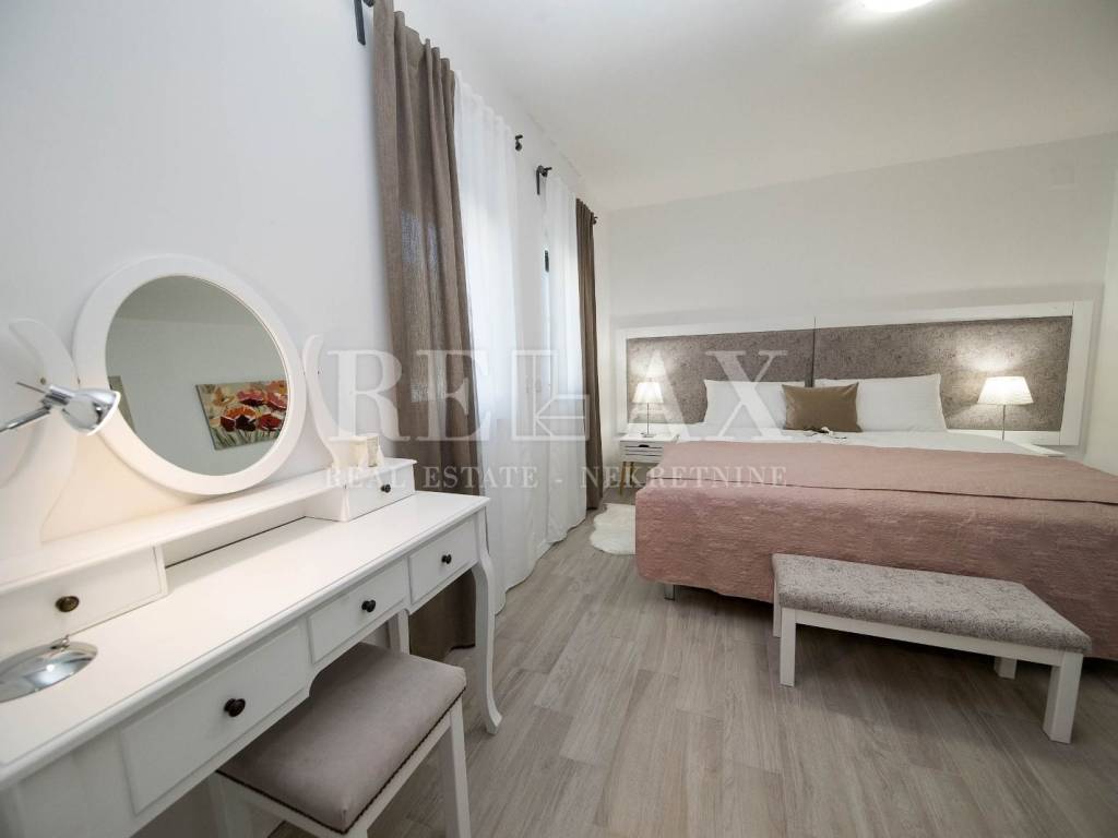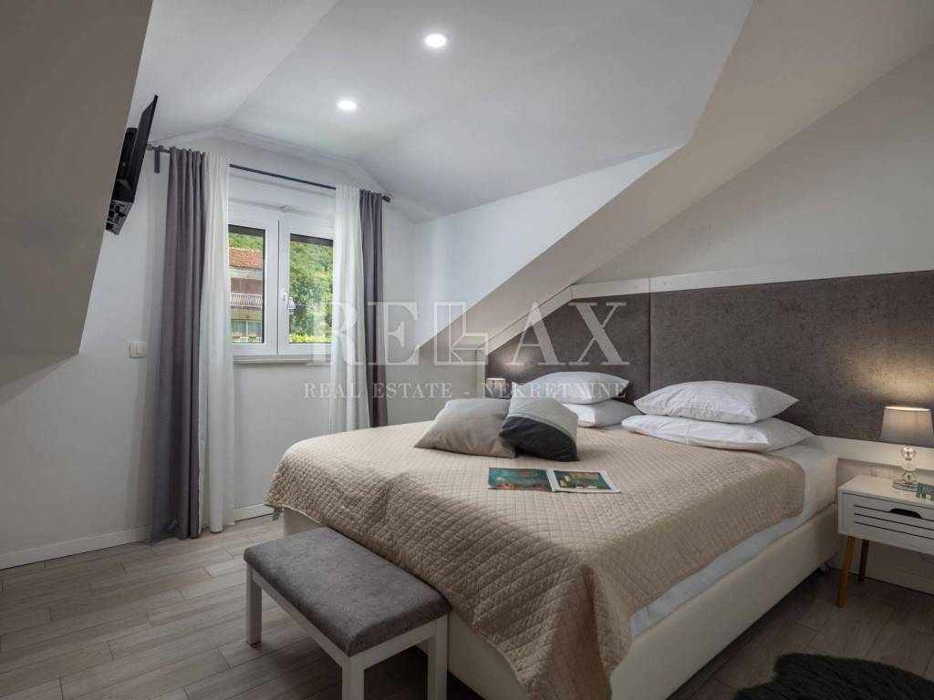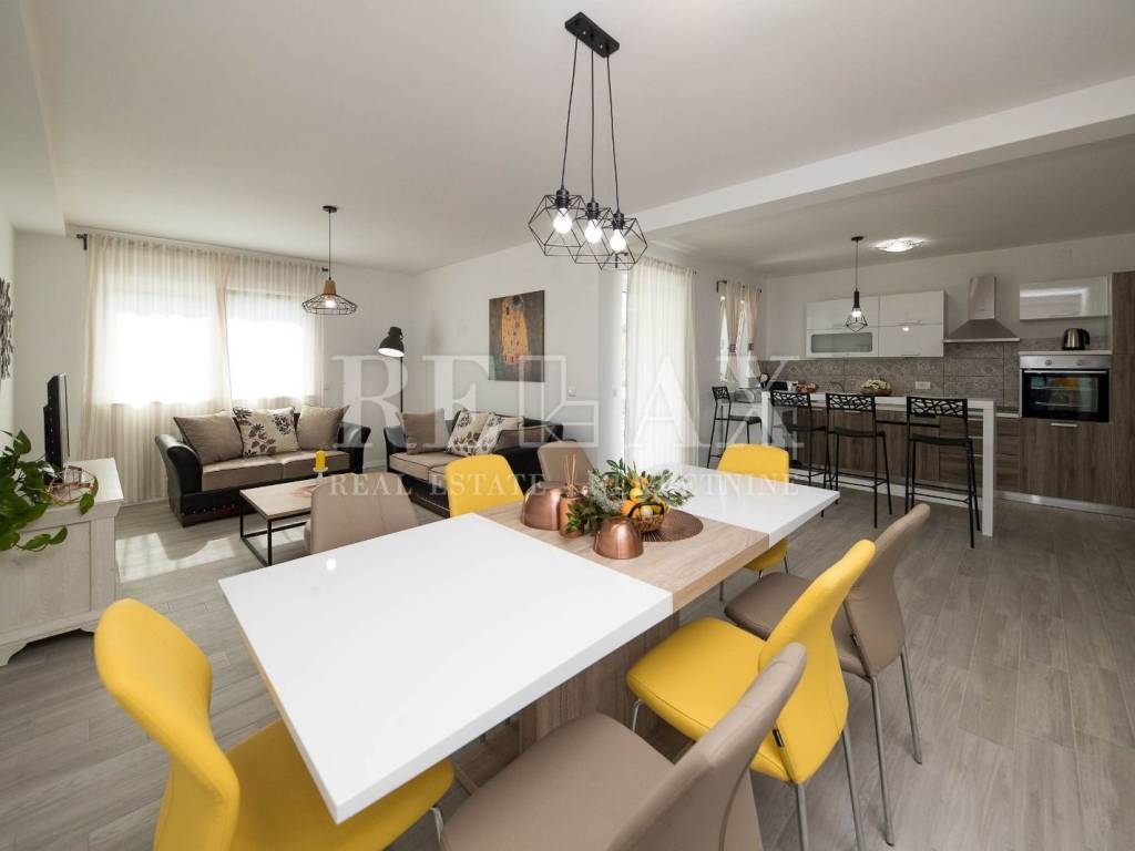 Vila se prostire na više etaža i sastoji se od četiri prostrane spavaće sobe, svaka sa svojom kupaonicom, dodatna dva WC-a, moderno opremljene kuhinje s blagovaonicom te velikog dnevnog boravka. Nekretnina uključuje i dva balkona, prostranu terasu, igraonicu, saunu te unutarnji grijani bazen površine 32 m² s dubinom od 135 cm. Bazen se nalazi u suterenu i opremljen je podnim grijanjem, grijanjem zidova te sustavom odvlaživanja zraka, što omogućuje korištenje tijekom cijele godine. U neposrednoj blizini bazena smještena je sauna i tuš, dok se iz igraonice s teretanom izlazi direktno u okućnicu s terasom, sunčalištem i roštiljem.
