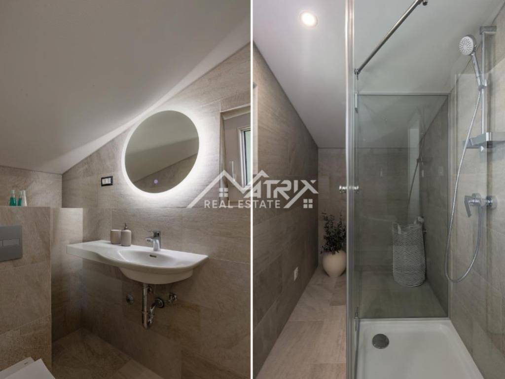 Na katu se nalaze tri spavaće sobe, uključujući glavnu spavaću sobu s vlastitom kupaonicom i izlazom na veliku terasu.