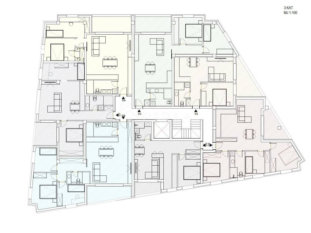 U novom projektu stambene zgrade sa 18 stanova na tri kata sa liftom i garažom, ostavama stanara te krovnim terasama, prodaje se na trećem katu dvosoban stan oznake S16.