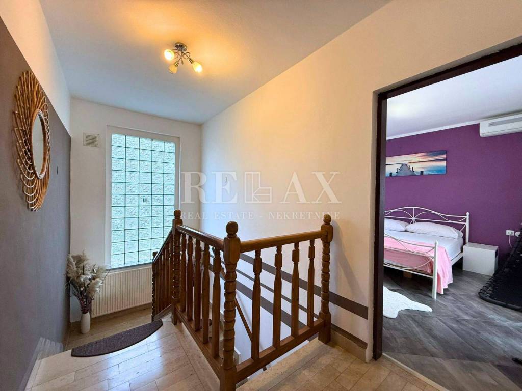 U prizemlju kuće nalazi se hodnik koji vodi prema kuhinji s blagovaonicom, zatim je tu smještena kupaonica i dnevni boravak s kaminom na drva, koji prostoru daje toplinu i poseban ugođaj. Unutarnje stepenice vode na kat, gdje su smještene tri spavaće sobe i dodatna kupaonica. Dvije sobe imaju izlaz na zajednički prostrani balkon s kojeg se pruža pogled na more, dok treća soba ima vlastiti balkon.