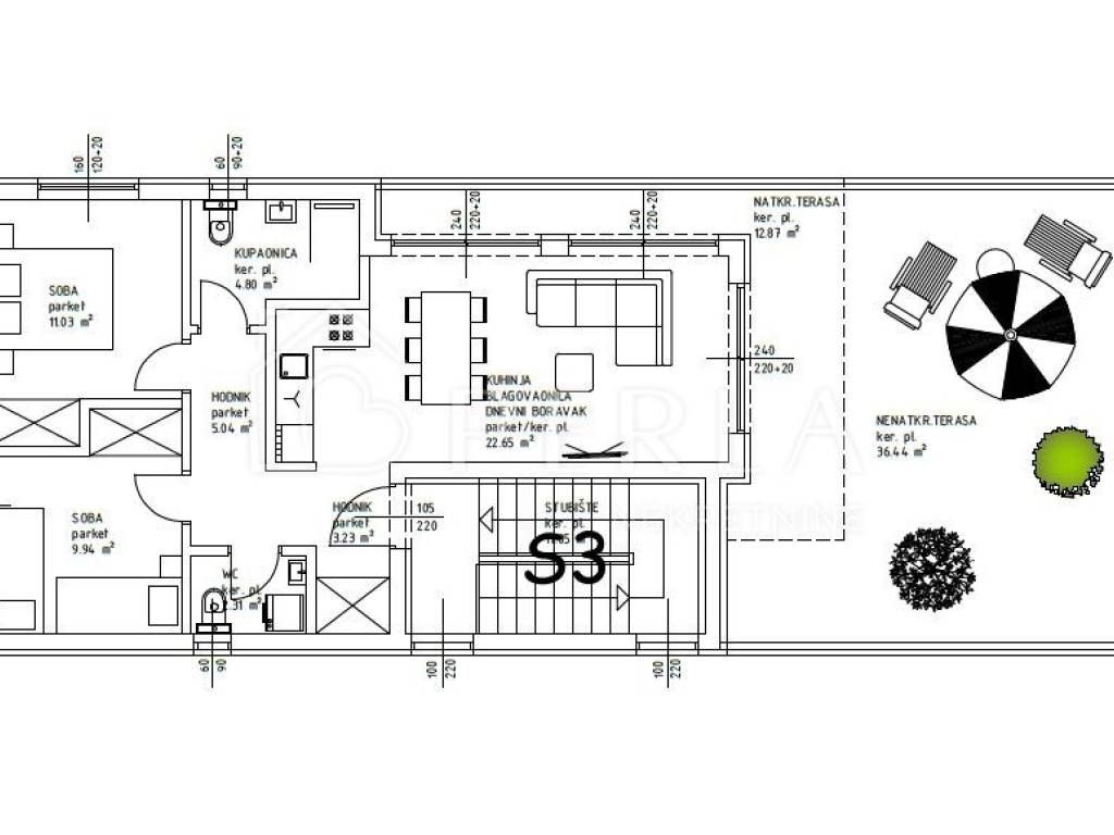 U novogradnji stambene zgrade sa ukupno 3 stana prodaje se penthouse oznake S3 s velikom terasom i s pogledom na more. Stan se sastoji od stepeništa, ostave koja je smještena u prizemlju, ulaznog prostora/ hodnika, s desne strane se nalazi otvoreni koncept dnevnog boravka s blagovanicom i kuhinjom koji su staklenim stijenama spojeni s velikom natkrivenom terasom od skoro 50 m2 sa koje se pruža predivan pogled na more. Dodatnim manjim hodnikom u produžetku ulaznog prostora je odvojen spavaći dio stana u kojem su smještene dvije spavaće sobe, kupaonica i wc. Stan se sastoji od 74.54 m2 m2 neto korisne površine stana s tim da stanu pripada još ostava od 5.93 m2, stubište od 11.05 m2 i dva parkirna mjesta.