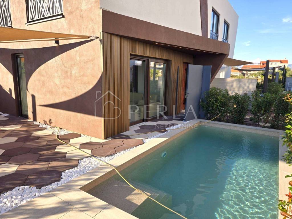 Svaki stan ima i svoje dvorište površine cca 70-100 m2 sa ljetnom kuhinjom i vanjskim grijanim bazenom za uživanje tijekom cijele godine.