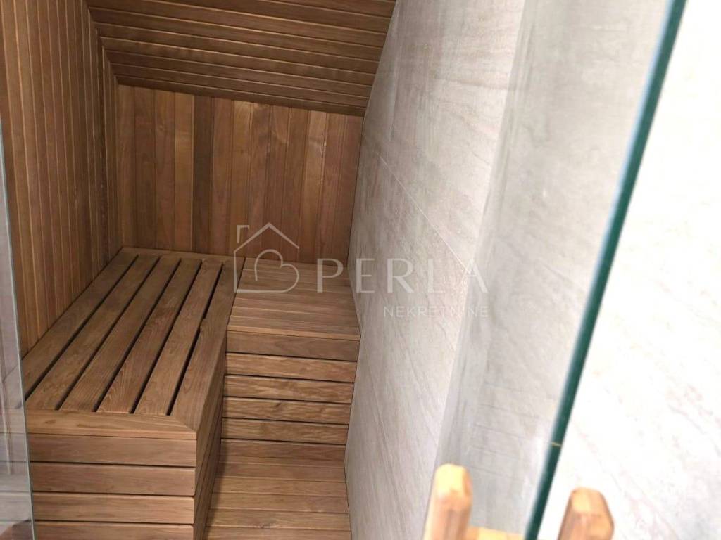 U prizemlju se nalazi prostrani dnevni boravak/blagovaonica/kuhinja (kuhinja po mjeri sa Electrolux aparatima) i potpuno opremljena mini spa zona (finska sauna, tuš, WC).