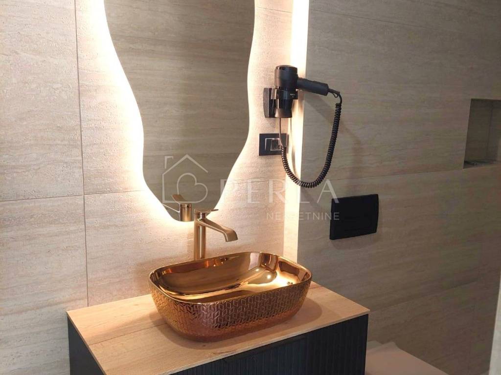 - Ugrađena kuhinja po mjeri sa svim aparatima (hladnjak, štednjak, pećnica, perilica posuđa, perilica rublja)