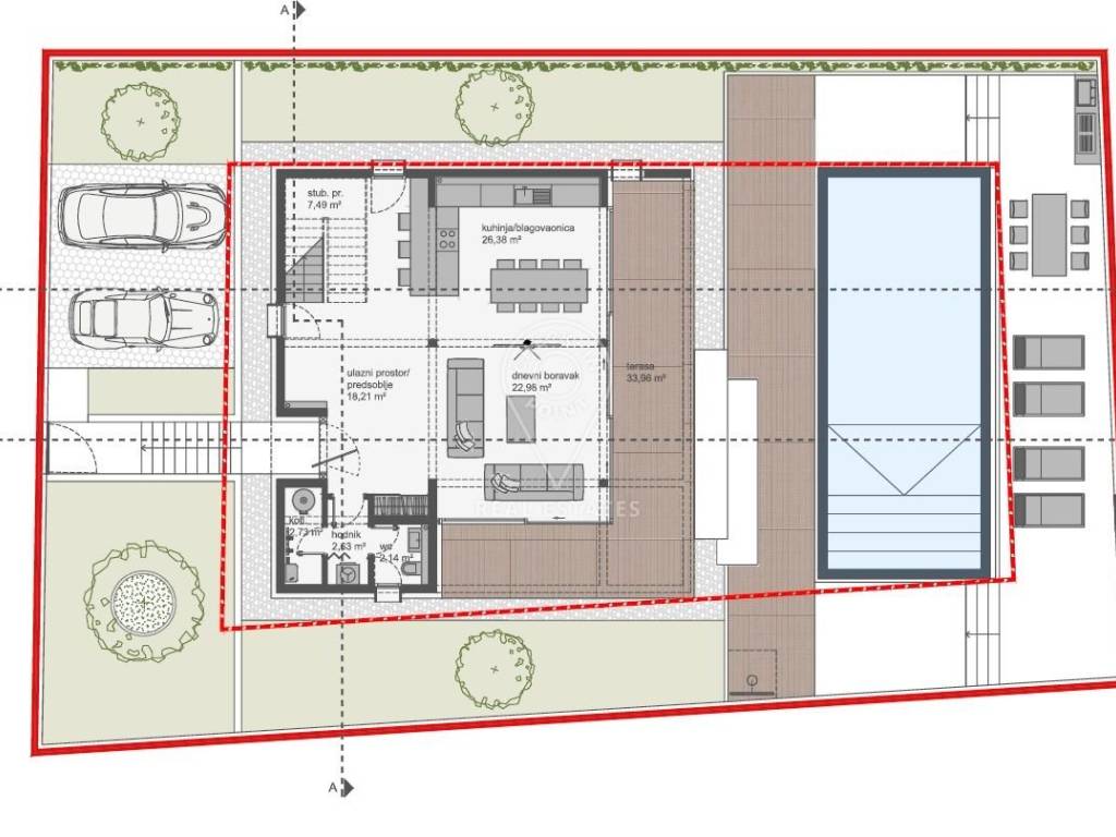 Iz dnevne sobe pristupa se velikoj natrkivenoj terasi od 34 m2 i dalje vanjskom bazenu dimenzija 11x4 sa pripadajućim sunčalištem, ljetnom kuhinjom i vanjskim prostorom za blagovanje. Kuća je sa ukupno tri strane omeđena hortikulturom, zelenim površinama, a neposredno uz glavni ulaz u kuću smještena su dva vanjska parkirna mjesta.