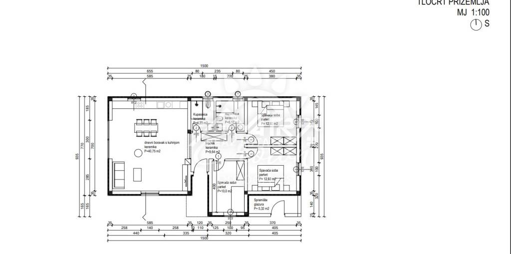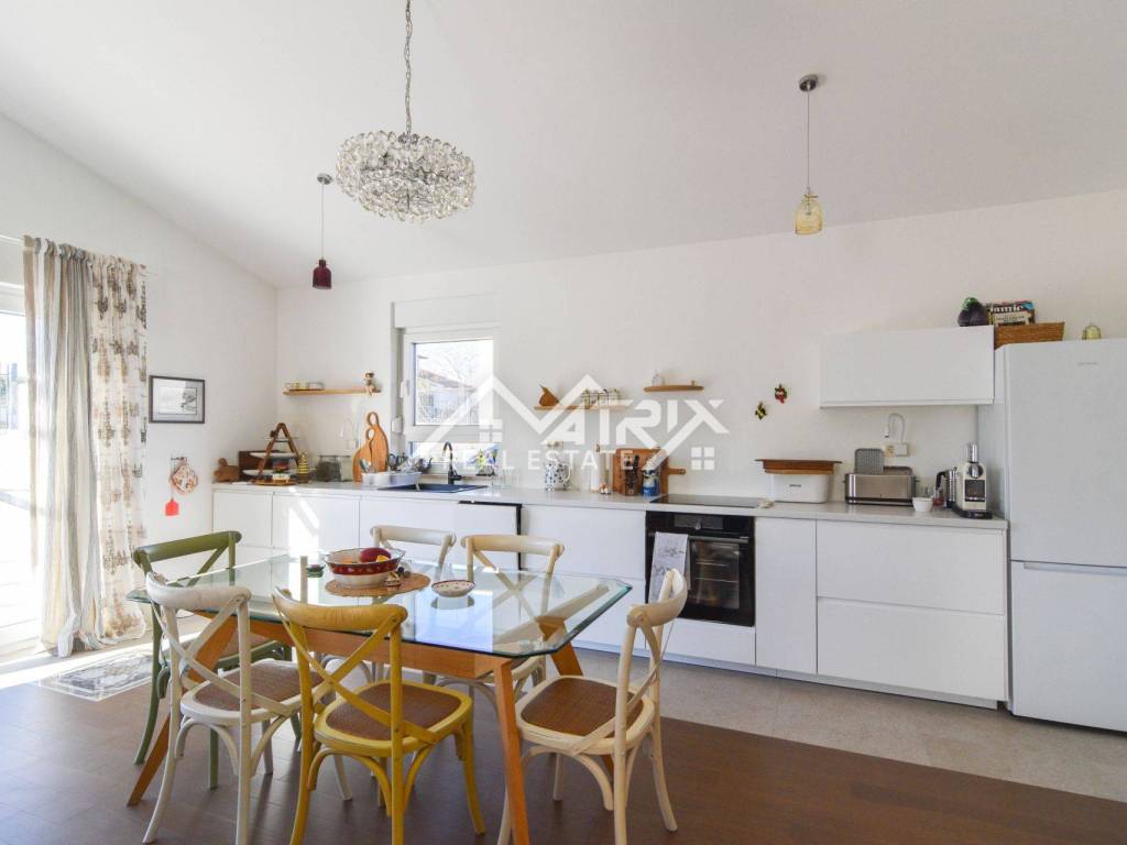 Centralni dio tlocrta je prostrani dnevni boravak s kuhinjom i blagovaonicom, s izlazom na terasu bazena kroz velike staklene stijene. Uz to, u kući se nalaze i tri spavaće sobe, te dvije moderno uređene kupaonice.