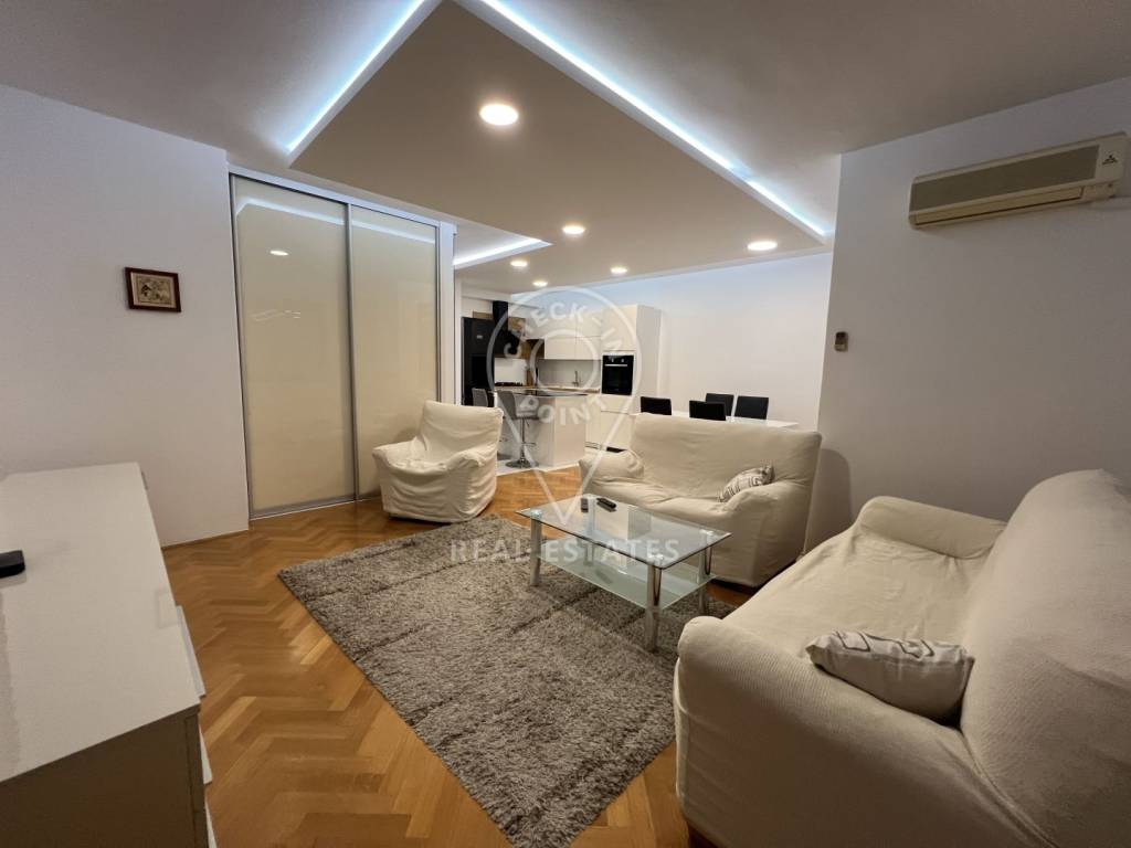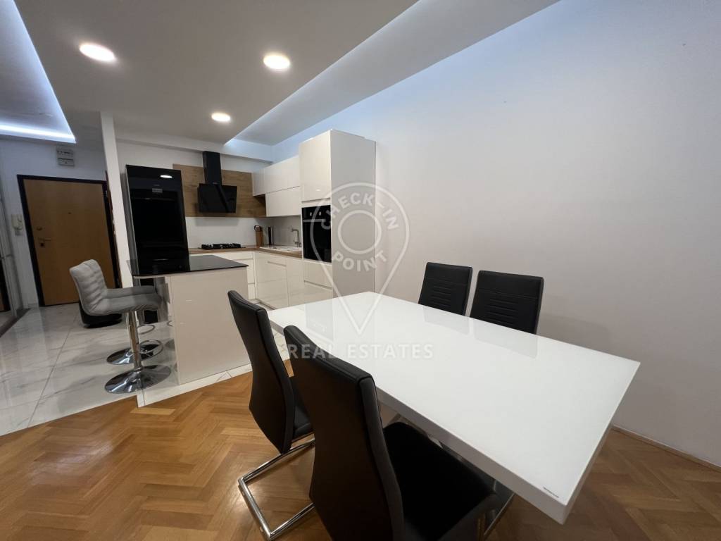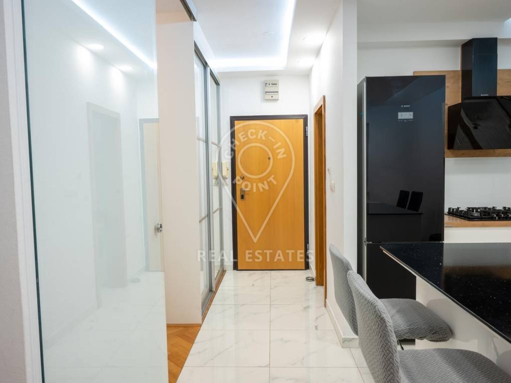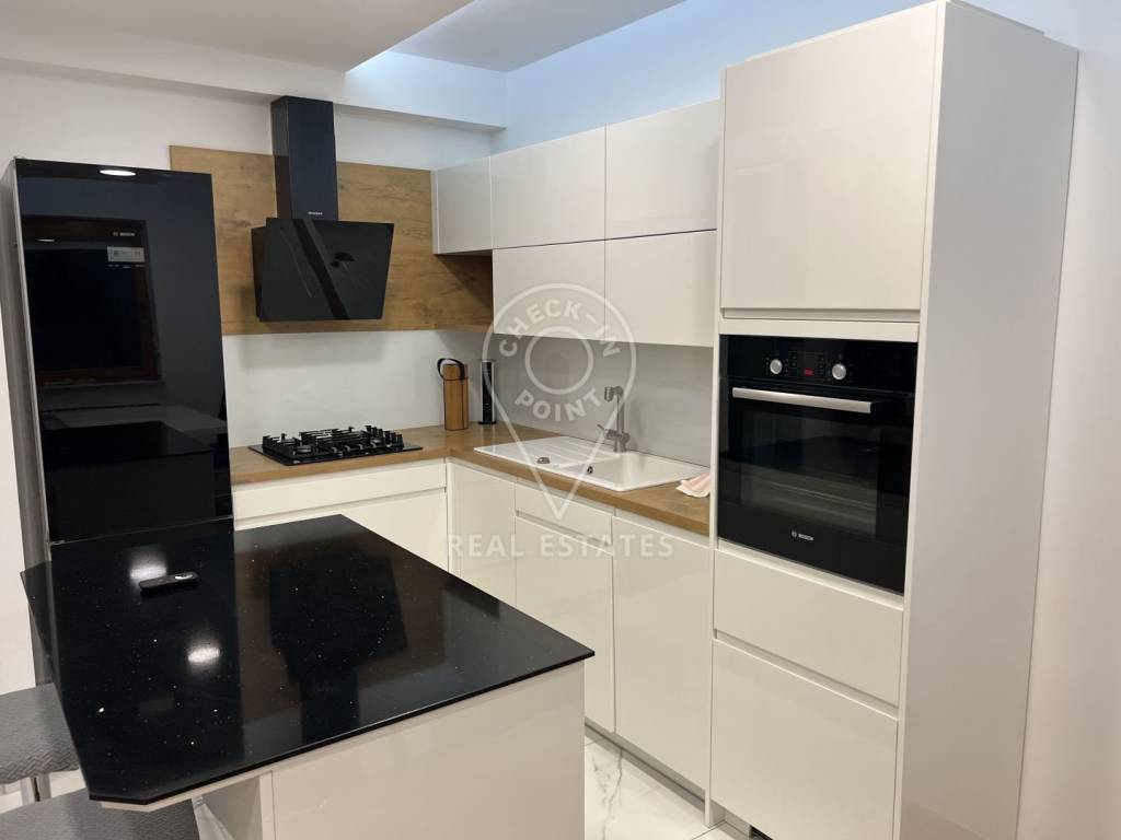Stan je potpuno namješten, opremljen potpuno novom kuhinjom (DanKuchen) sa ugrađenim svim potrebnim uređajima (pećnica, štednjak, veliki hladnjak sa zamrzivačem, perilica posuđa, kuhinjski otok).
