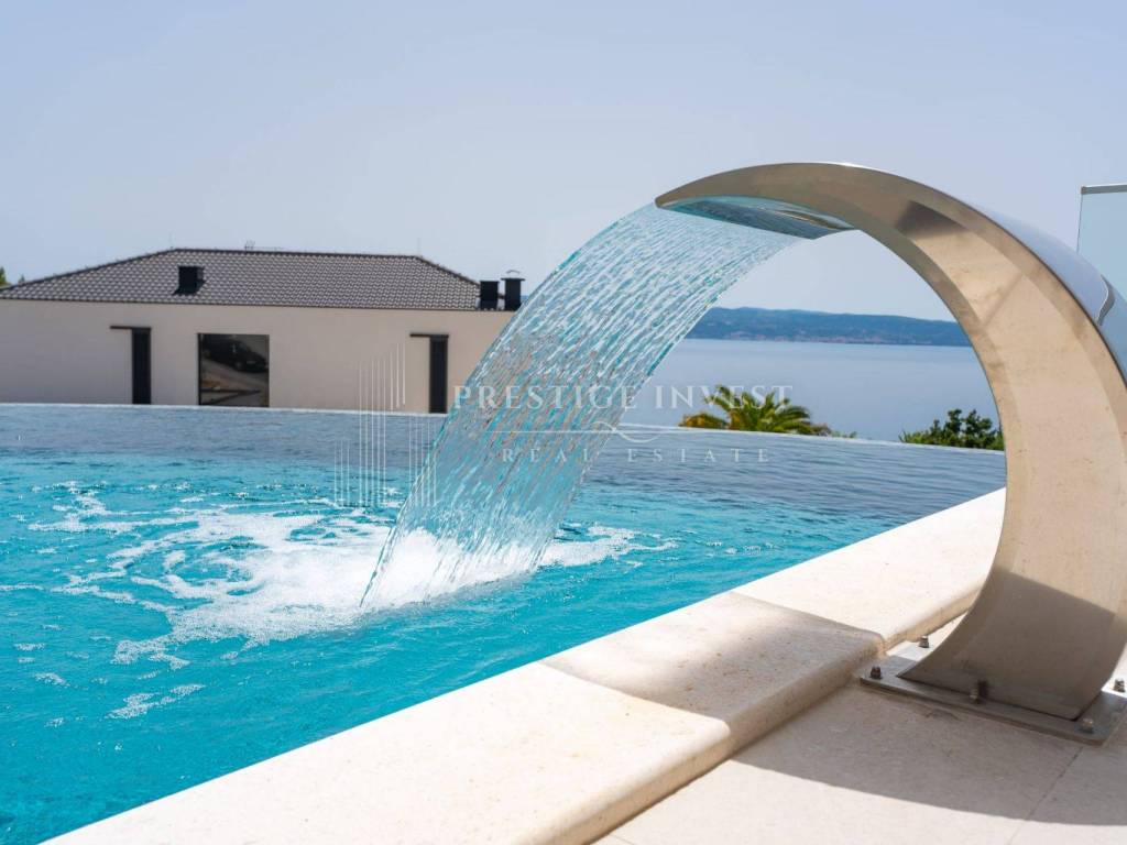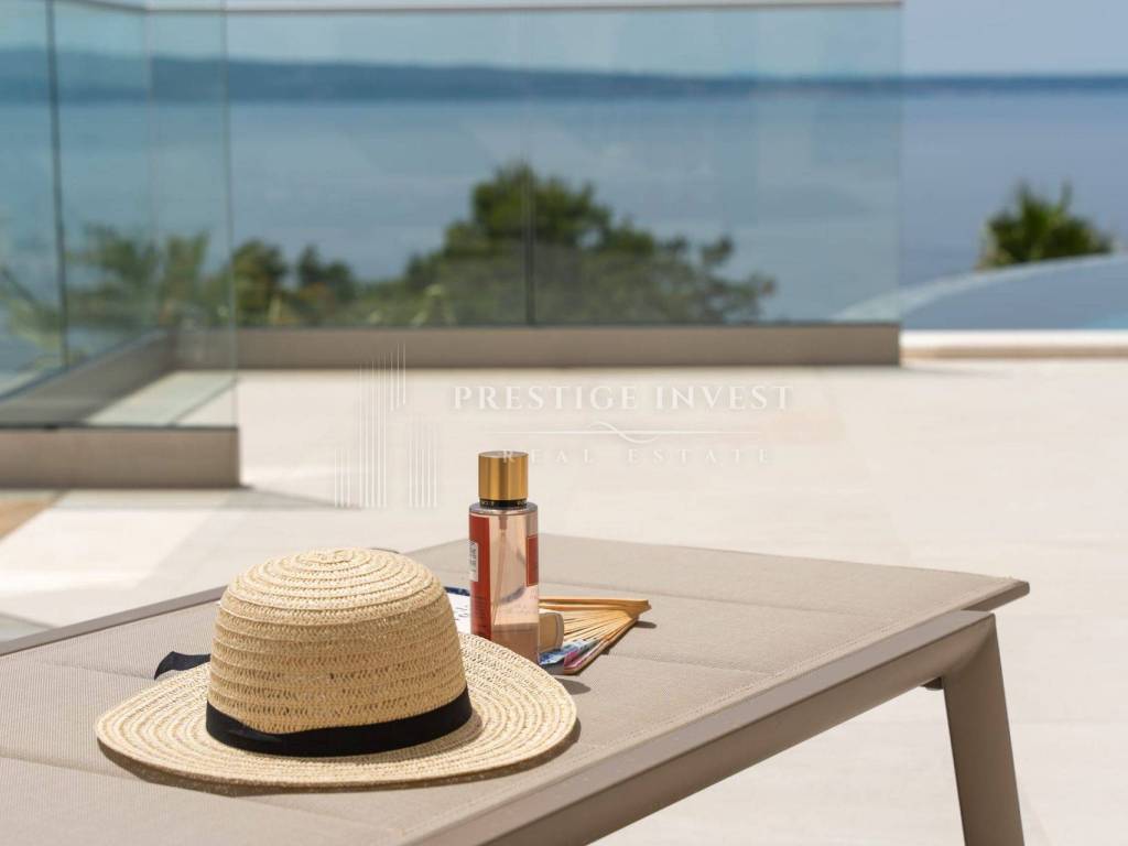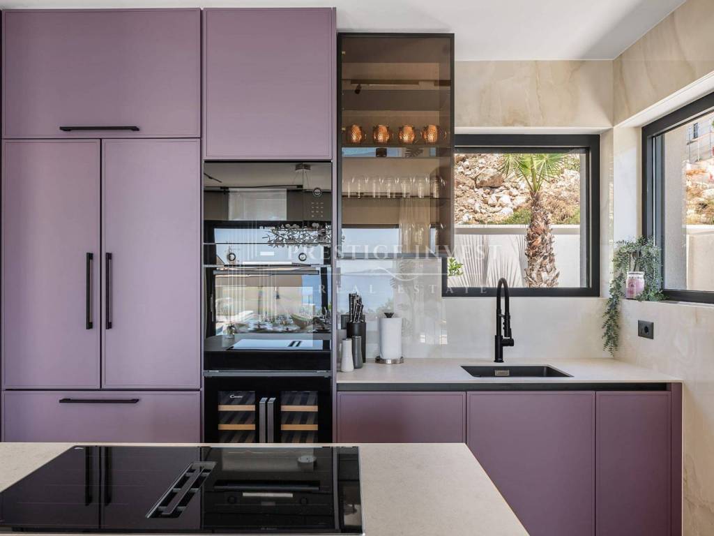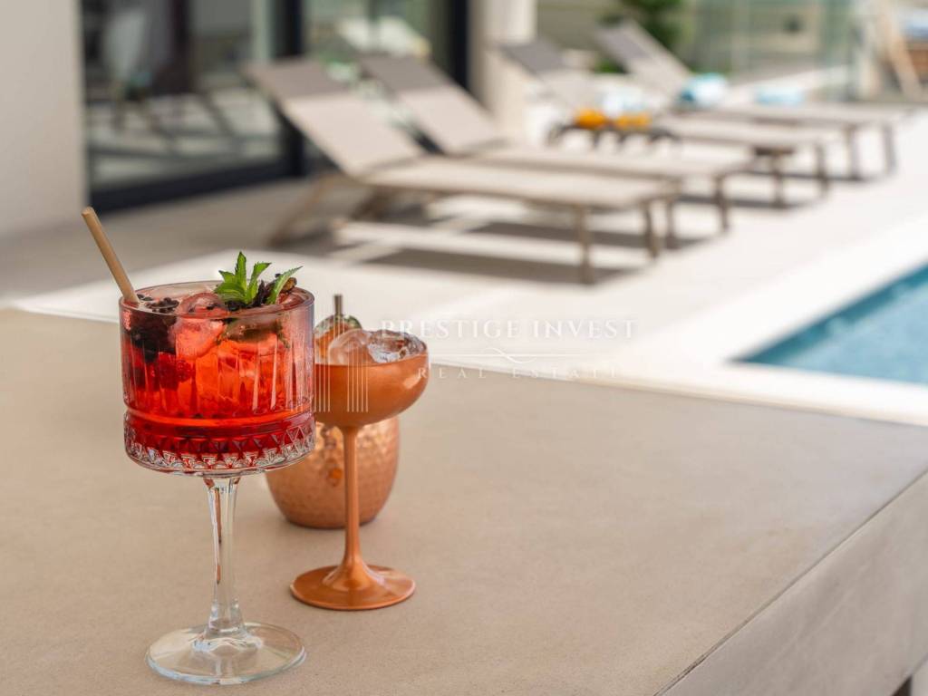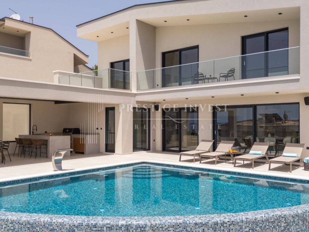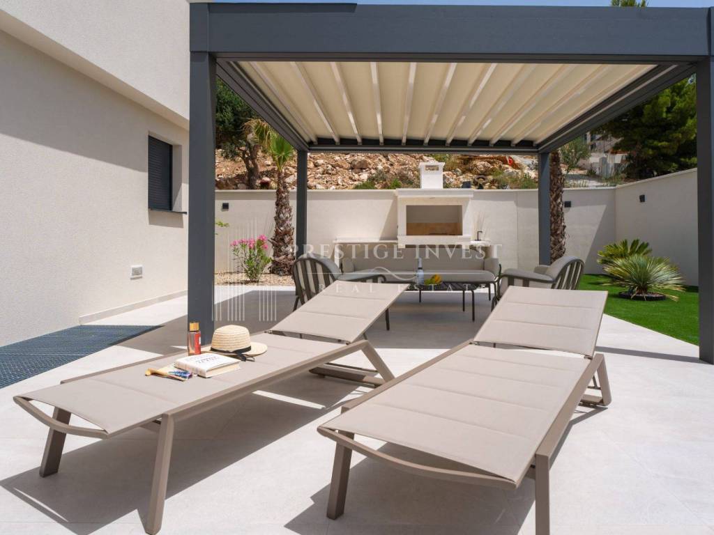 Bioklimatska pergola na terasi nudi dodatnu udobnost, dok ljetna kuhinja s roštiljem na plinom omogućuje uživanje u ukusnim obrocima na otvorenom. Pogled na more s terase dodaje dodatnu čar ovoj već spektakularnoj nekretnini.