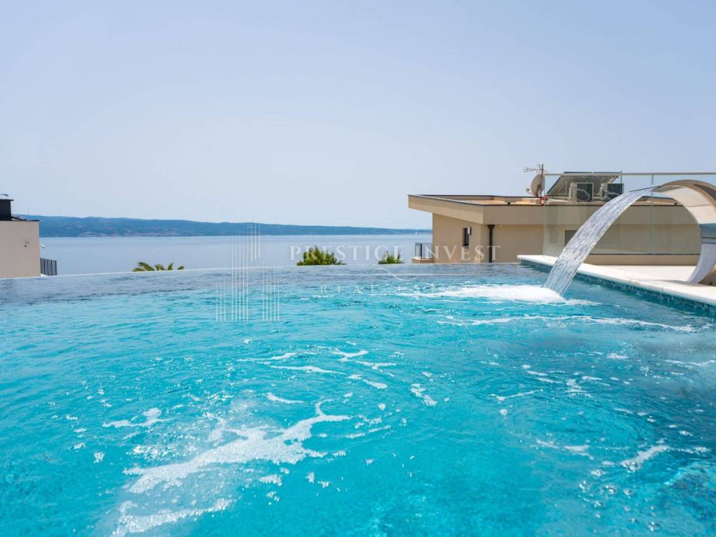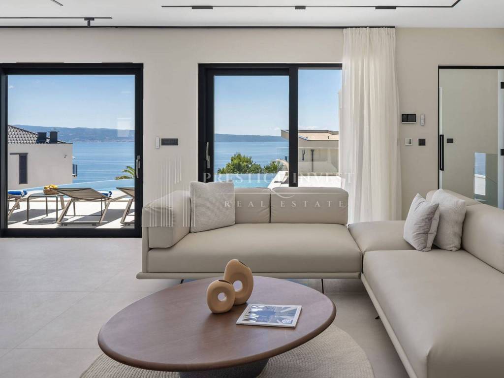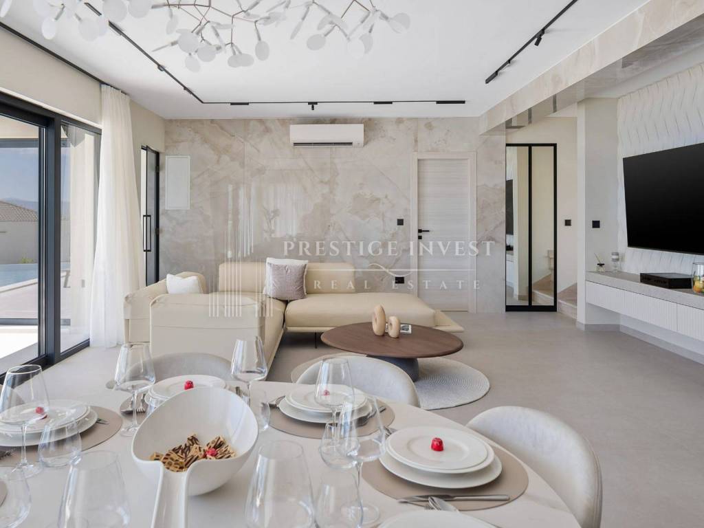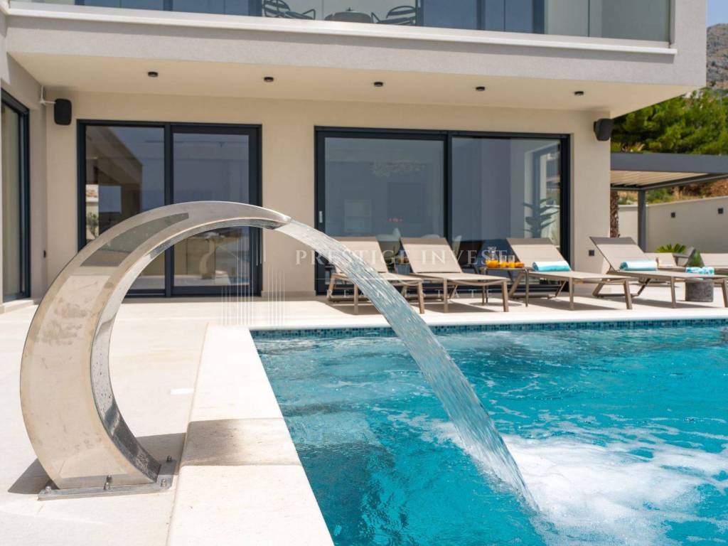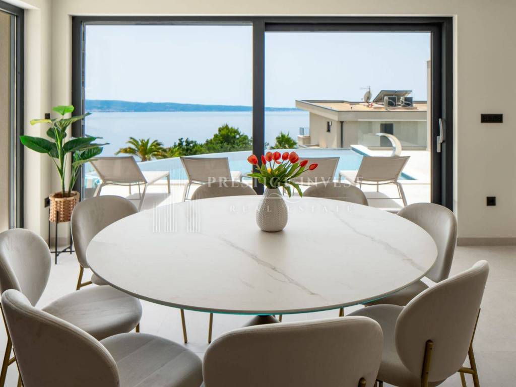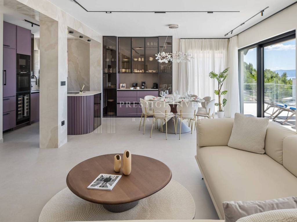 Bioklimatska pergola na terasi nudi dodatnu udobnost, dok ljetna kuhinja s roštiljem na plinom omogućuje uživanje u ukusnim obrocima na otvorenom. Pogled na more s terase dodaje dodatnu čar ovoj već spektakularnoj nekretnini.
