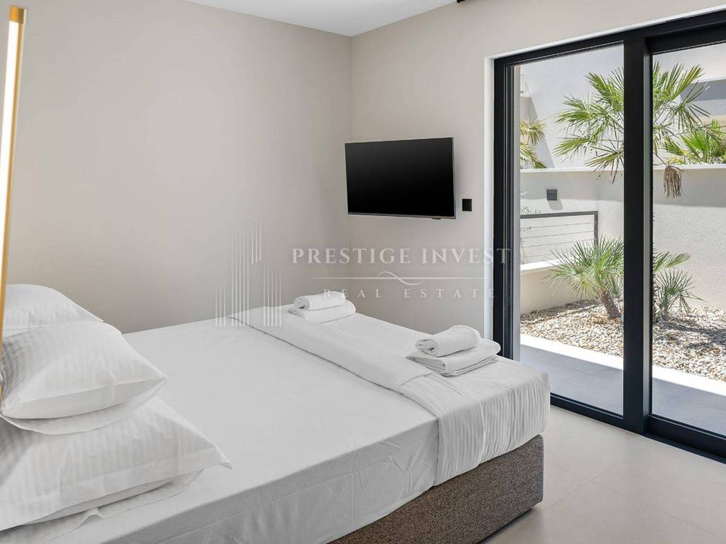 Na prizemlju se nalazi jedna prostrana spavaća soba s vlastitom kupaonicom, dok dnevni boravak s otvorenom kuhinjom i blagovaonicom vodi na natkrivenu terasu s bazenom i vanjskom ljetnom kuhinjom, idealnom za druženje s obitelji i prijateljima.