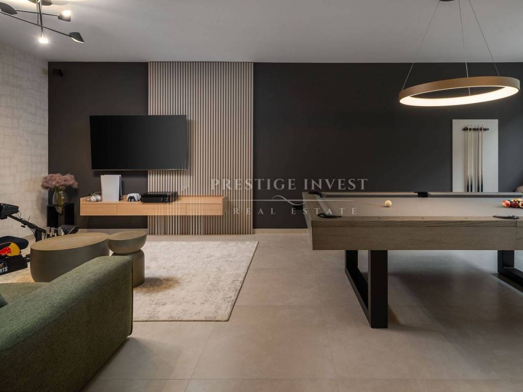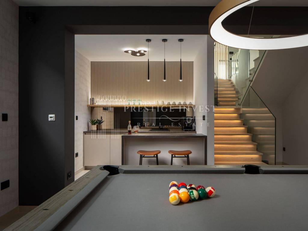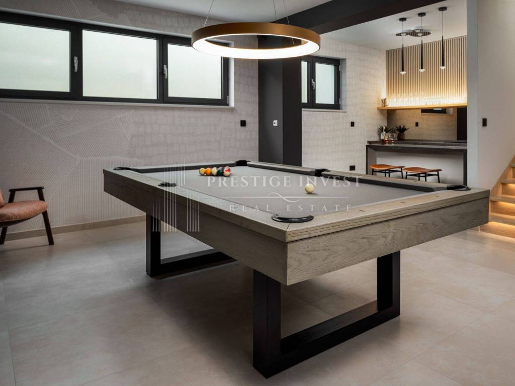 U suterenu, gosti će uživati u prostoru za druženje uz biljar i prostrano kućno kino, lounge zoni i kuhinji. Ova etaža također nudi udobnu spavaću sobu, kupaonicu i ostavu.