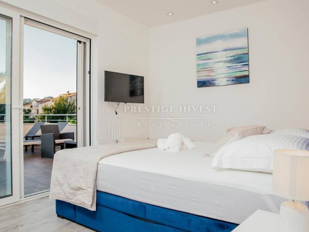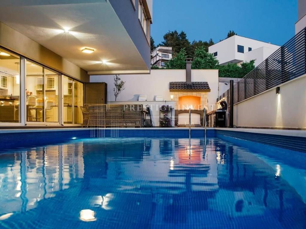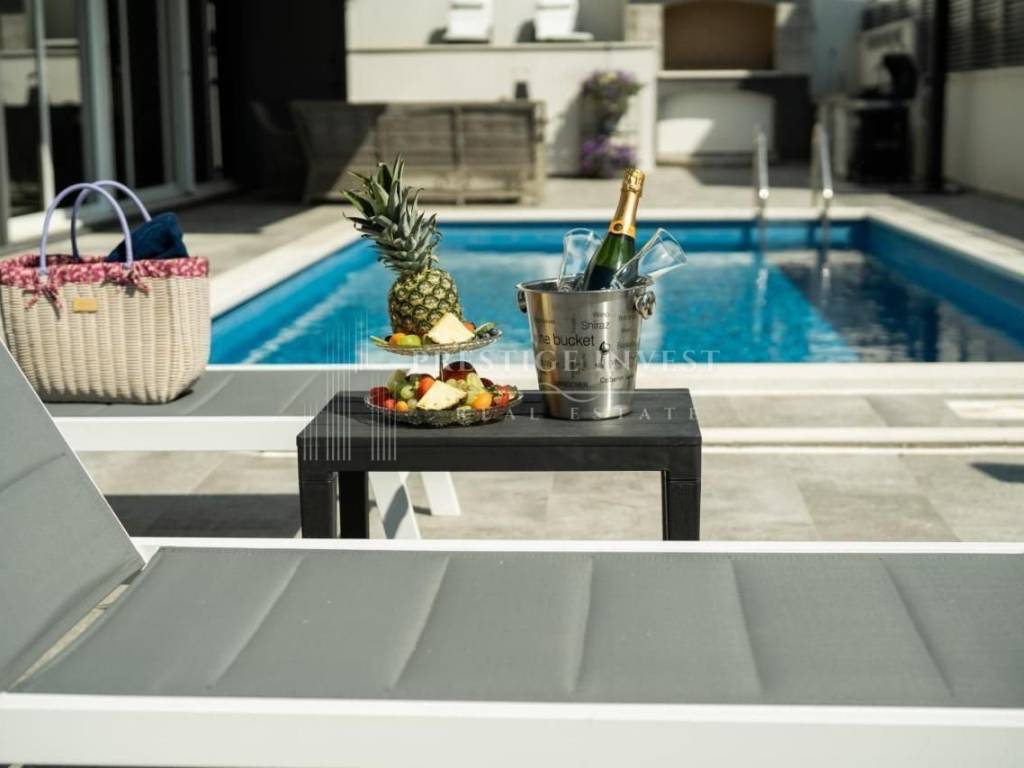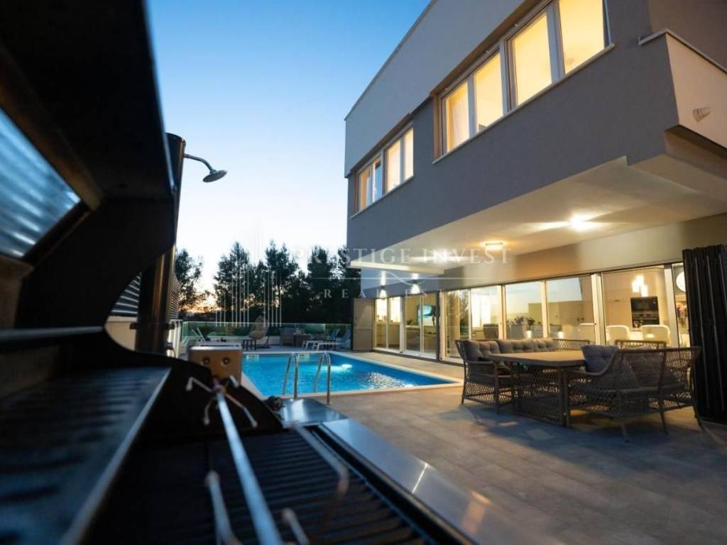 U samom prizemlju ove luksuzne nekretnine smješteni su prostrani dnevni boravak s potpuno opremljenom kuhinjom koje pružaju izlazak na terasu i dvorište s bazenom i ležaljkama koje vam nude oazu za odmor i mir. Uz to dodatno je smješten roštilj i prostor za objedovanje u vrtu. Moderan vrt pažljivo je izdizajniran i uređen mediterasnkim biljem te nadopunjuje osjećaj prirode. Vila se sastoji od četiri modern dizajnirane spavaće sobe i tri kupaonice s tuš kabinom.