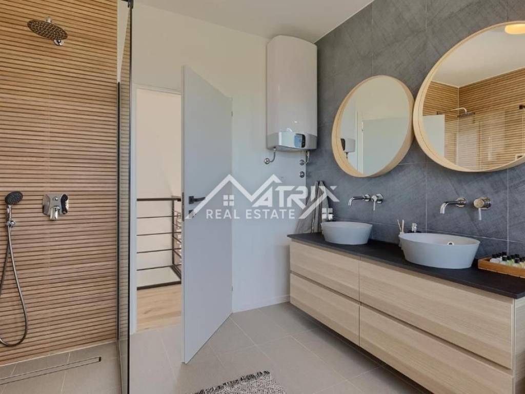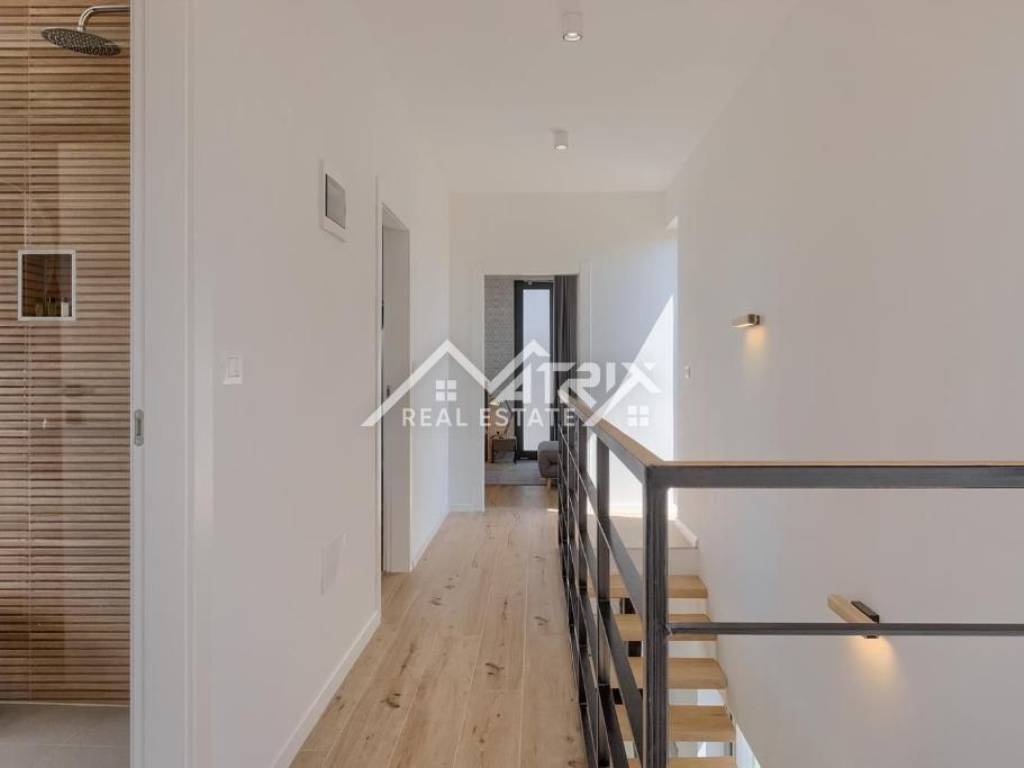 Pristup prvom katu omogućen je modernim unutarnjim modernim stubištem napravljenim u kombinaciji metala i drveta. Na katu se nalaze tri komforne spavaće sobe od kojih svaka ima pristup terasama s kojih se pruža prekrasan otvoreni pogled. Master spavaća soba ima vlastitu terasu dok preostale dvije spavaće sobe imaju zajedničku terasu. Na katu se nalazi jedna moderno opremljena kupaonica, a u jednoj spavaćoj sobi postavljene su sve instalacije za dogradnju dodatne spavaće sobe (koje je i predviđena u projektu).