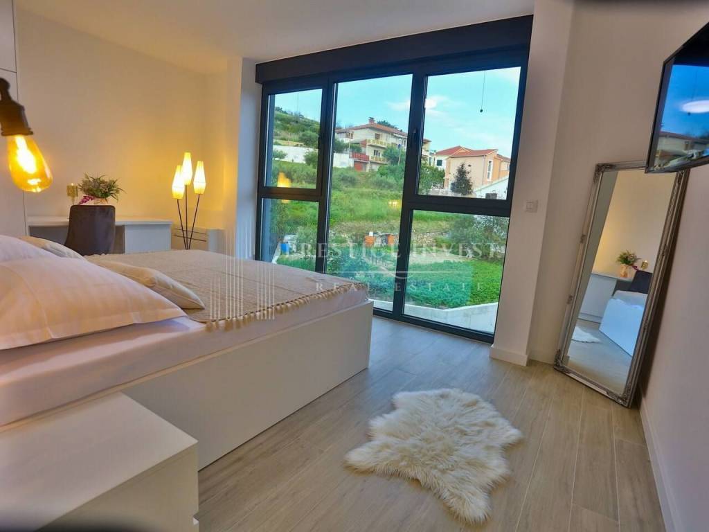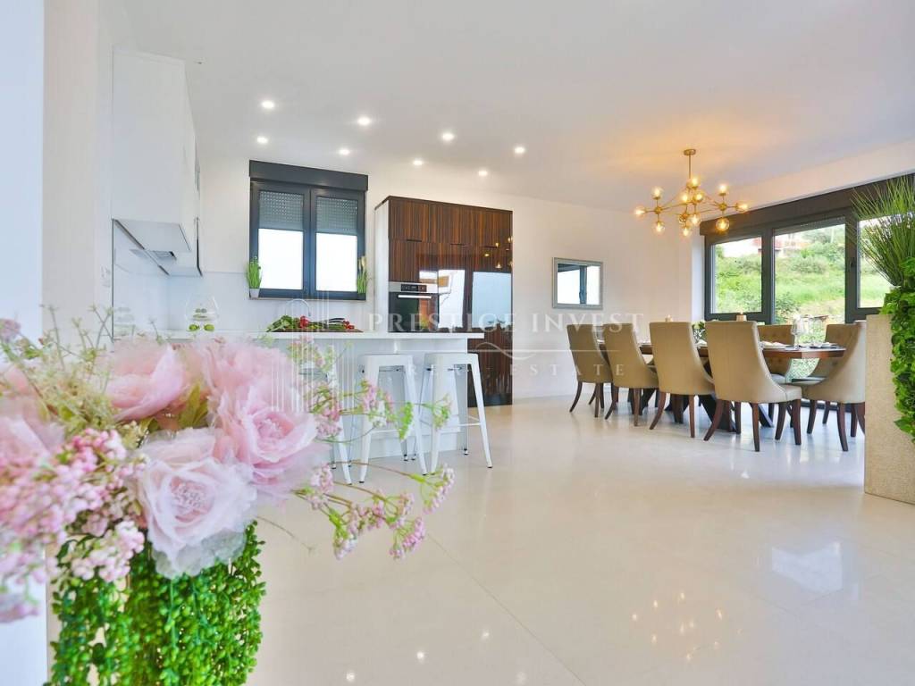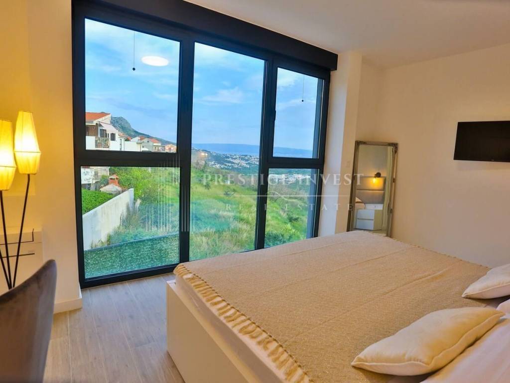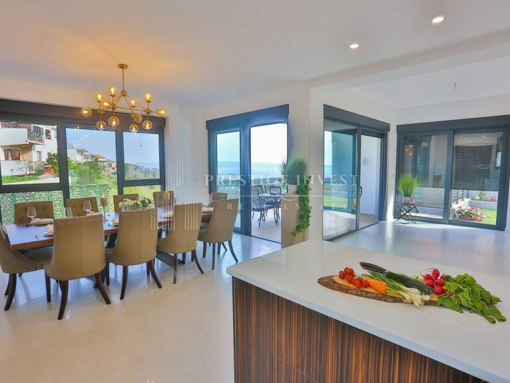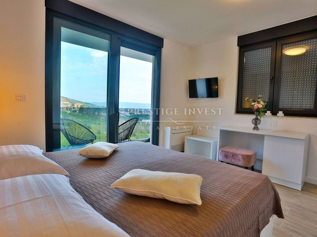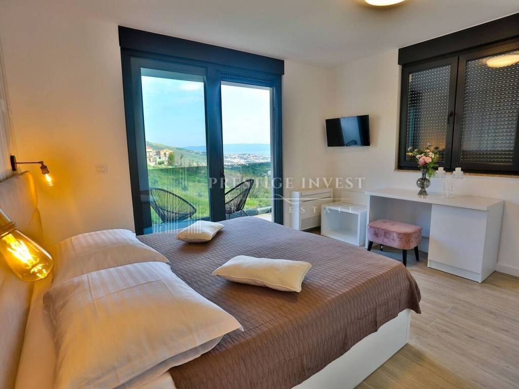 Na prvom katu je smješten dnevni prostor s velikom kuhinjom i blagovaonicom s izlazom na terasu s prekrasnim pogledom na more. Na drugom katu smještene su četiri spavaće sobe s vlastitim kupaonicama i svaka sa vlastitim pogledom na more. U svim sobama se nalazi klima i podno grijanje. Vila je opremljena dizajnerskim namještajem, rasvjetom i tepisima.