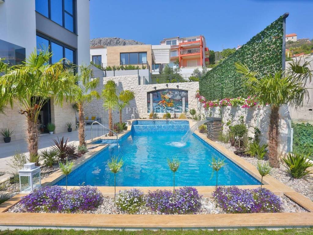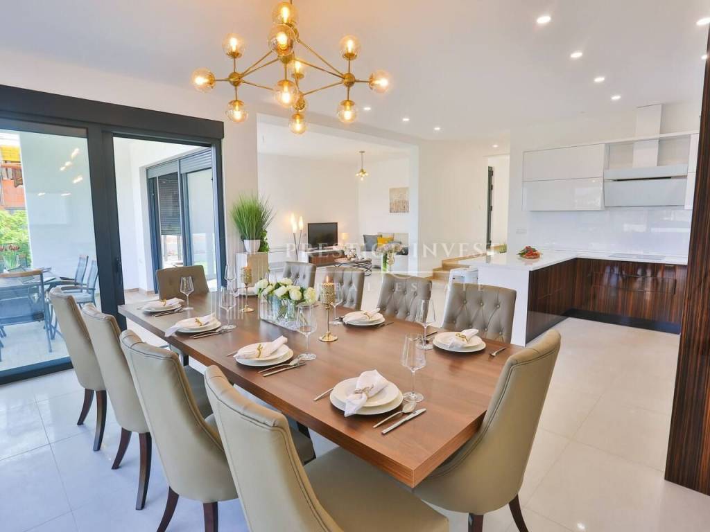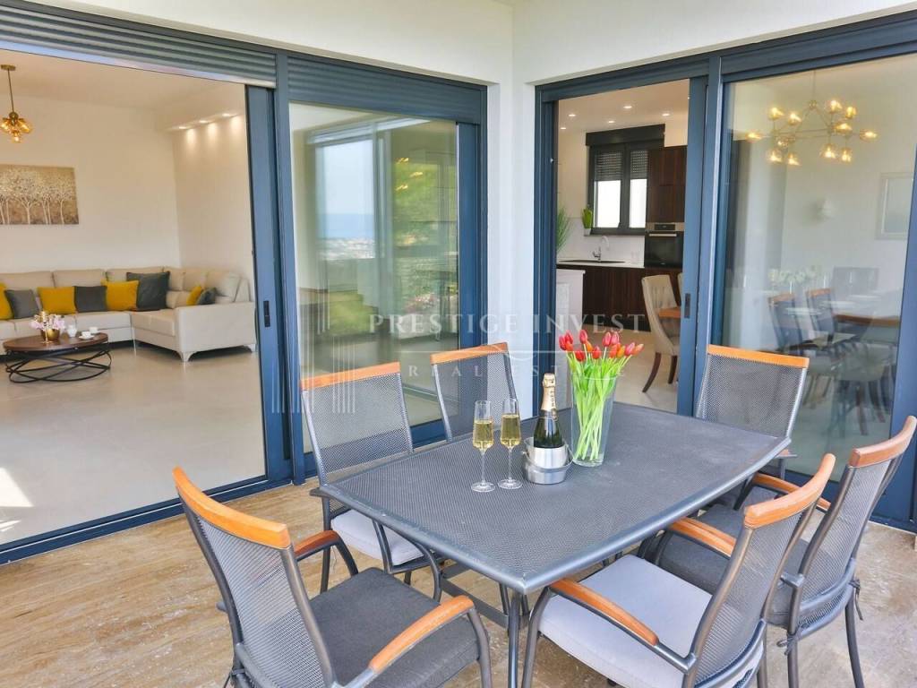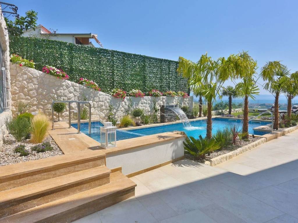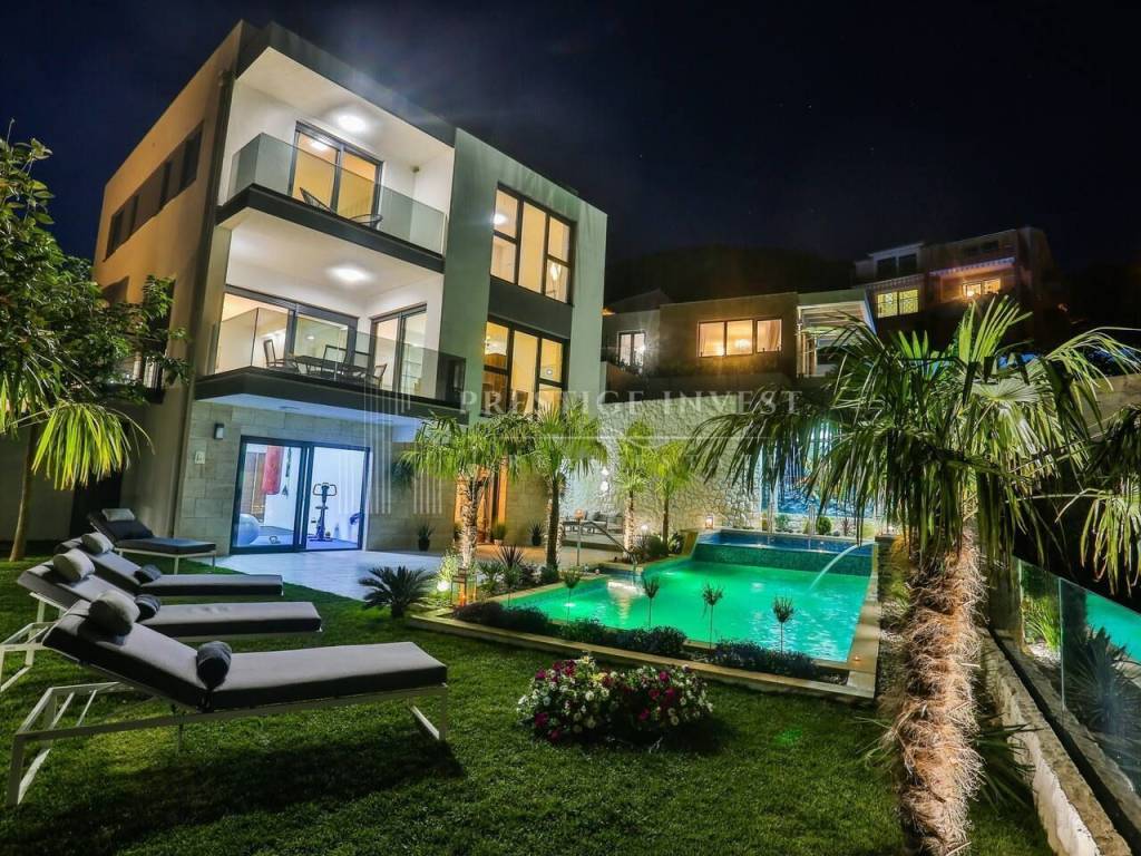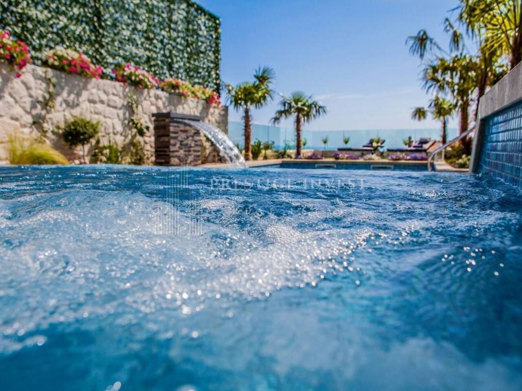Na prvom katu je smješten dnevni prostor s velikom kuhinjom i blagovaonicom s izlazom na terasu s prekrasnim pogledom na more. Na drugom katu smještene su četiri spavaće sobe s vlastitim kupaonicama i svaka sa vlastitim pogledom na more. U svim sobama se nalazi klima i podno grijanje. Vila je opremljena dizajnerskim namještajem, rasvjetom i tepisima.