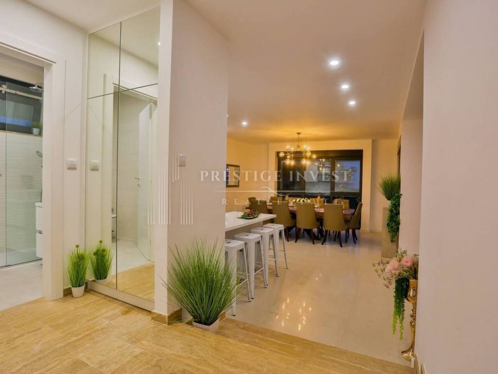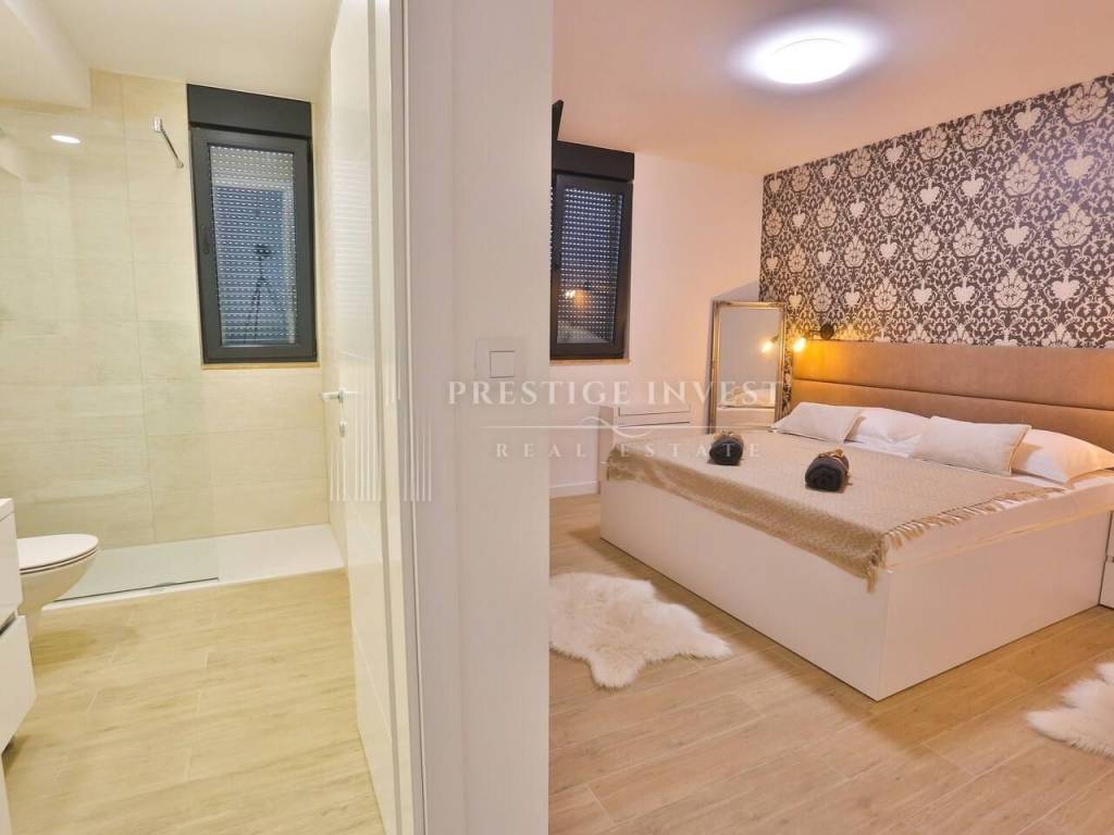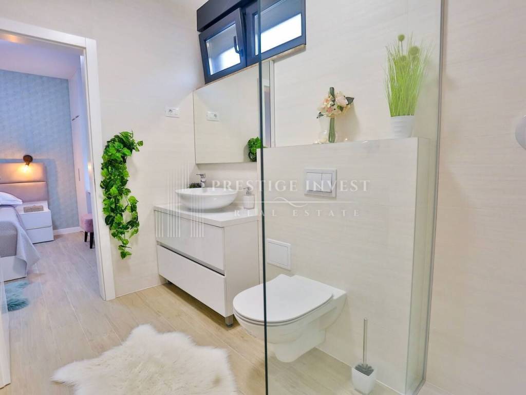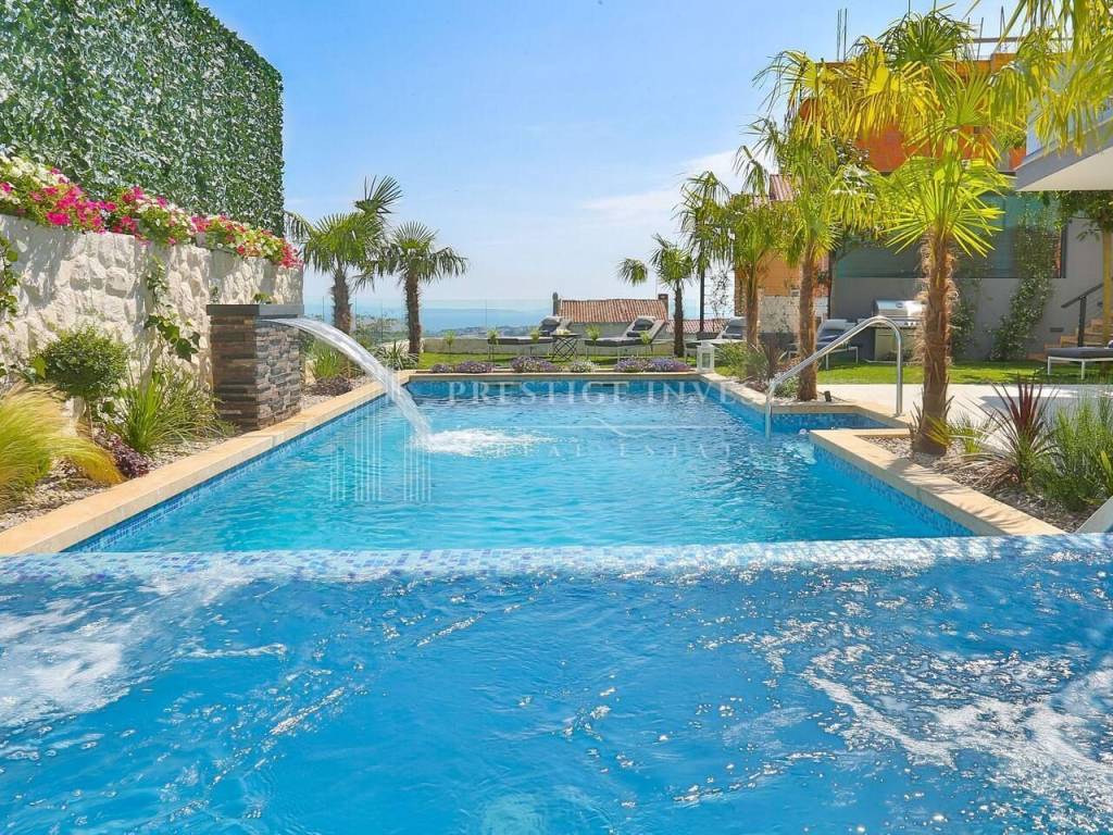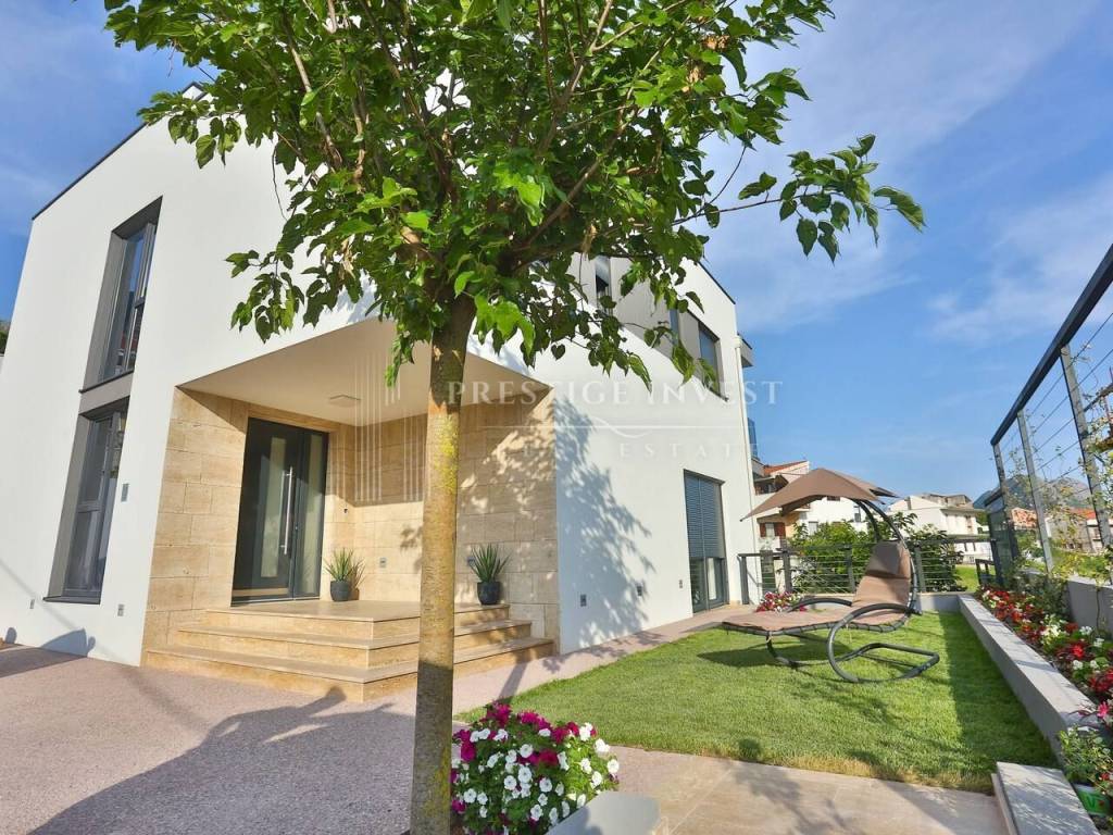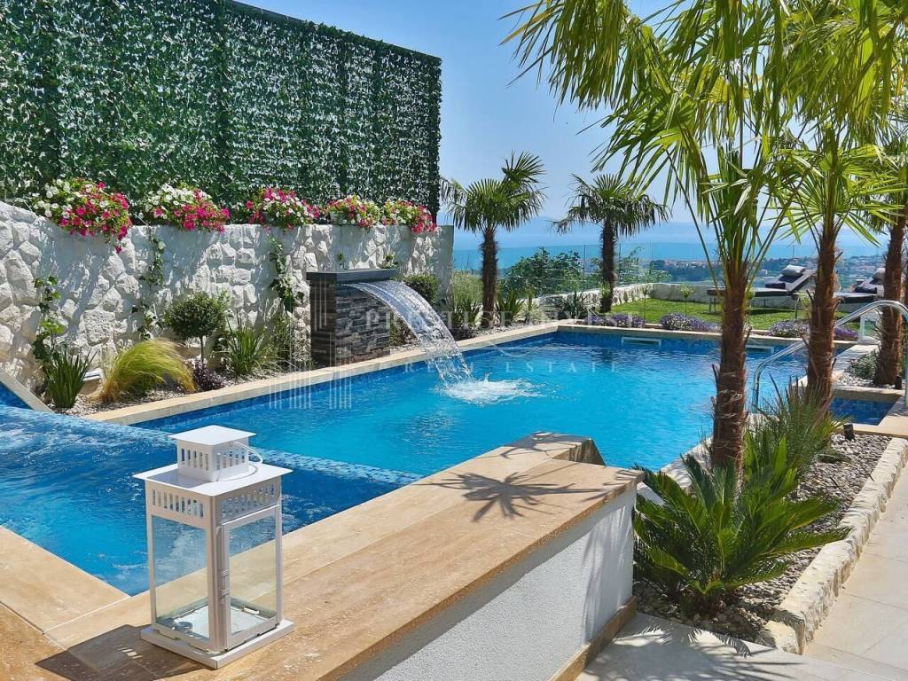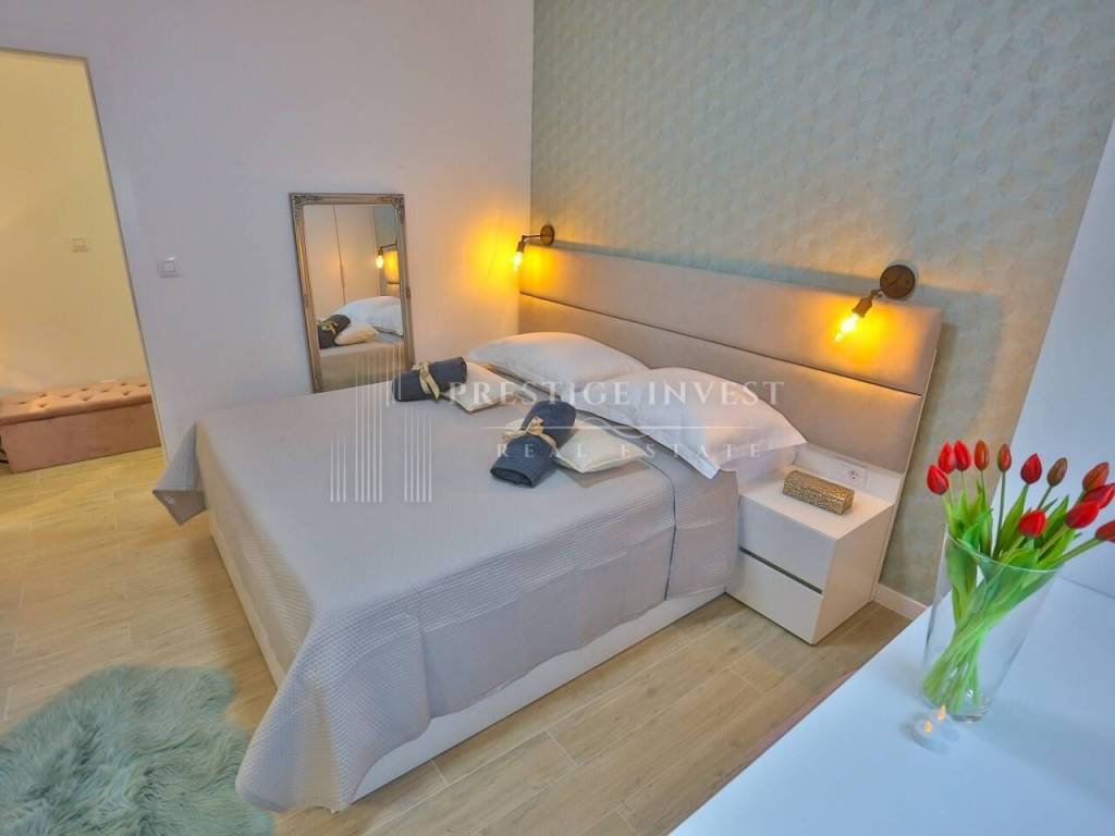 Na prvom katu je smješten dnevni prostor s velikom kuhinjom i blagovaonicom s izlazom na terasu s prekrasnim pogledom na more. Na drugom katu smještene su četiri spavaće sobe s vlastitim kupaonicama i svaka sa vlastitim pogledom na more. U svim sobama se nalazi klima i podno grijanje. Vila je opremljena dizajnerskim namještajem, rasvjetom i tepisima.