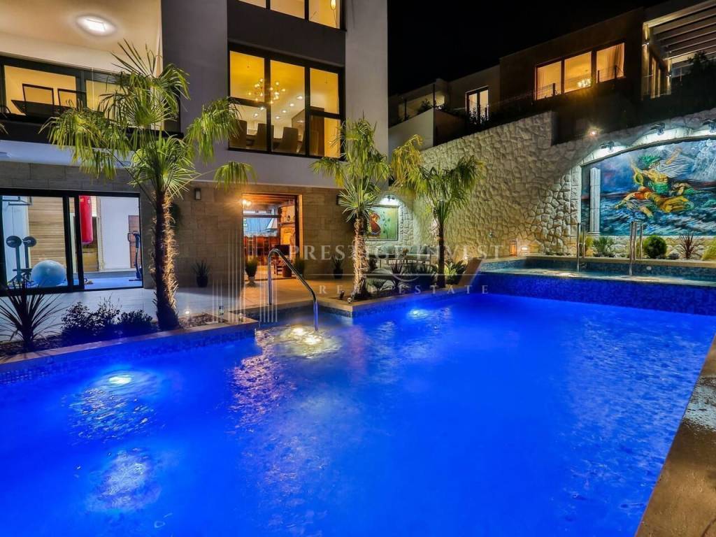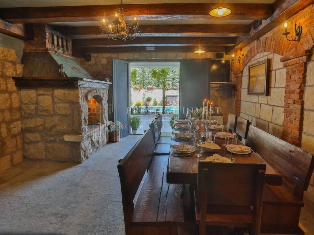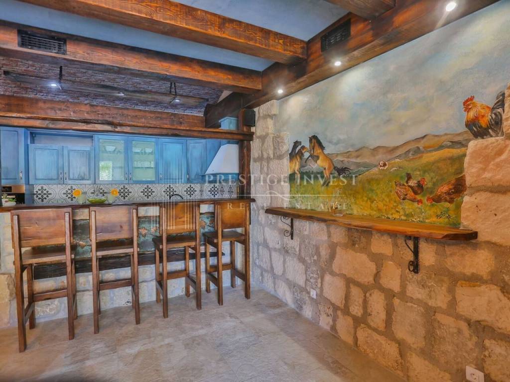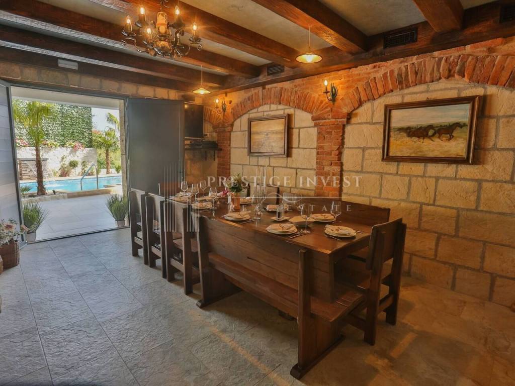 U prizemlju vile od 100 m2 se nalazi tradicionalna konoba uz saunu i teretanu te dodatna soba za multimediju i zabavu koje vode na prostranu terasu s bazenom(40m2) i vrtom s mediteranskim biljem i palmama te vanjskim roštiljem.