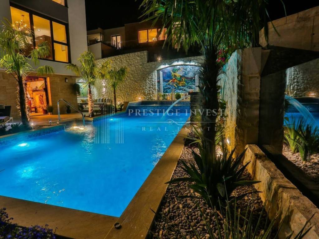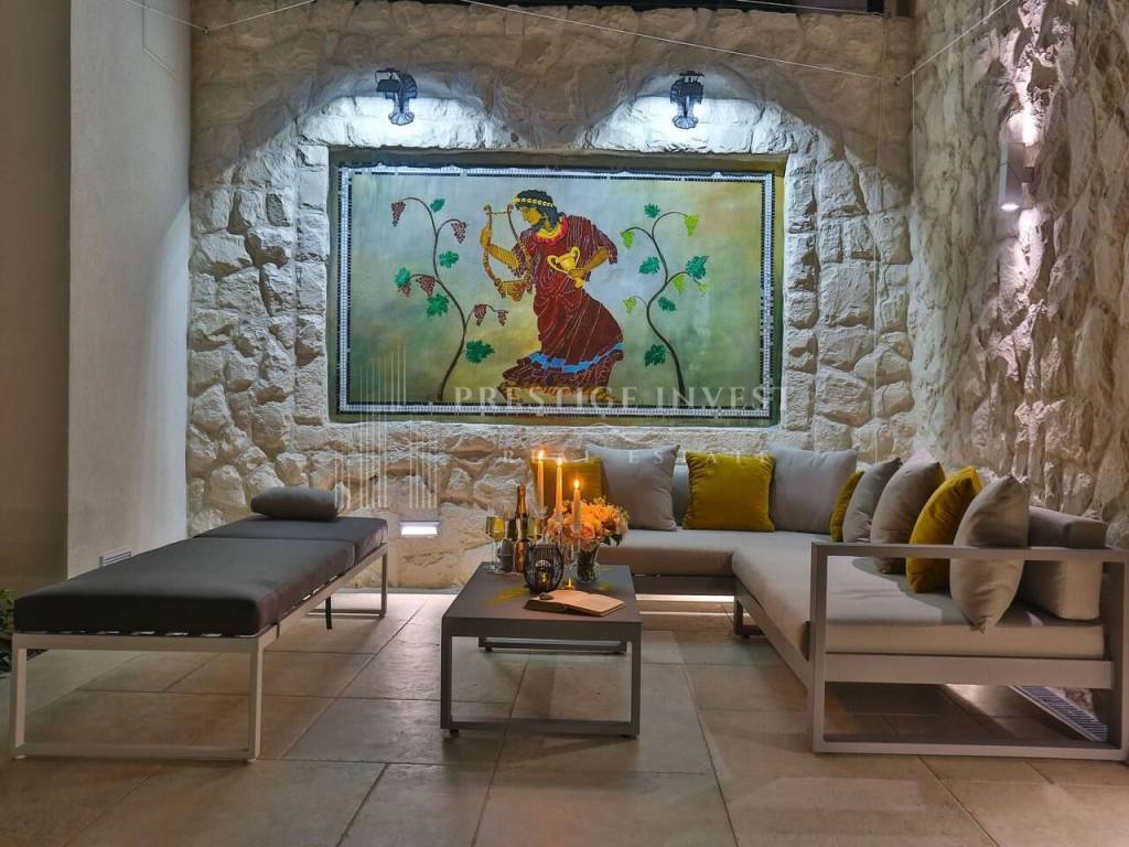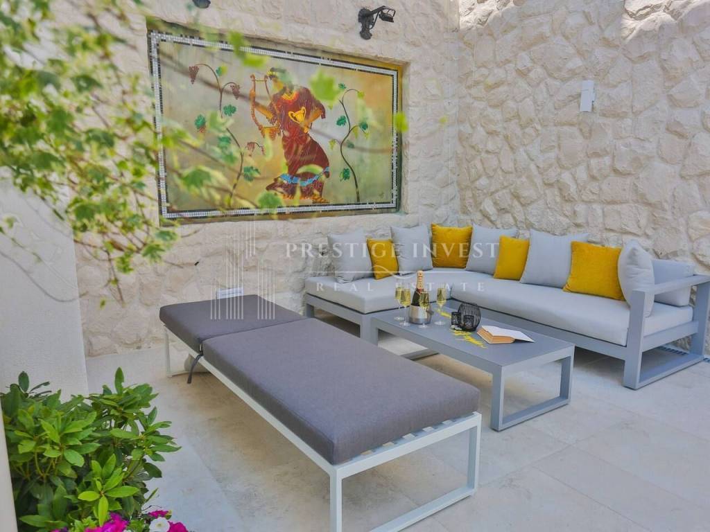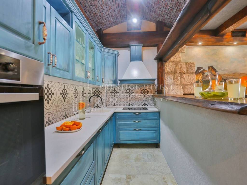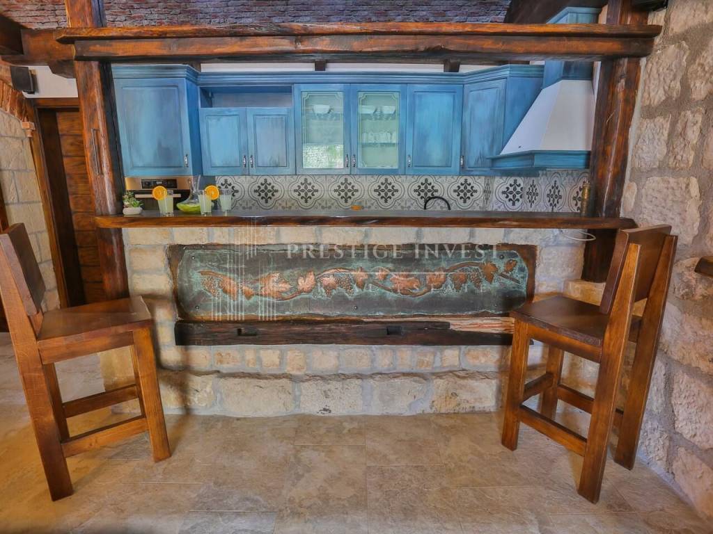 U prizemlju vile od 100 m2 se nalazi tradicionalna konoba uz saunu i teretanu te dodatna soba za multimediju i zabavu koje vode na prostranu terasu s bazenom(40m2) i vrtom s mediteranskim biljem i palmama te vanjskim roštiljem.