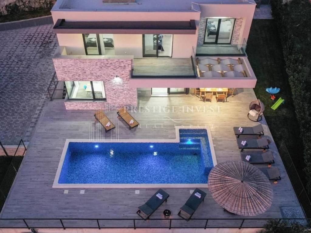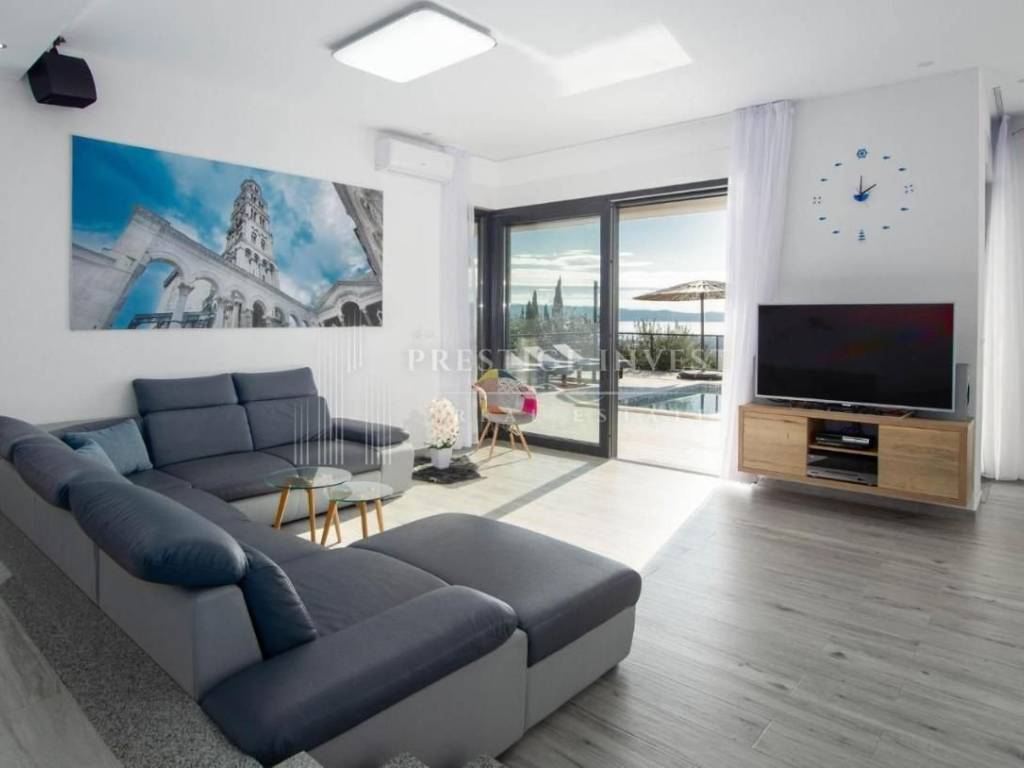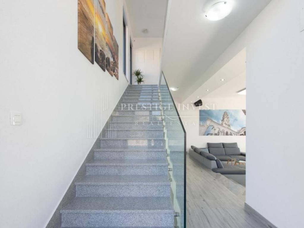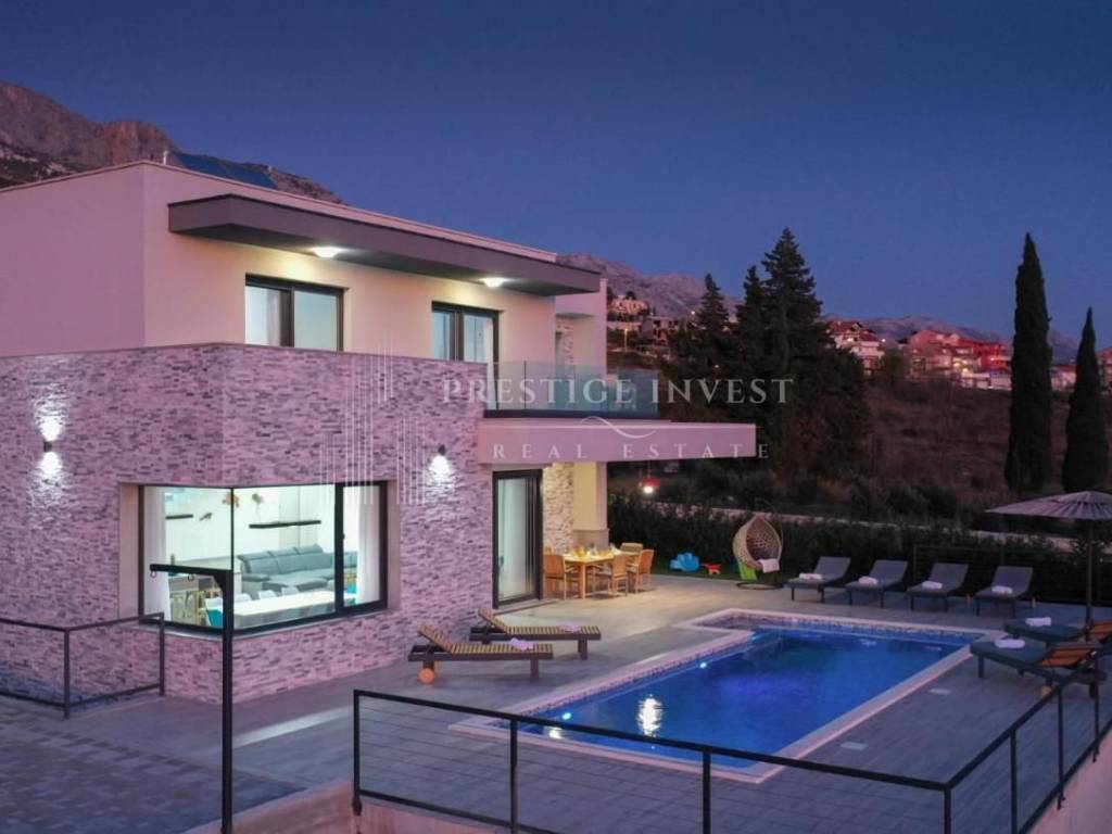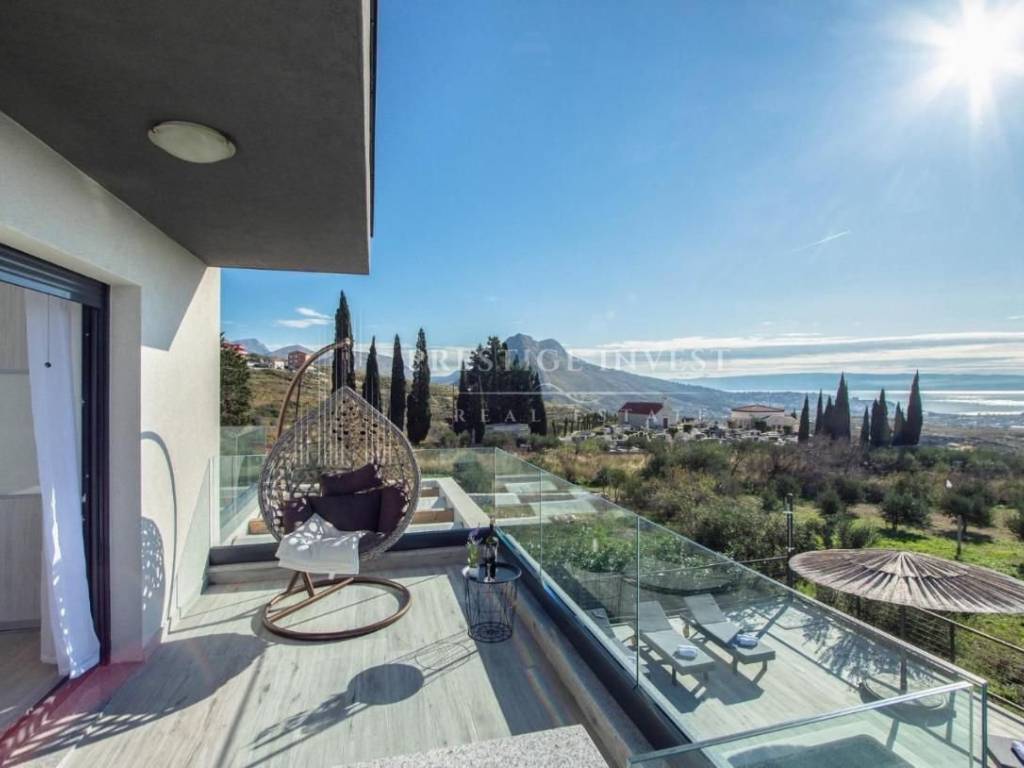 Posredujemo u prodaji luksuzne Vile s bazenom smještene u blizini Splita. Ova zapanjujuća nekretnina pruža prekrasan pogled na sami grad Split i okolicu. Vila se prostire na zemljištu površine 978m2, od kojih je 195m2 je stambenog prostora i 785 m2 vrta i okučnice s bazenom od 44m2. Vile se prostire na dvije etaže, prizemlje i prvi kat. Na prvom katu se nalazi dnevni boravak s blagovaonicom i izlazom na vrt s bazenom dok stepenice vode na gornju etažu sa sobama i kupaonicom.