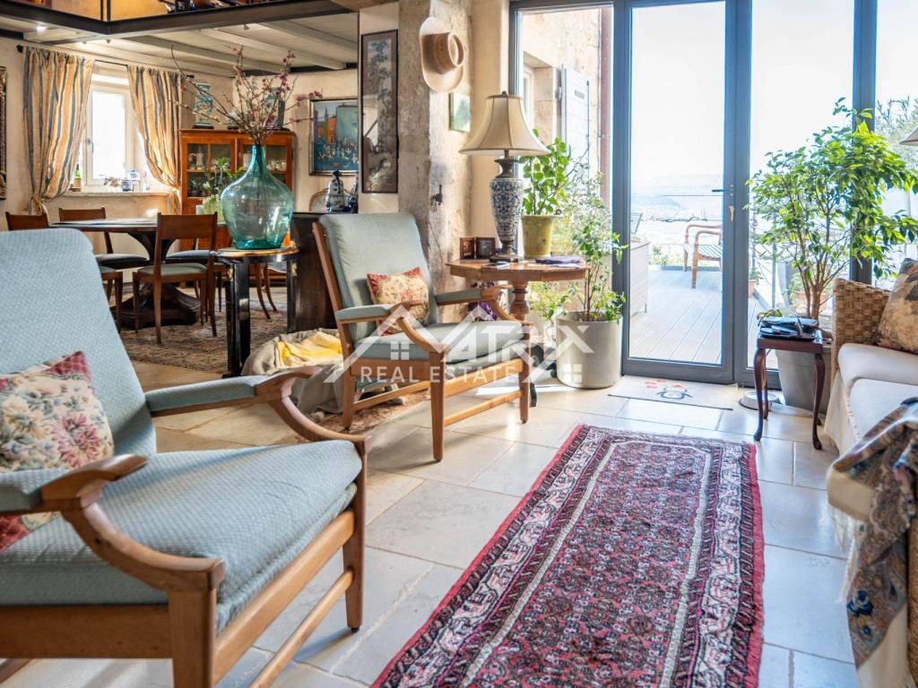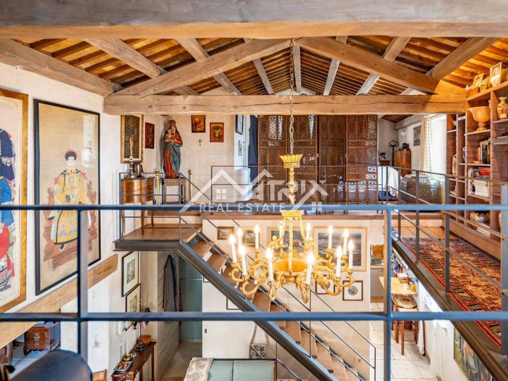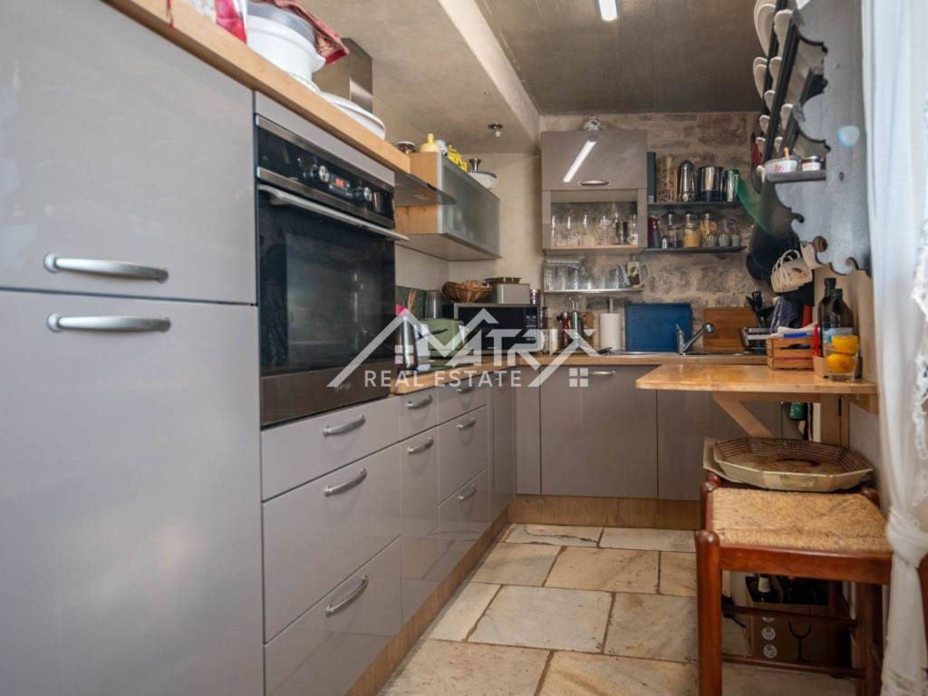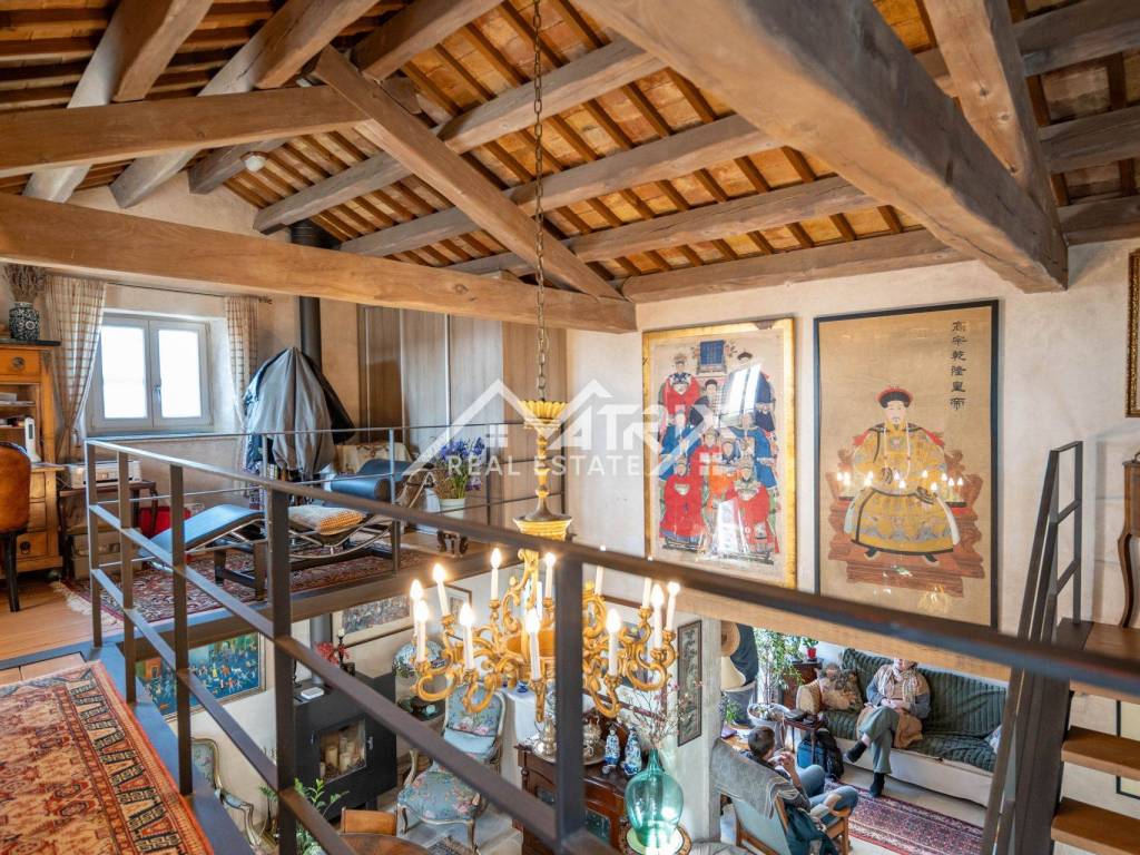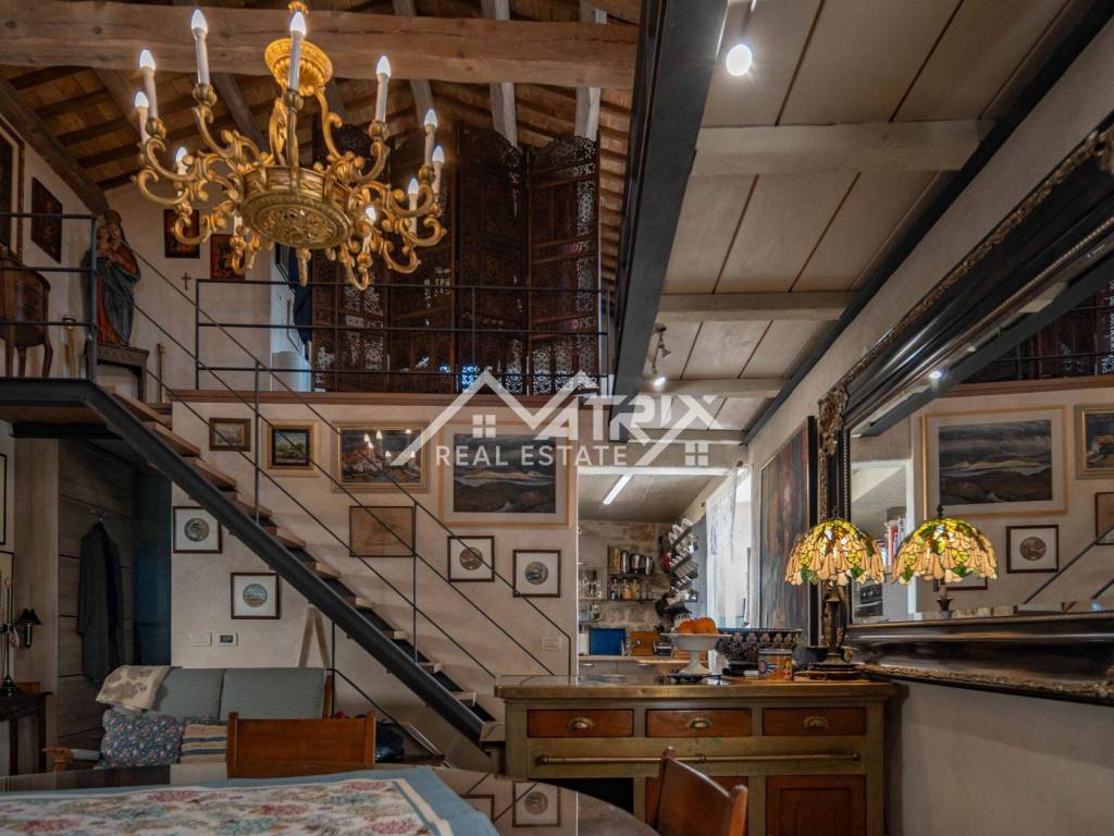 Prizemlje: Prostrani dnevni boravak s visokim stropovima, otvorenim drvenim gredama i velikim kaminom koji prostoru daje toplinu i karakter. Podovi su obloženi ručno obrađenim kamenom i masivnim drvom. Dnevni boravak povezan je s blagovaonicom i modernom kuhinjom, dok se velika staklena vrata otvaraju na terasu s panoramskim pogledom.