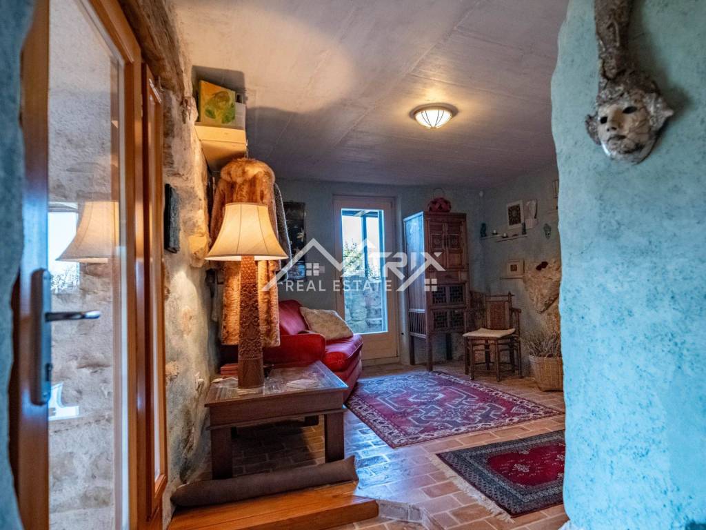 Kuća je građena od autentičnog istarskog kamena, pažljivo obnovljena kako bi zadržala svoj povijesni šarm, a istovremeno pružila suvremeni komfor. Krov prekriven terakota crijepom, drvene škure na prozorima i rustikalni detalji savršeno se stapaju s okolišem. Na dvorištu su sačuvani stari kameni zidovi koji su zaštićeni i dodatno naglašavaju šarm ovog posebnog imanja.