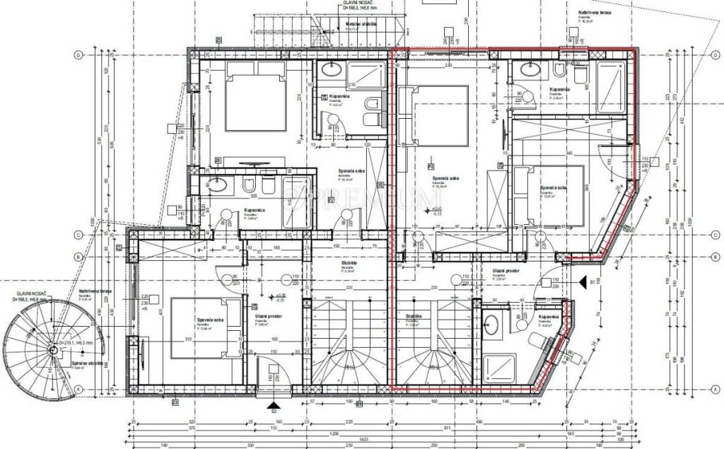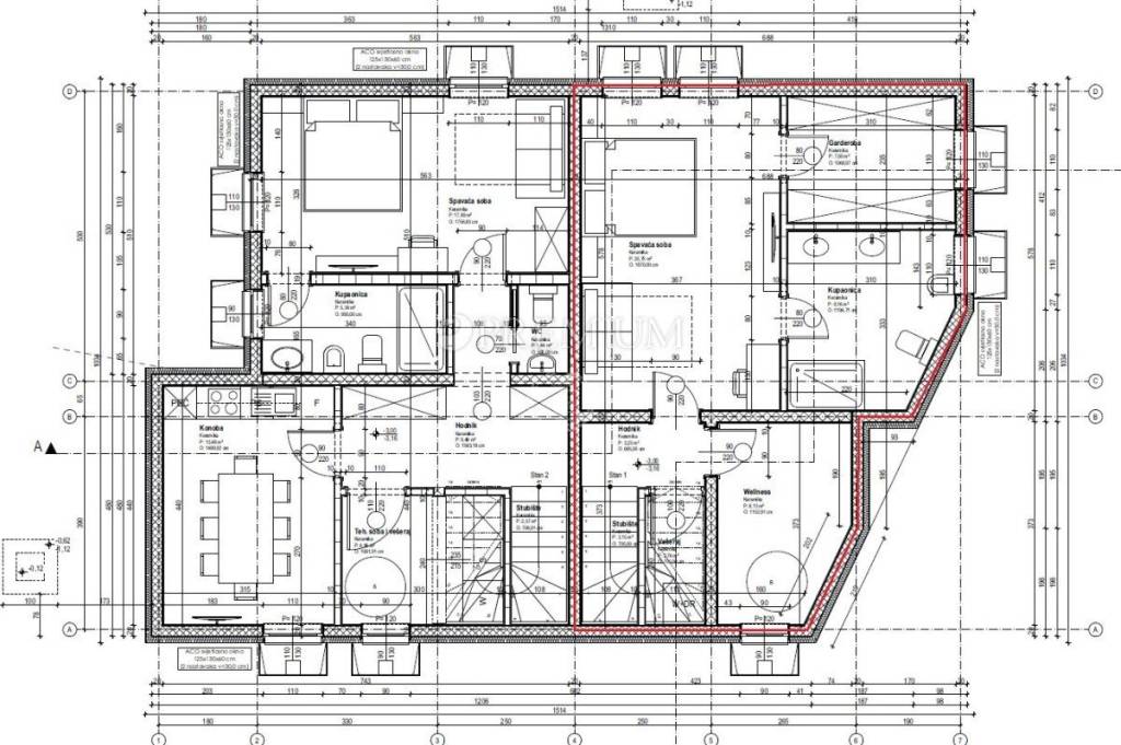 Kuća obuhvaća podrum, prizemlje i kat, ukupne neto površine 196 m2.