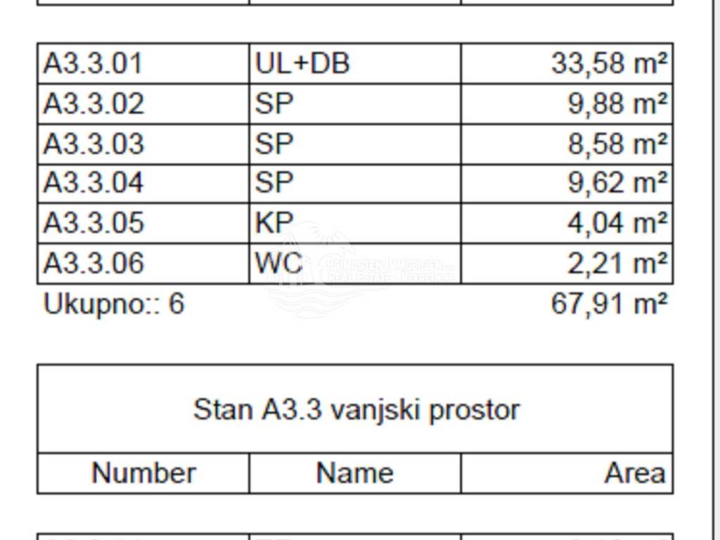 Stan je pažljivo projektiran kako bi pružio maksimalnu udobnost i funkcionalnost, a sastoji se od prostranog dnevnog boravka s kuhinjom i blagovaonicom, tri spavaće sobe, kupaonice, WC-a, hodnika te dvije terase koje omogućuju uživanje u vanjskom prostoru tijekom cijele godine. Sa terase se pruža prekrasan pogled na more. Stanu pripada jedno vanjsko parkirno mjesto. Planirani završetak gradnje je u proljeće 2027 godine.