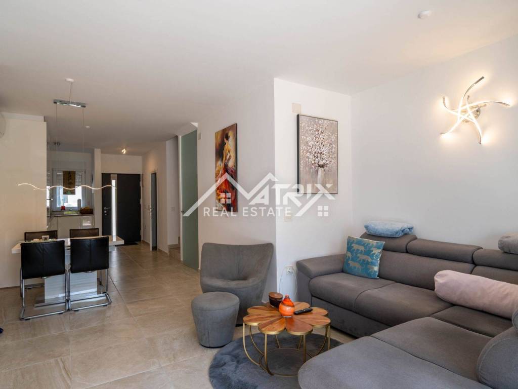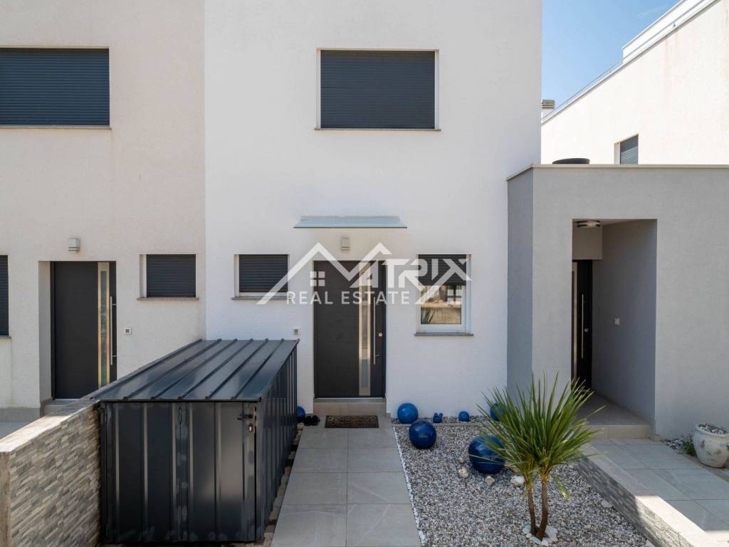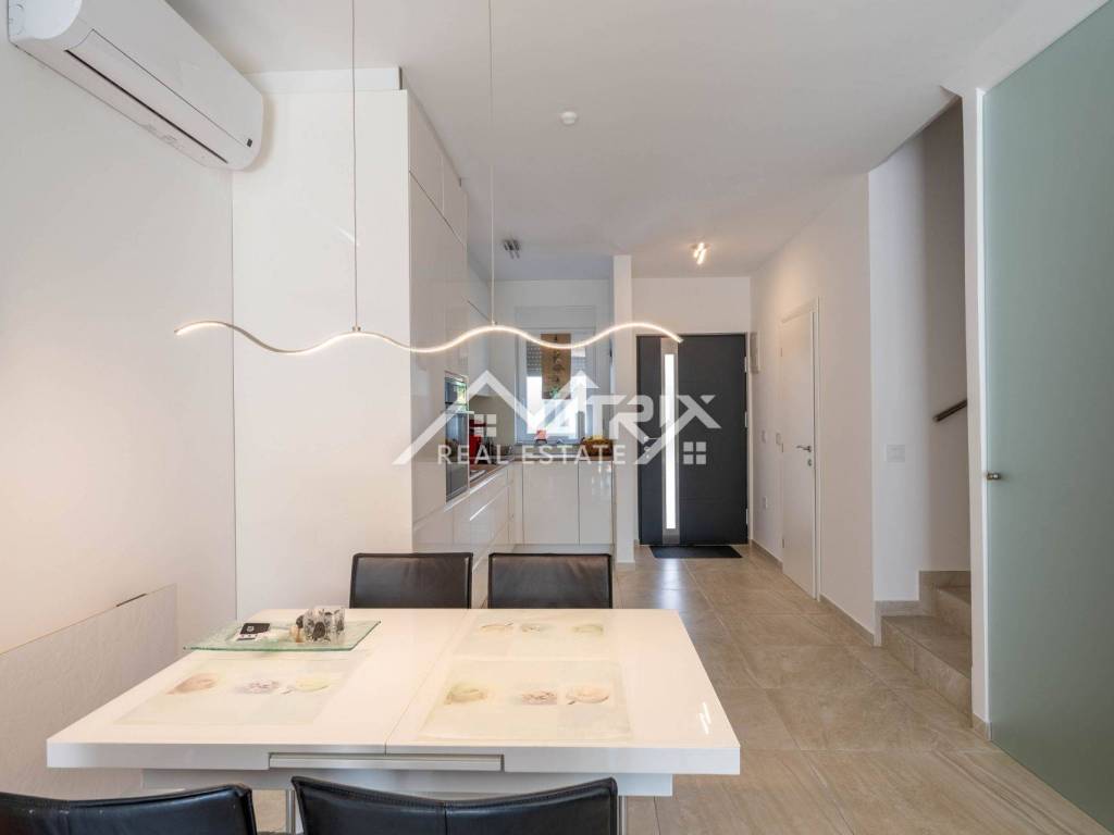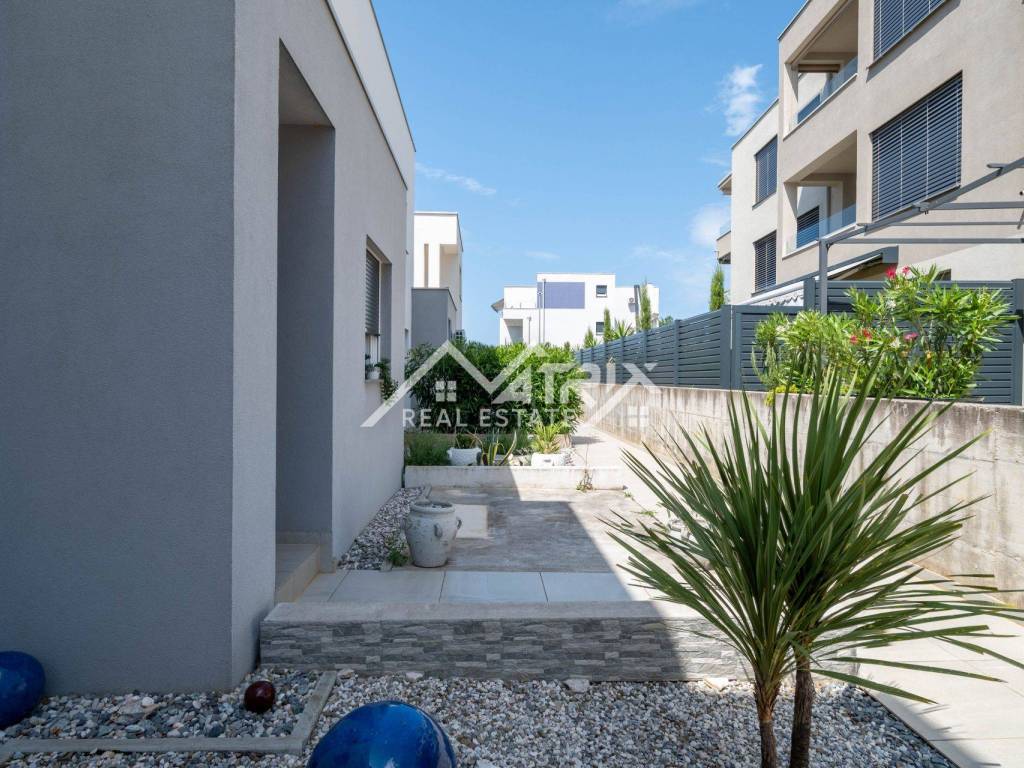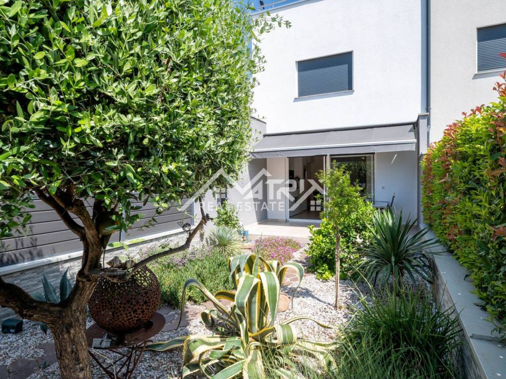 Nekretnina se sastoji od tri etaže. U prizemlju se nalazi ulazni prostor, gostinjski toalet, ostava, te lijepa kuhinja s blagovaonicom i dnevni boravak s izlazom na natkrivenu terasu. Terasa vodi u njegovano dvorište ispunjeno autohtonim mediteranskim biljem koje osigurava prirodnu privatnost i ugodnu atmosferu.