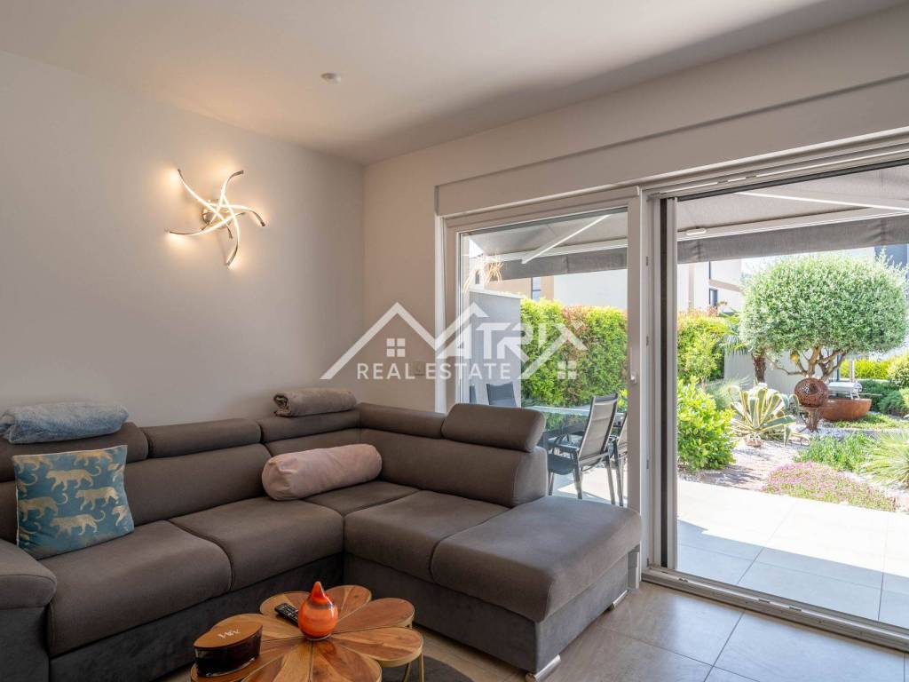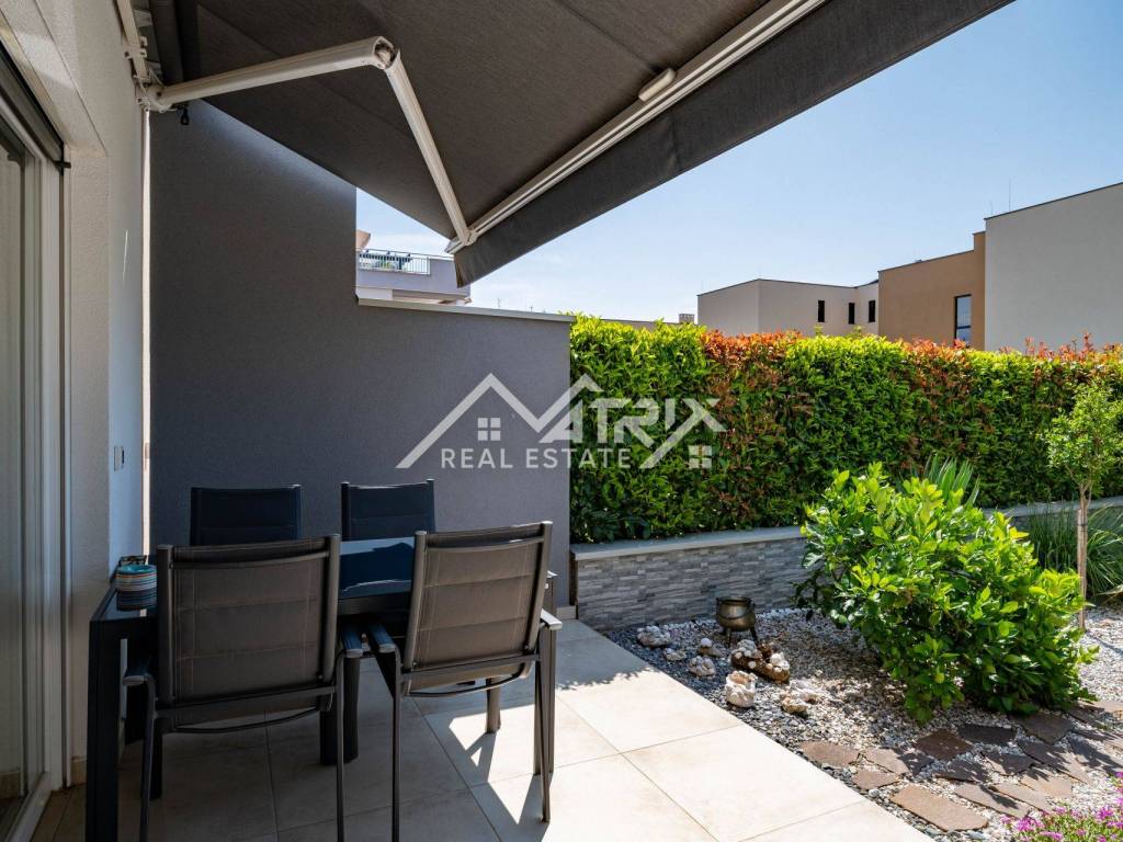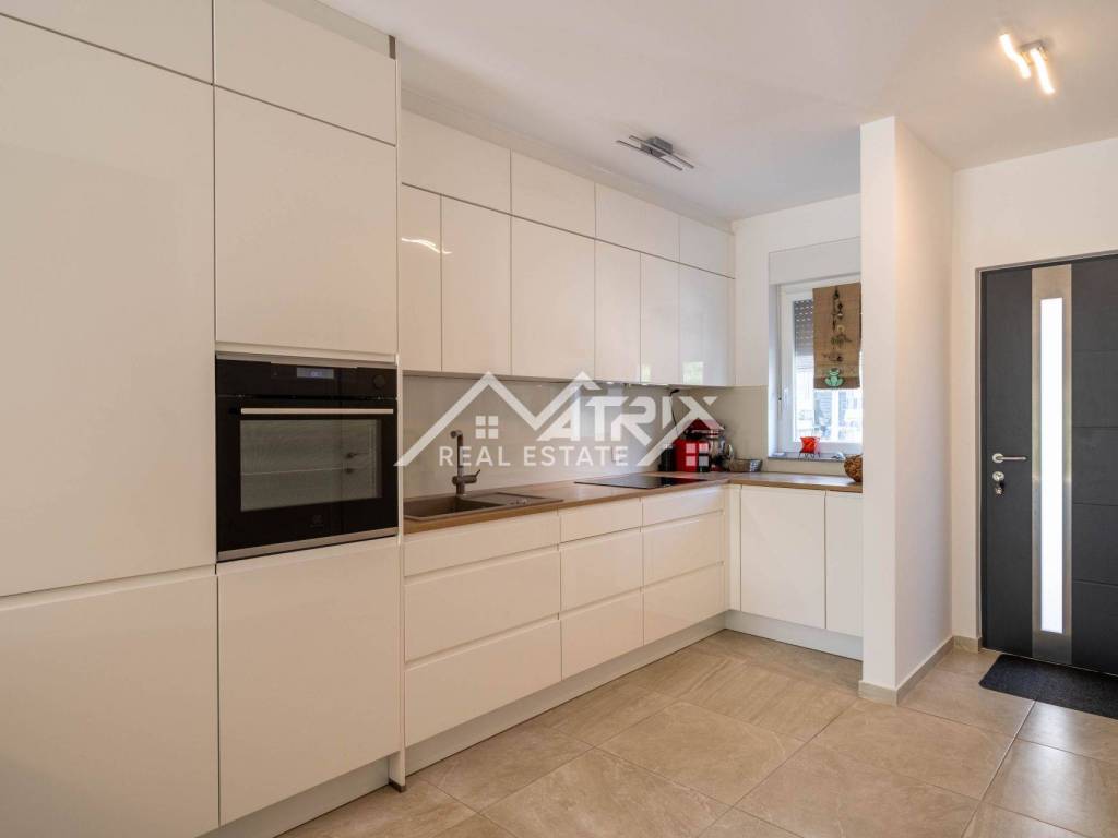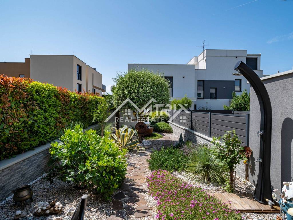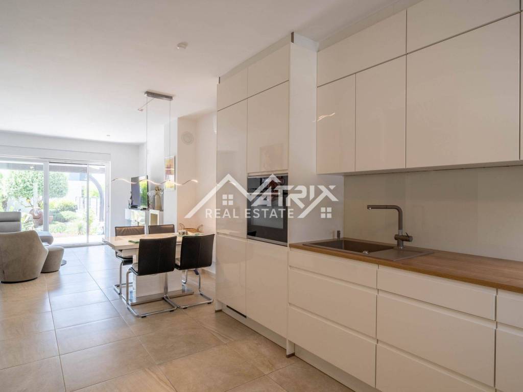 Nekretnina se sastoji od tri etaže. U prizemlju se nalazi ulazni prostor, gostinjski toalet, ostava, te lijepa kuhinja s blagovaonicom i dnevni boravak s izlazom na natkrivenu terasu. Terasa vodi u njegovano dvorište ispunjeno autohtonim mediteranskim biljem koje osigurava prirodnu privatnost i ugodnu atmosferu.