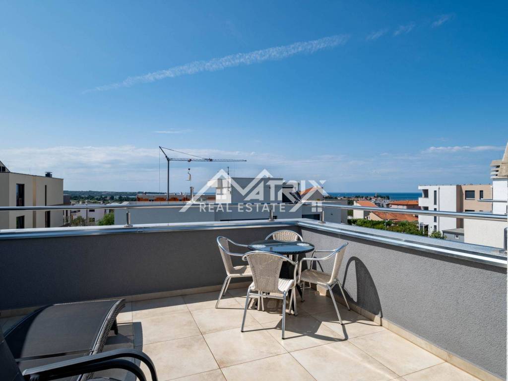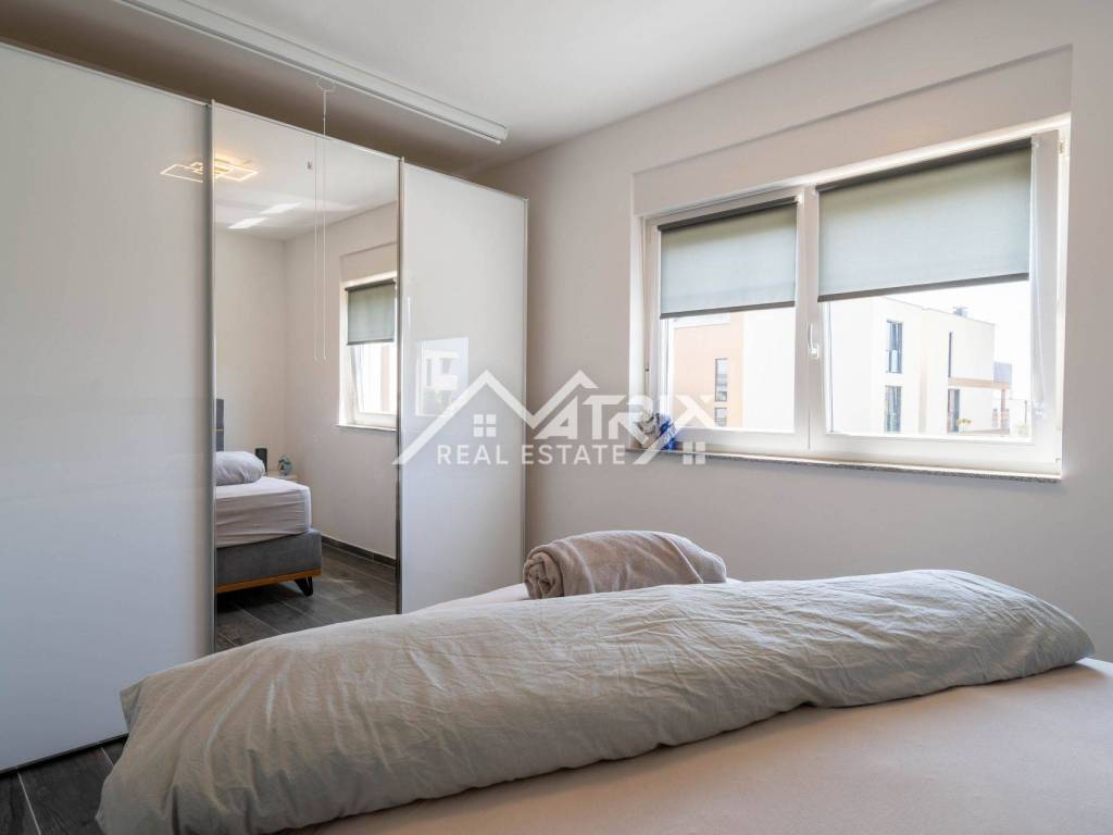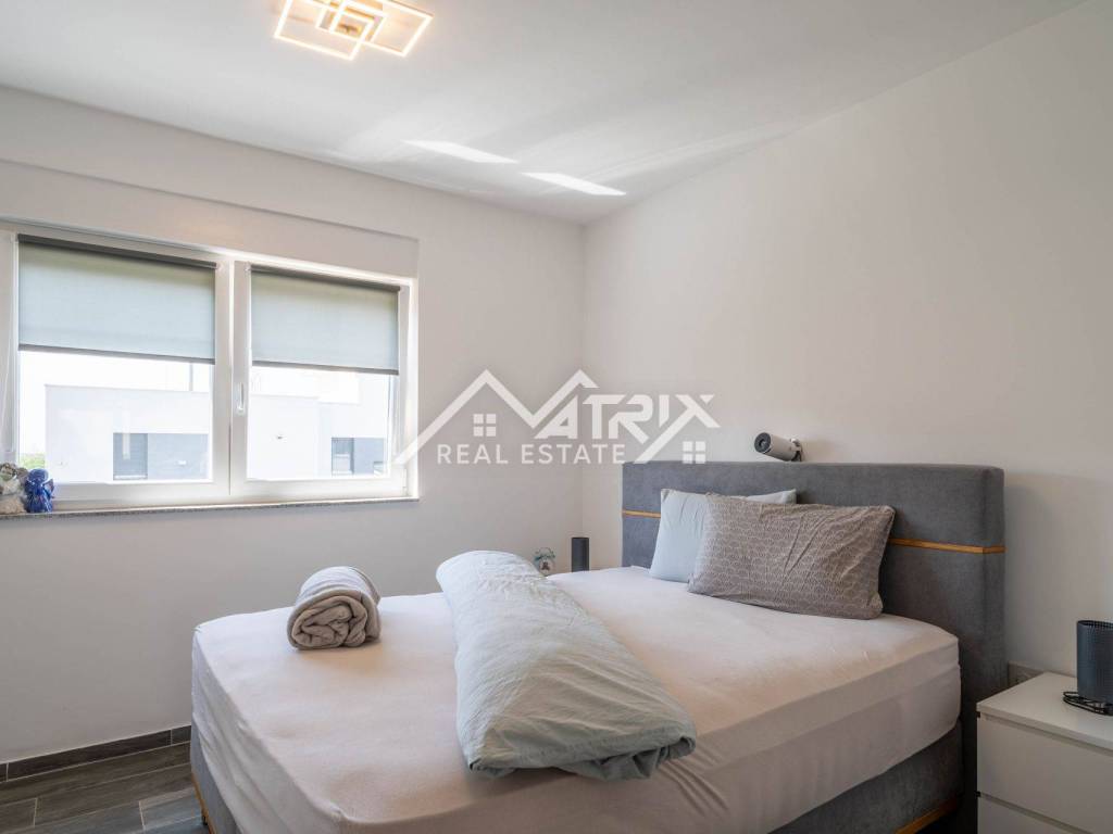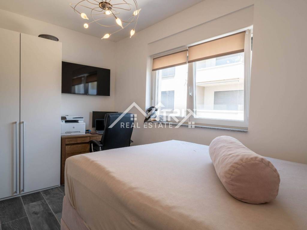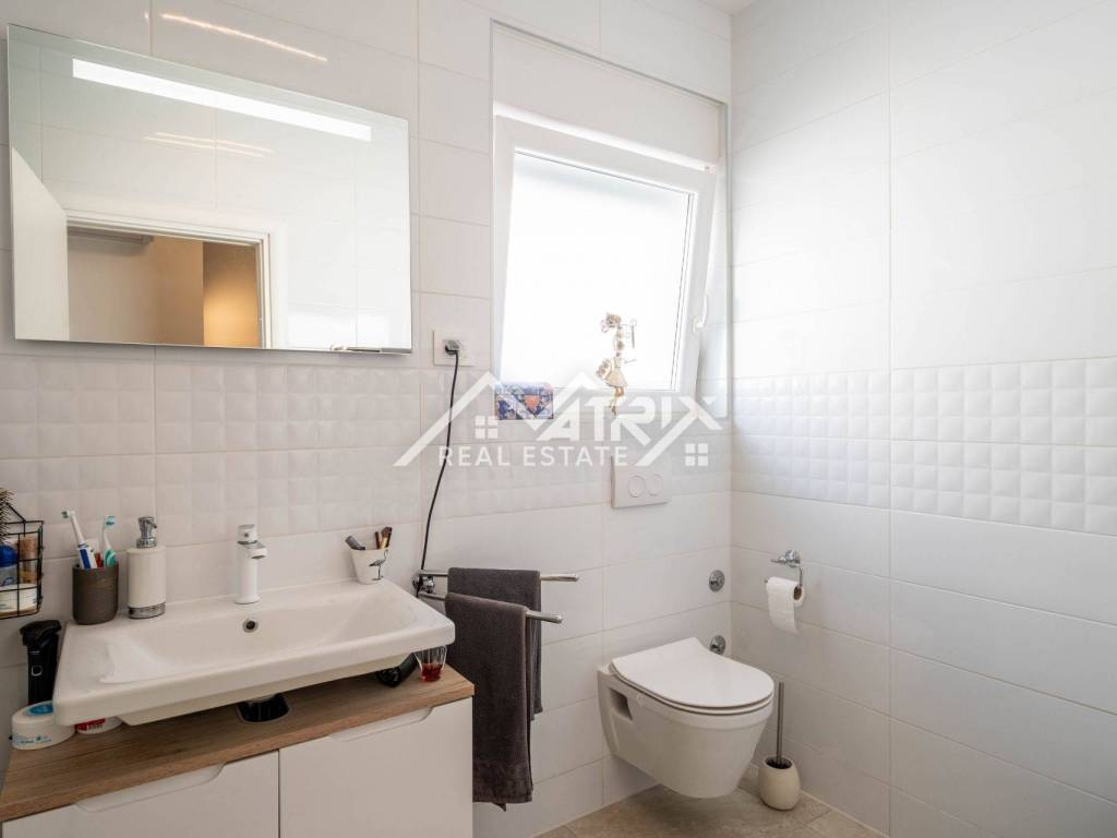 Na katu se nalaze dvije spavaće sobe i moderno uređena kupaonica. Unutarnjim stubištem dolazi se do krovne terase s koje se pruža panoramski pogled na more i grad.