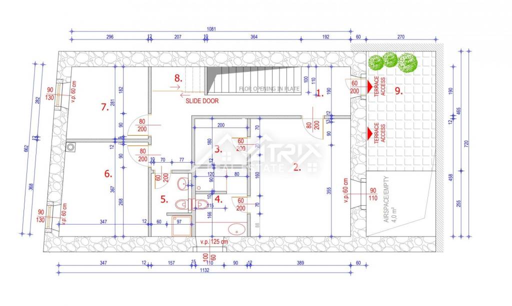 Kuća se prostire na približno 212 m² bruto površine, raspoređene na dvije etaže, uz dodatno dvorište površine 83 m² te privatno parkirno mjesto. Besplatan javni parking nalazi se neposredno preko puta kuće.