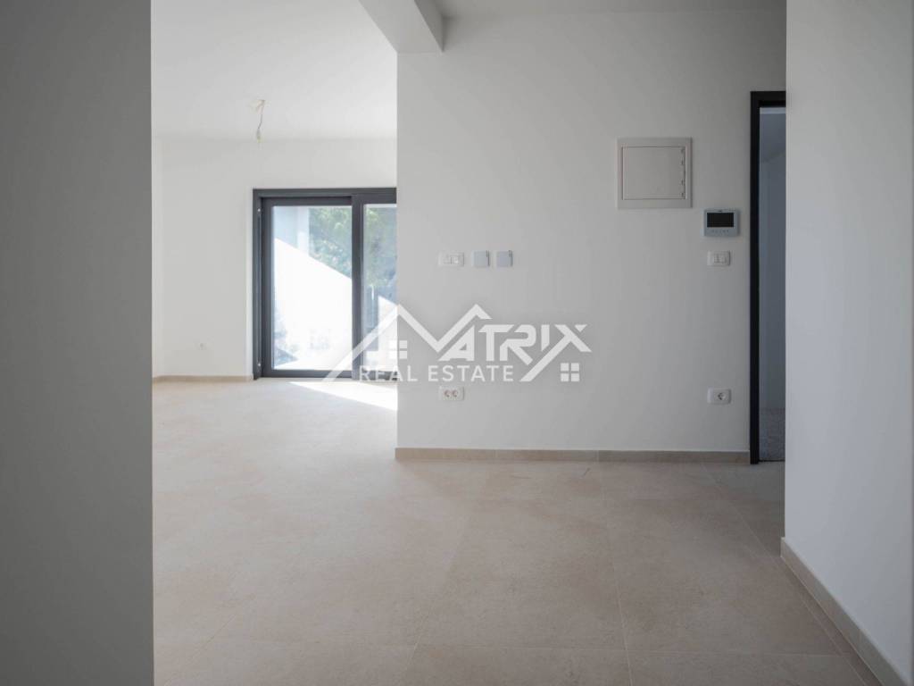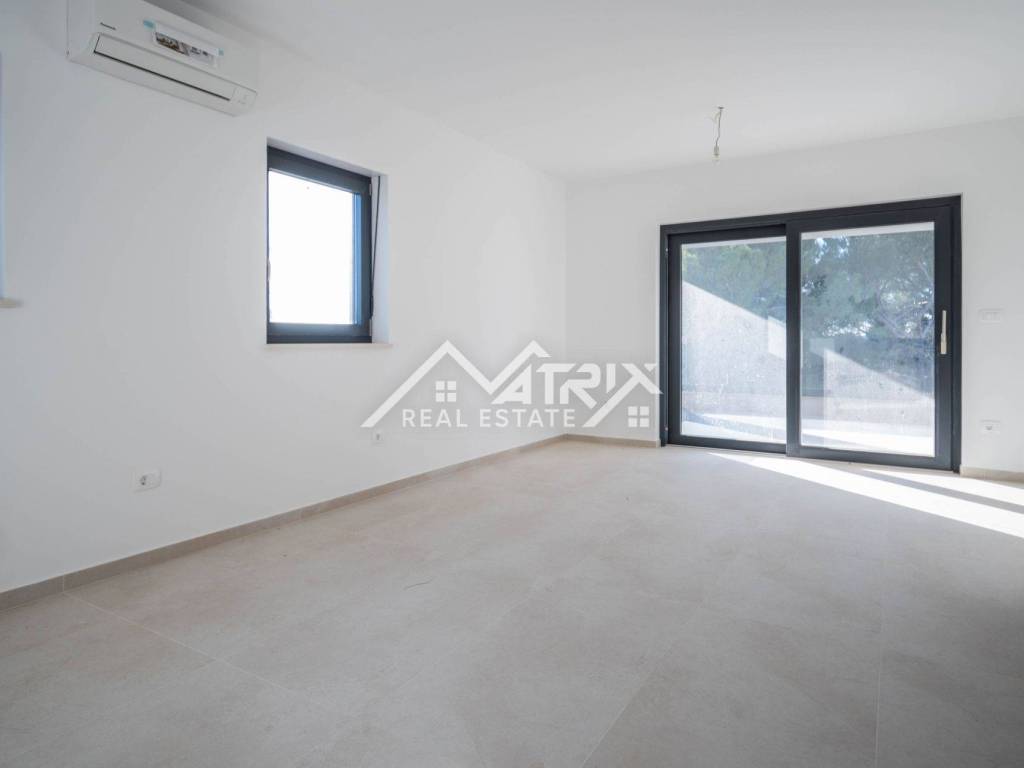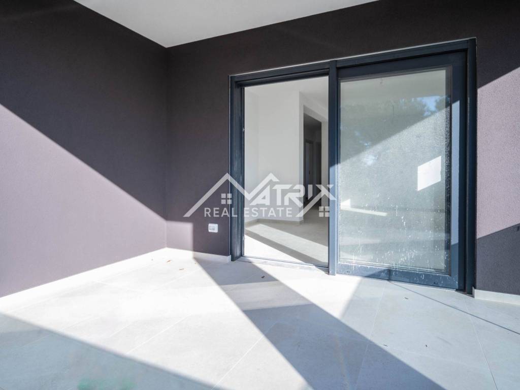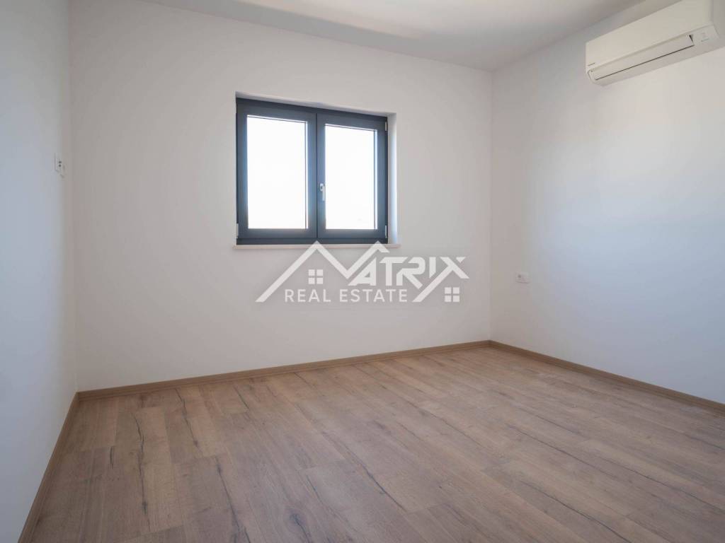 Stolarija je aluminijska u antracit boji s komarnicima, a ukupna izvedba i završna obrada stanova visoke je kvalitete. Uz stan dolazi jedno garažno mjesto i jedno vanjsko parkirno mjesto, što je rijetkost u blizini mora.