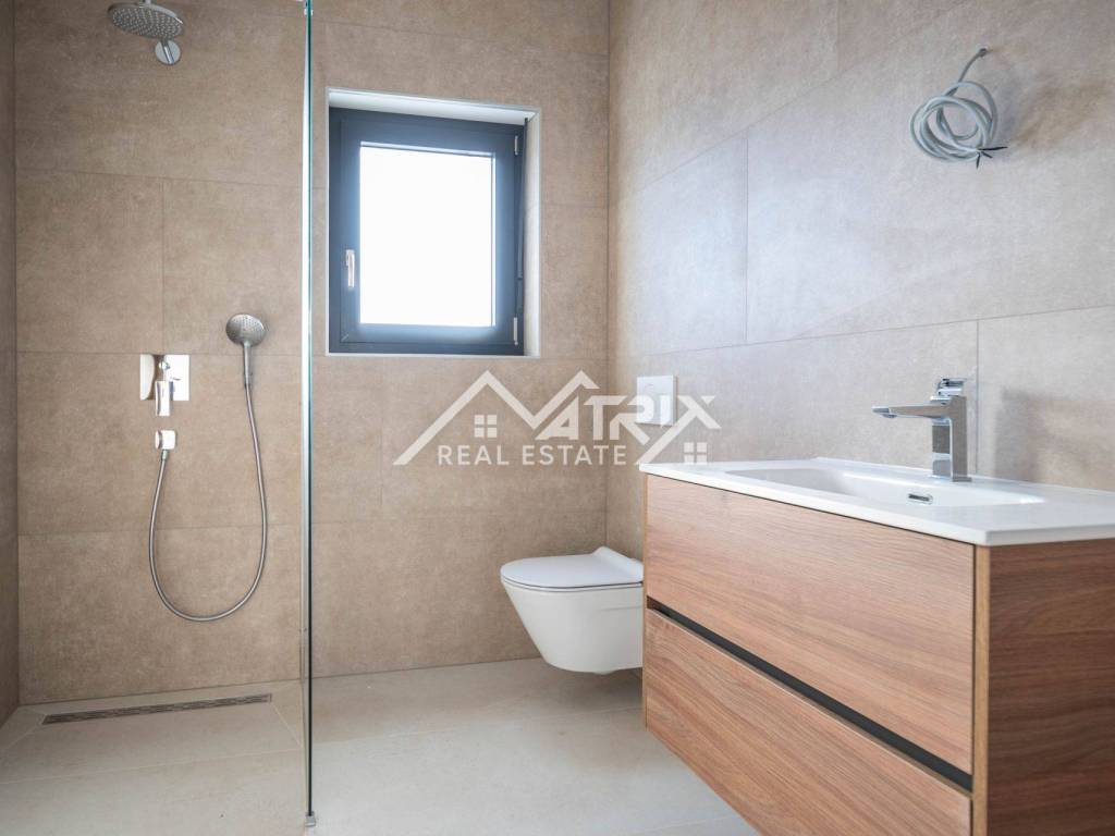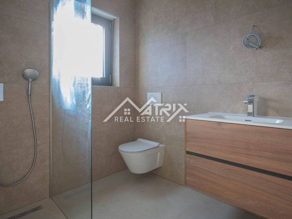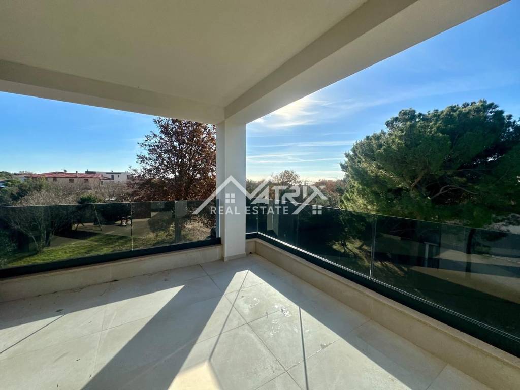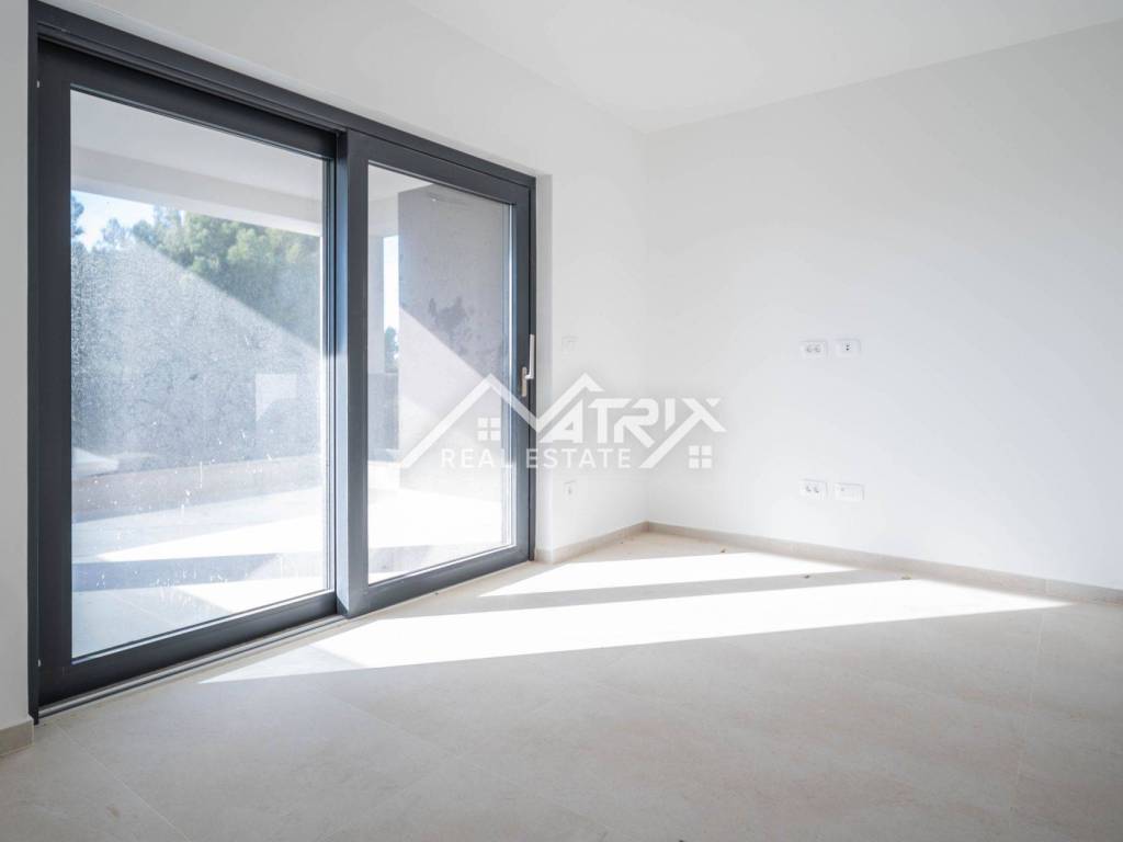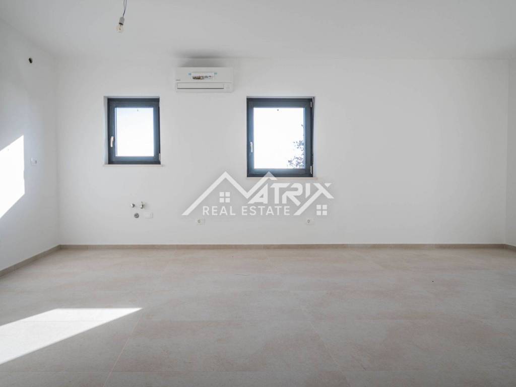 Stolarija je aluminijska u antracit boji s komarnicima, a ukupna izvedba i završna obrada stanova visoke je kvalitete. Uz stan dolazi jedno garažno mjesto i jedno vanjsko parkirno mjesto, što je rijetkost u blizini mora.
