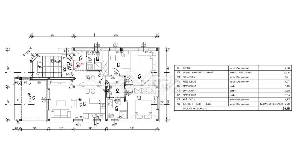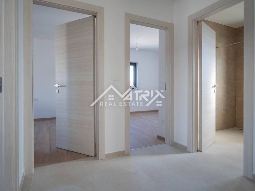Stan se sastoji od dnevnog boravka povezanog s kuhinjom i blagovaonicom, tri spavaće sobe, dvije kupaonice, hodnika i terase s djelomičnim pogledom na more – idealne za jutarnju kavu ili večernje opuštanje.