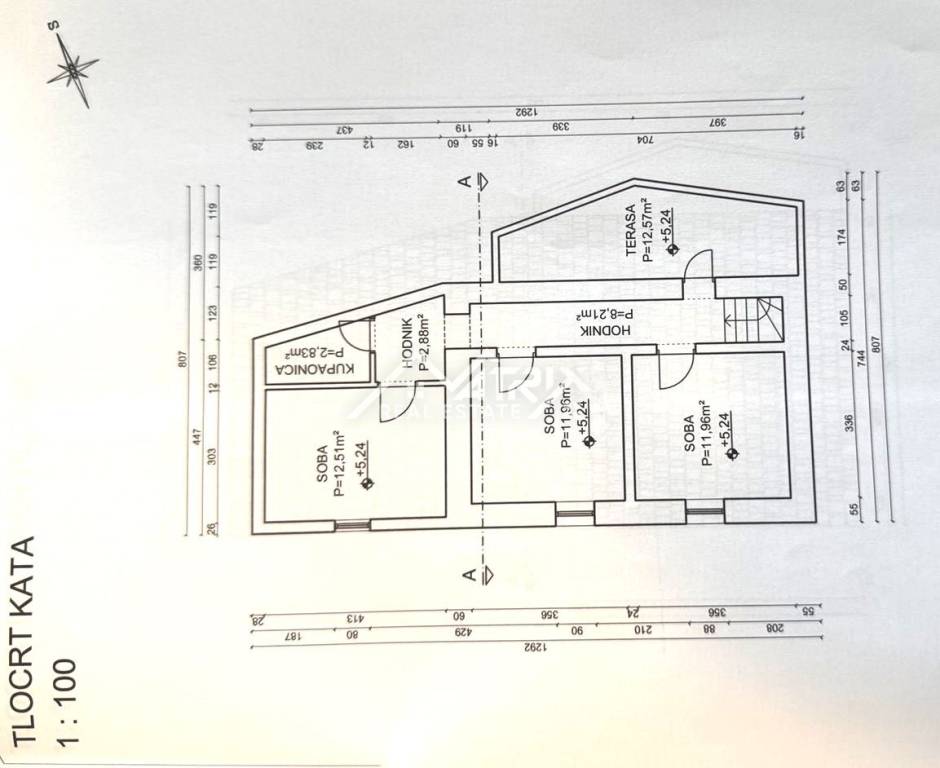 Unutarnjim stepenicama vodi se na drugi kat gdje su tri spavaće sobe, kupaonica, hodnik i još jedna terasa.
