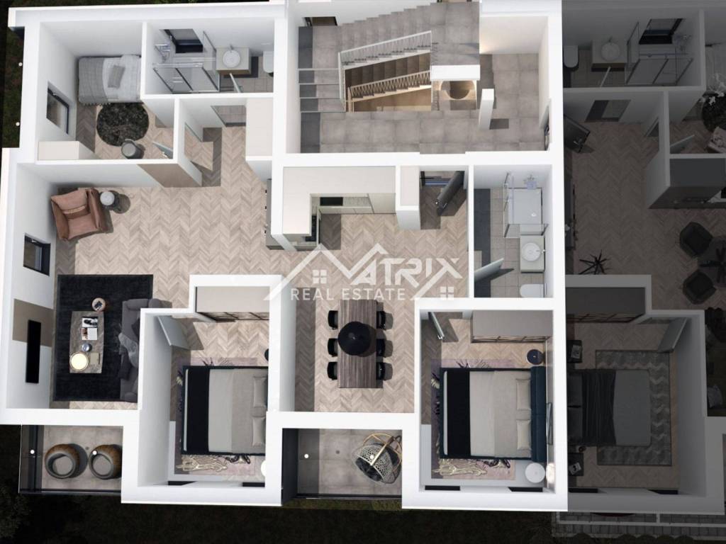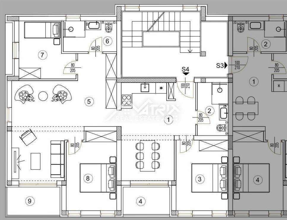 Stan je jednoetažni. Stan se sastoji od ulaznog hodnika, kuhinje i blagovaonice iz koje se izlazi na loggiu smještenu na južnoj strani, prostranog dnevnog boravka koji ima izlaz na natkrivenu terasu, također smještenu na južnoj strani zgrade, što garantira obilje prirodne sunčeve svjetlosti kroz cijeli dan. Stan još ima i tri prostrane spavaće sobe i dvije kupaonice. Stanu pripadaju dva parkirna mjesta u sklopu okućnice zgrade.