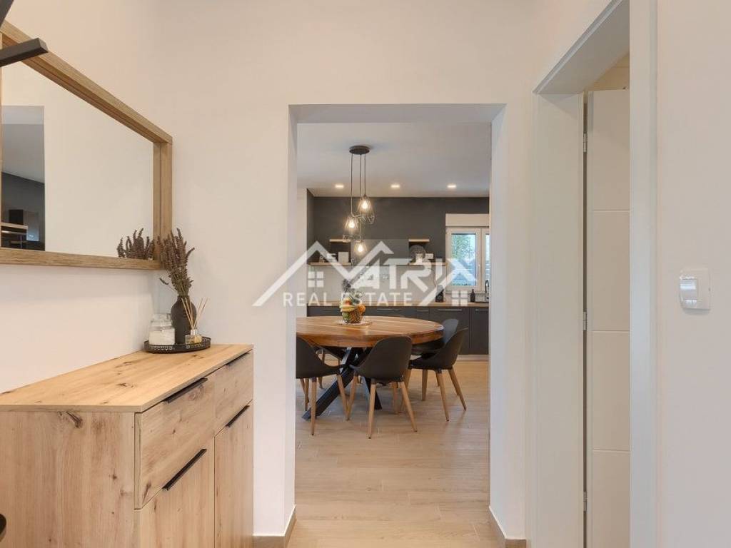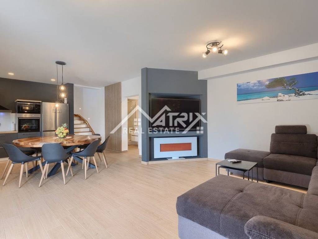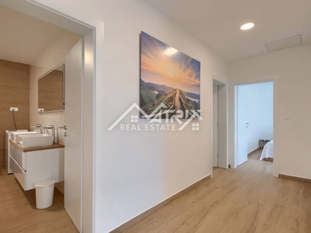 U prizemlju se nalazi prekrasan dnevni boravak uređen u open-space konceptu, povezan s modernom kuhinjom i blagovaonicom. Velike staklene stijene omogućuju obilje prirodnog svjetla te vode na terasu s bazenom. U prizemlju je smještena i jedna elegantna kupaonica. Unutarnjim stepenicama dolazi se na prvi kat, na kojem se nalaze četiri moderne spavaće sobe, od kojih dvije imaju izlaz na balkon s prekrasnim pogledom na okolinu. Na ovom katu nalaze se i dvije prostrane kupaonice.