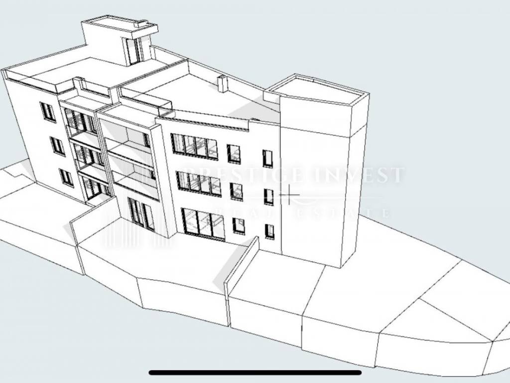 Na prvom katu, sjeverne orijentacije smješten je trosoban stan, s jednom kupaonicom i jednim wc. Dnevni boravak i kuhinja su koncipirani u open space prostor s izlazom na vanjsku lođu s koje se pruža pogled na more.