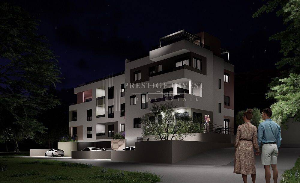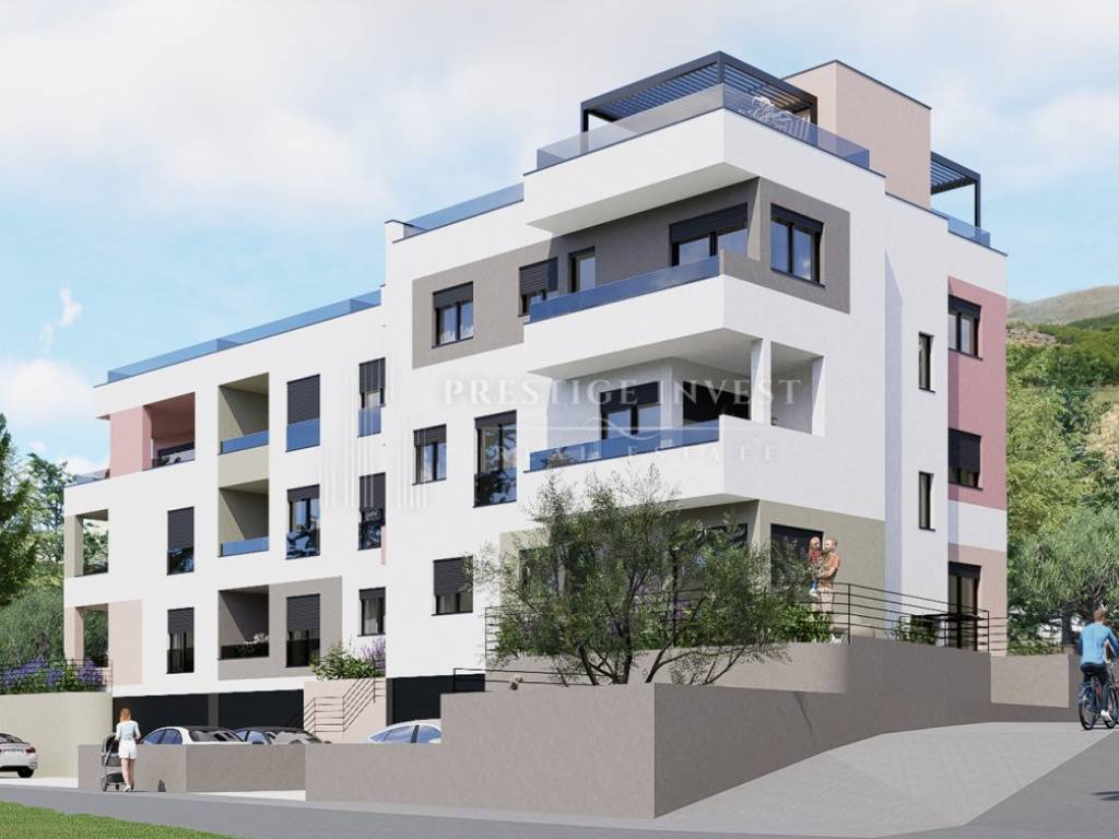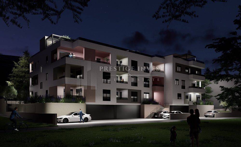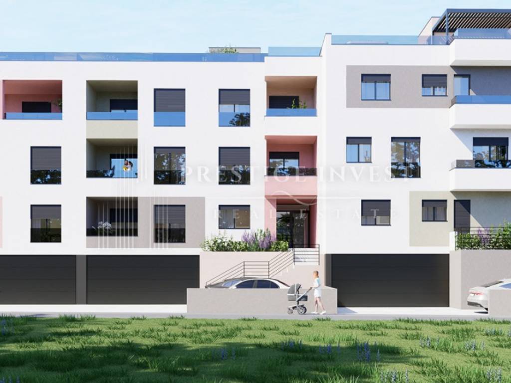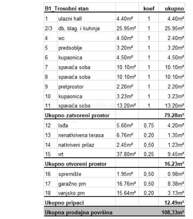 Ovaj stan B1 smješten je u visokom prizemlju zgrade s tri spavaće sobe, dvije kupaonice, 1 wc, spremište, hodnik, vanjska terasa