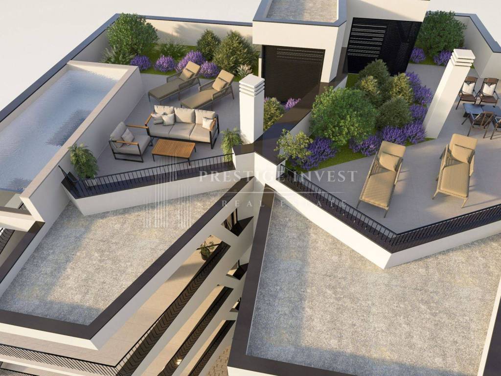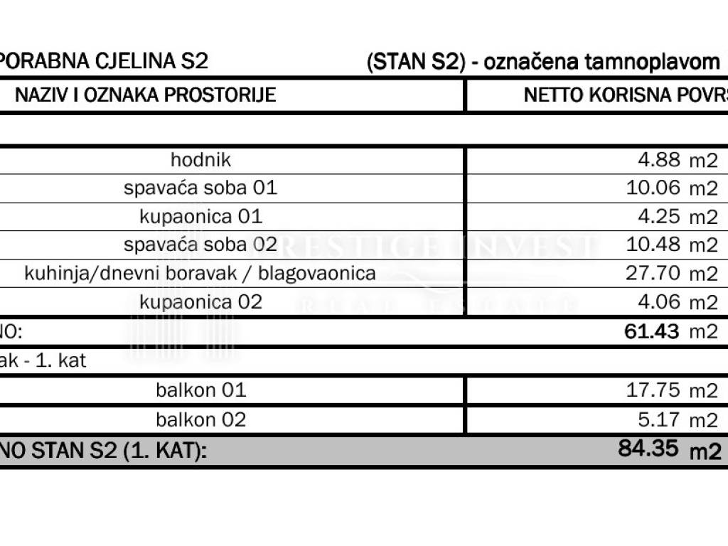 Stan se sastoji od dvije spavaće sobe od kojih jedna ima balkon, dvije prostrane kupaonice, otvorene kuhinje s dnevnim boravkom i blagovaonicom.