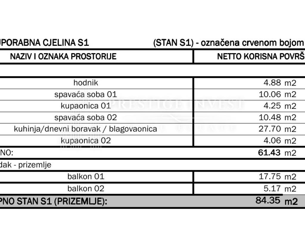 Stan se sastoji od dvije spavaće sobe od kojih jedna ima balkon, dvije prostrane kupaonice, otvorene kuhinje s dnevnim boravkom i blagovaonicom.