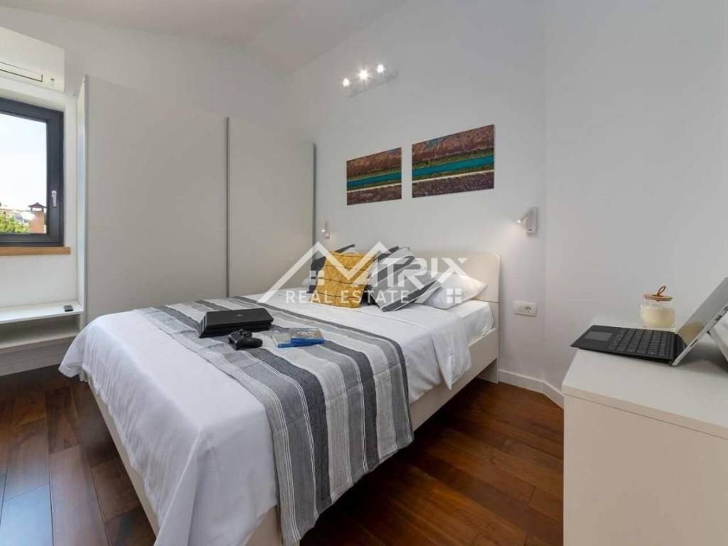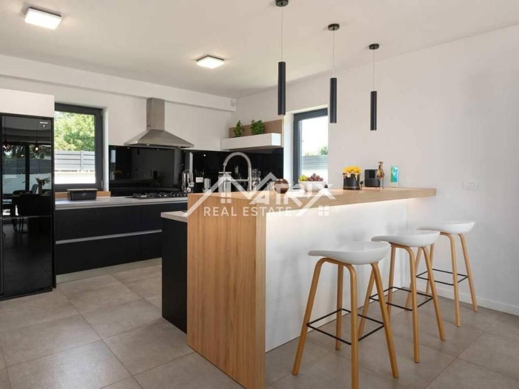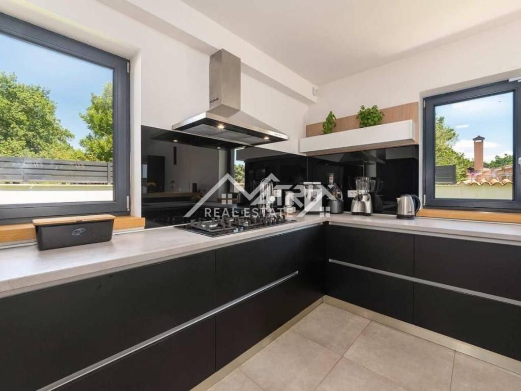 Dobro došli u ovu prekrasnu moderno opremljenu vilu s bazenom, smještenu u mirnom naselju nadomak grada Poreča i prekrasnih plaža Jadranskog mora. Vila se prodaje potpuno namještena i moderno opremljena luksuznim i kvalitetnim namještajem i opremom.