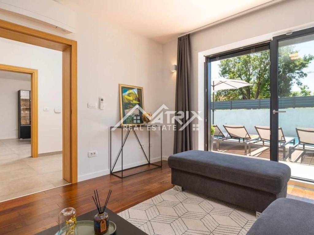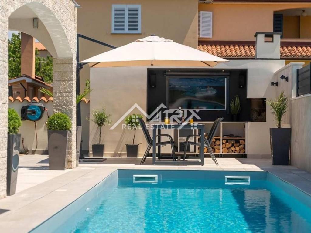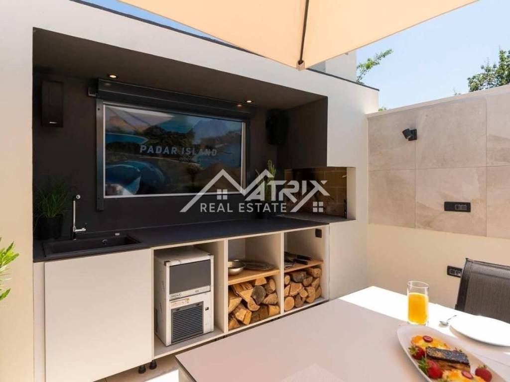 Prostrani bazen dimenzija 12,2 m * 3 m, s slanom vodom, ozonom i automatskim dozatorom pH vrijednosti, predstavlja središnju atrakciju prostrane ograđene okućnice. Uz to, vanjska kuhinja je vrhunski opremljena s ledomatom, zvučnicima, televizorom, kaminom i svim potrebnim sadržajima za potpuno uživanje tijekom ljetnih mjeseci. U sklopu okućnice nalazi se i vanjski WC za goste, parkirna mjesta za dva vozila te uređena travnata površina s navodnjavanjem.